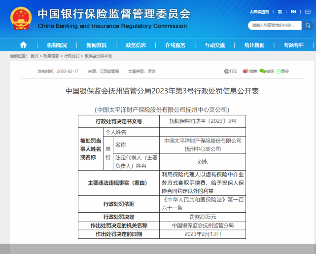 北京商报讯(记者 陈婷婷 胡永新)2月17日,江西银保监局抚州银保监分局发布行政处罚信息体现,中国平静洋产业保险股份有限公司抚州中心支公司因使用保险署理人以假造保险中介业务方式套取手续费、给予投保人保险条约约定以外的优点,被罚款23万元。邹清文、许萄对该公司上述违法活动负直接责任,分别被告诫,邹清文被罚款3万元,许萄被罚款1万元。 图片泉源:江西银保监局 |
