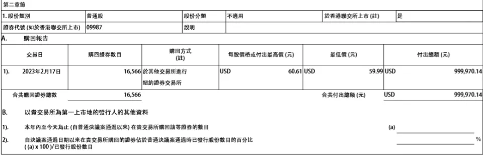 百胜中国2月19日公告,公司于2月17日以100万美元回购1.65万股公司股份。 |
