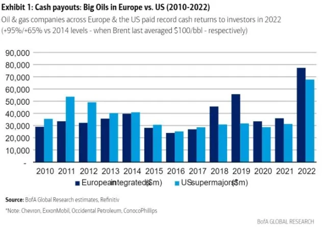 原油巨头甘心向股东派发现金也不愿睁开资源投资,而这大概也变相地增长了美股的谋利潮。 本年以来,美股出现了一波狂热的谋利潮——“散户生意业务股”卷土重来,总成交量乃至高于2021年的散户抱团高潮。英国股票记者Bryce Elder指出,有许多的迹象表明这一高潮大概与客岁赚得盆满钵满的原油公司向股东返还回报有关。 起首,美国银行的图表表现,2022年西欧石油公司给予股东创纪录的现金回报,而欧洲现金返还险些是2014年的两倍,其时的油价更高。 值得注意的是,在2014年履历了布伦特原油代价从每桶100美元以上跌至30美元以下之后,石油公司为了服从其时的股息政策,资产负债表遭到了粉碎。 而这一次,有相当一部分股东得到的回报是以股份回购的方式实现的,如欧洲市场40%的回报来自一次性回购(2014年约为5%): 其次,自2022年1月尾以来,壳牌的股价上涨了30%以上,已经回购了近10%的股份;英国石油(BP)的环境雷同,股价上涨46%,回购了约8%的股份。 再者,股东们也乐见于此。美国银行最新的举世基金司理观察表现,投资者对股票回购的爱好到达了五年来的最高水平。 在如许大规模的现金回馈下,Bryce Elder表现,有来由以为一些得到了石油公司现金回馈的投资者,将此中的一部分现金重新投入进了美股的谋利中。 但另一方面,随着石油公司倾向派发现金,石油项目标资源付出只能萎缩,这将导致燃料代价的长期供给不敷。 上月,航空燃油代价就因短缺而从100美元飙升至近250美元。高隆重宗商品团队指出,是“投资不敷、页岩气限定以及OPEC的规律确保了供应无法满足需求”,这种不敷并非是短暂的: 缓解是暂时的,投资不敷是永世性的。 |