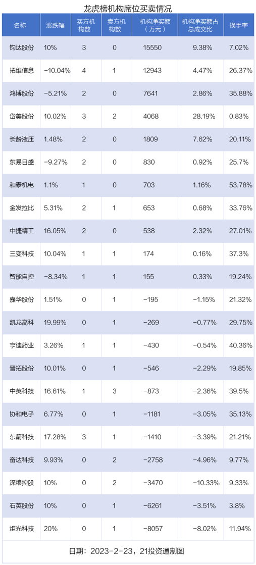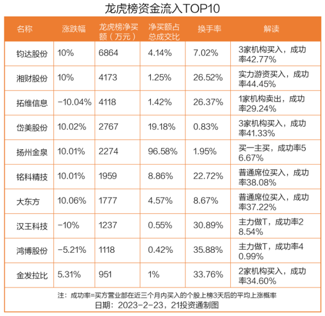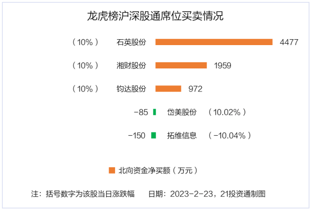 2月23日,上证指数下跌0.11%,深证成指下跌0.13%,创业板指上涨0.23%。盘后龙虎榜数据表现,共有31只个股因当日异动登上龙虎榜,资金净流入最多的是钧达股份(002865.SZ),达0.69亿元。 据21投资通智能监测,22只个股龙虎榜出现了机构的身影,北向资金到场龙虎榜中的个股共涉及5只。 0.69亿资金抢筹钧达股份,0.89亿资金出逃石英股份31只上榜的龙虎榜个股中,15只个股被净买入,16只个股被净卖出。此中,资金净买入最多的是钧达股份,达0.69亿元,占总成交金额的4.14%。钧达股份当日收盘上涨10%,换手率为7.02%。 而龙虎榜中资金净流出最多的是石英股份(603688.SH),被净卖出为0.89亿元,占总成交金额的4.97%。石英股份收盘上涨10%,换手率为3.8%。 机构净买入11股,净卖出11股2月23日,22只个股龙虎榜出现了机构的身影,机构合计净买入1.96亿元。详细来看,机构净买入11股,净卖出11股。 此中,机构净买入金额最多的是钧达股份(002865.SZ),当日收盘上涨10%,换手率为7.02%。 机构净卖出的个股中,金额最多的是炬光科技(688167.SH),当日收盘上涨20%,换手率为11.94%。 北向资金净买入3股,净卖出2股2月23日,北向资金到场龙虎榜中的个股共有5只,合计净买入7173.76万元。此中沪股通净买入2 股,净卖出1股,合计净买入6351.32万元;深股通净买入1股,净卖出1股,合计净买入822.44万元。 北向资金净买入金额最多的是石英股份(603688.SH),净买入4476.58万元,占总成交金额的2.51%。净卖出金额最多的是拓维信息(002261.SZ),为149.95万元,占总成交金额的0.05%,当日收盘下跌10.04%,换手率为26.37%。 值得留意的是,机构和北向资金共同净买入了钧达股份;在石英股份,岱美股份,拓维信息上出现分歧,机构净卖出石英股份6260.91万元,北向资金净买入4476.58万元;机构净买入岱美股份4067.57万元,北向资金净卖出84.71万元;机构净买入拓维信息1.29亿元,北向资金净卖出149.95万元。 (声明:文章内容仅供参考,不构成投资发起。投资者据此使用,风险自担。) |
