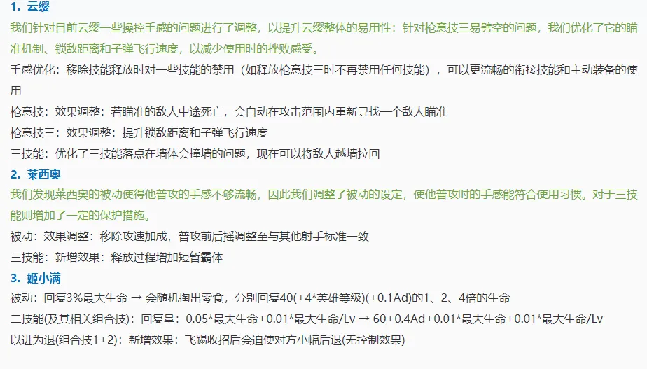 王者光彩:最惨的新好汉莱西奥将增强,云缨和姬小满调解 在2月24号官方发布体验服更新,这次更新和以往一样,重要就是对好汉之间的调解。这次调解重要就是三个好汉分别是云缨,莱西奥和姬小满。在这三个好汉中可以说莱西奥和姬小满同属于新好汉,只不外莱西奥已经上线有一段时间了,姬小满如今还没有正式上线,先来看看这几个好汉的具体调解。 云缨当前重要就是一些利用手感的题目,重要就是提拔他的团体性,其次就是优化了它的对准机制,锁定间隔和子弹的飞行速率,以淘汰利用时的挫败感受。固然说是调解,但根本可以说是一次比力大的增强了。 手感优化:移除技能开释时对一些技能的禁用(如开释枪意技三时不再禁用任何技能),可以更流畅的衔接技能和主动装备的利用 枪意技:结果调解:若对准的对头中途殒命,会主动在攻击范围内重新探求一个对头对准 枪意技三:结果调解:提拔锁敌间隔和子弹飞行速率 三技能:优化了三技能落点在墙领会撞墙的题目,如今可以将对头越墙拉回 莱西奥这个好汉固然说是新好汉,但是在当前的版本中不停没有机遇登场,属于版本比力弱势的好汉。这次重要就调解他的被动设定,使他普攻时的手感可以大概更符合风俗,对于三技能则增长了一项掩护的步调。毫无疑问就是要对莱西奥举行增强,如许就可以进步它的登场率。 被动:结果调解:移除攻速加成,普攻前后摇调解至与其他射手标准划一 三技能:新增结果:开释过程增长短暂霸体 姬小满这个好汉如今来说不停都在体验服中往返调解,不外可以肯定的是,这个新好汉一旦上线,那肯定是比力强势的。 被动:复兴3%最大生命 → 会随机掏出零食,分别复兴40(+4*好汉品级)(+0.1Ad)的1、2、4倍的生命 二技能(及其干系组合技):复兴量:0.05*最大生命+0.01*最大生命/Lv → 60+0.4Ad+0.01*最大生命+0.01*最大生命/Lv 以进为退(组合技1+2):新增结果:飞踢收招后会迫使对方小幅退却(无控制结果) 以上就为这三名好汉的寻衅,那么各人针对此事有什么想说的吗?欢迎讨论! |