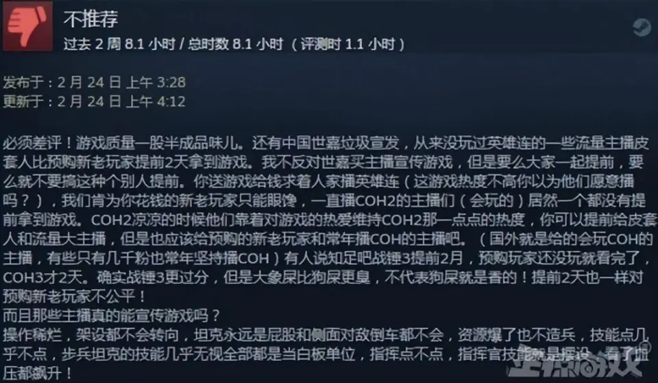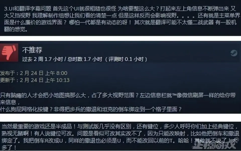 各人好,这里是正惊游戏,我是正惊小弟。 如今战略游戏江河日下,RPG游戏险些天天都有新作上架,而战略游戏几年都看不到一年,就连战略游戏的代表性作品星际2都快点被人忘记了。 克日一款着名战略游戏终于出了新作,但是却烂到连当年游戏MOD组的成员都看不下去。 在如今战略游戏式微的当下,克日难过有一款战略游戏上架steam了! 《豪杰连3》由世嘉发行,Relic制作,游戏支持简中,国区售价299元。游戏以二战为被页粳玩家将一统三军,领导新老阵营,单元和跨国作战群,碾压对手。 《豪杰连》系列是许多军迷,二战迷的最爱,当年《豪杰连2》就得到国表里媒体的划一好评,有媒体直言它是年度战略游戏前三。 固然IP很经典,但是经典不代表质量(暗黑3我没说你,你坐下),这次《豪杰连3》翻车了。如今steam上《豪杰连3》评价“驳倒不一”,好评率只有56%,根本这游戏上从宣发到制作都让玩家感到非常的不满,体现这游戏就是半成品。 关于游戏的宣发有玩家就吐槽中国世嘉不用心,找来做宣传的主播竟然连这游戏怎么玩都不清楚,看到那些主播根本操纵都不懂一顿瞎玩,完全没显现游戏的爱好,让老玩家感到血压飙升。 别的游戏自己的质量也让许多玩家感到不满,比方游戏的UI毫无美感还影响游戏,有玩家就吐槽就像是三线手游大概盗窟游戏的感觉。战略游戏对快捷键的需求是很高的,但是这游戏快捷键是绑定的,玩家没办法很好的按照自己风俗去改,而且他的键位还不是相沿系列的经典键位,也就不改的话,你玩起来就会很别扭。 除了这些标题外,汉化也是游戏一大标题,固然游戏的剧情文案没有标题,但在涉及到一些武器大概军事名词的时间就变得莫名其妙了,因此出现了“30年式防空高射炮班”“ 3号D型突击炮”“如许奇希奇怪的翻译。 有当年到场《豪杰连2》MOD汉化的玩家就体现,恨不得自己了局去纠错一下。 不外也有玩家对于翻译标题体现可以继续,由于当年《豪杰连2》连简中都没有,其时许多玩家就号令厂家出个中文补丁,但是厂家不停无动于衷,如今游戏自带简中,算是够意思了。 有一位10大哥粉就很感慨,厂家终于给游戏参加了简中,如许可以让更多玩家打仗到这款游戏了,因此固然游戏很烂,但是这位玩家仍旧给了游戏好评。 小弟嘠绿共:如今战略游戏除了几个老IP外,市面上根本上看不到新的IP出现了,而且许多老IP出新作也翻车了,如红警3星际2,要是《豪杰连3》后续不认真的修复一下标题,恐怕也要翻车了。 一个正惊标题:你玩过哪些战略游戏? |