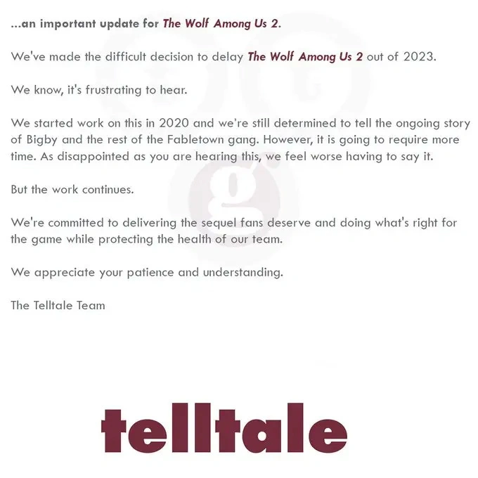 IT之家 3 月 2 日消息,游戏开发商 Telltale Games 公布原定于 2023 年上架的《人中之狼 2》游戏,将推迟到 2024 年。开发商还表现这款游戏从虚幻引擎 4 切换到虚幻引擎 5,为玩家带来更优质的游戏画面体验。 IT之家翻译 Telltale Games 官方推文内容如下:“我们做出了一个困难的决定,不会在 2023 年推出《人中之狼 2》游戏。更多信息可以访问 IGN 的副黄?道”。 《人中之狼 2》是即将推出的剧情图形冒险游戏,由 Telltale Games 在由前 Telltale 员工构成的工作室 AdHoc Studio 的帮助下开发和发行。这是 2013 年游戏《我们身边的狼》的续集,游戏名称在前一个游戏变乱发生六个月后出现。 |