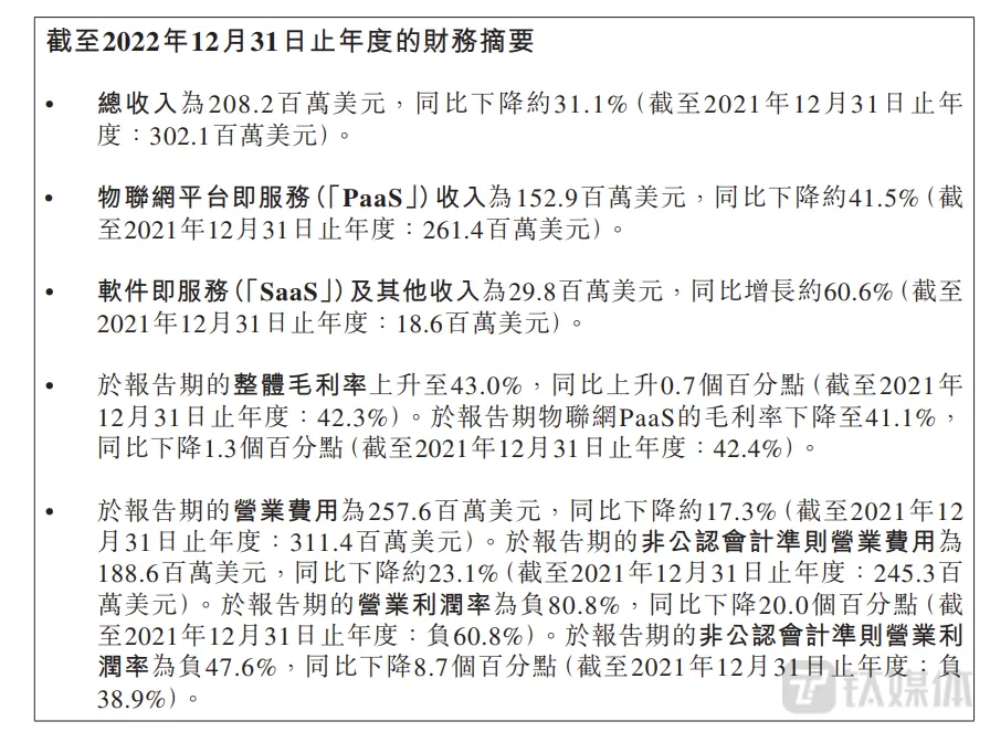 2022年整年,涂鸦智能总收入为2.08亿美元,同比降落约31.1%;净亏损由2021年的1.754亿美元收窄16.7%至1.462亿美元;每股美国存托股份根本及摊薄净亏损为0.26美元,而2021年为0.36美元。 停止美股3月1日收盘,涂鸦智能股价报收于1.87美元,大跌9.66%,如今总市值约10.82亿美元。 收入下滑,优质物联网Pass客户镌汰2021年3月,涂鸦智能登岸纽约证券买卖业务所挂牌上市,成为环球IoT云第一股。客岁7月,涂鸦智能采取双重紧张上市的方式在港交所IPO。不外,上市后的涂鸦智能也是受到了很多的质疑,无论是股价还是收入都遭遇了滑坡。 涂鸦智能2022年各季度营收及增速,钛媒体App制图 据业绩体现,已往的2022年,涂鸦智能收入大幅下滑31.1%。相比力2021年,2022年每一季度的收入也都是镌汰的。 详细来看,涂鸦智能的收入紧张由三个方面构成,包罗物联网PaaS业务、SaaS业务以及智能装备分销业务。在这之中,物联网PasS业务贡献了高出7成的收入。 2022年涂鸦智能各业务收入占比,钛媒体App制图 2022年,涂鸦智能物联网PaaS收入为1.529亿美元,同比降落约41.5%;SaaS和其他收入为2980万美元,同比增长约60.6%;智能装备分销收入为2544万美元,同比增长14.9%。 此中,SaaS业务增长最为强劲,但是其收入占比仅为14%,并不能改变公司团体收入下滑的局面,也难以成为涂鸦智能的第二增长曲线。 对于物联网PaaS业务收入的下滑,涂鸦智能表现,紧张是本团体客户采购时变得更加审慎守旧,环球连续通货膨胀及随之而来的消耗付出减弱。在连续通货膨胀的环境下,非必须消耗操行业的供需不匹配导致供应链积存大量库存。 从财报中可以看到,2022年,涂鸦智能物联网PaaS客户数量也没能守住增长。对于物联网PaaS业务2021年的5500个客户,这一数字在2022年年底镌汰至5100;总客户也从8400个降至7600个。 更为紧张的是,在物联网PaaS客户中,涂鸦智能的优质客户的数量也在镌汰。停止2022年12月31日的已往12个月,优质物联网PaaS客户为263,2021年则为311,同比镌汰15%。 据相识,涂鸦智能将已往12个月期间物联网PaaS收入贡献高出10万美元的客户界说为优质客户,这一部分客户贡献了高出8成的物联网PaaS收入。 亏损收窄的背后,涂鸦智能积极控制付出相比力收入的连续下滑,涂鸦智能在亏损上的收窄,算是已往一年降本带来的亮点。 2022年涂鸦智能各季度亏损数据,钛媒体App制图 2022年第四序度,涂鸦智能净亏损为2270万美元,相比力下,2021年同期净亏损则为4880万美元。2022年的净亏损由2021年的1.754亿美元收窄16.7%至1.462亿美元。2022年运营亏损从2021年的1.836亿美元收窄8.4%至1.682亿美元。 2022年第四序度,涂鸦智能的团体毛利率上升至44.6%,同比上升1.4个百分点;整年团体毛利率上升至43.0%,同比上升0.7个百分点。 由于与IoT PaaS业务干系的某些慢速移动IoT芯片和原质料的370万美元库存准备金造成的影响,2022年IoT PaaS毛利率为41.1%,与2021年的42.4%相比降落了1.3个百分点。 亏损的下滑固然是功德,但降本的同时也要提效。为了低沉亏损,用涂鸦智能本身的话说,已往一年积极控制付出,在多个方面缩减了资本。 2022年第四序度,涂鸦智能精简研发团队和运营,研发费用为2780万美元,较2021年同期的4620万美元降落39.8%;团体研发团队的均匀受薪员工人数也较客岁同期降落约48.1%。 在镌汰研发投入的同时,涂鸦智能还进一步精简了贩卖和营销费用的付出。2022年第四序度贩卖及营销费用为1120万美元,较2021年同期的1840万美元降落39.2%;2022年的贩卖和营销费用为5570万美元,较2021年的7540万美元降落26.2% 将来仍存诸多挑衅创建于2014年的涂鸦智能赶上了物联网发展的上升期,在美股上市后,市值也是一度高出150亿美元。 多家研究机构公开的数据都体现,物联网仍处于一个快速增长期。IOT Analytics预计,到2025年,环球物联网毗连数将超270亿个。IDC发布的环球物联网市场陈诉体现,2021年环球物联网(企业级)付出规模达6,902.6亿美元,并有望在2026年到达1.1万亿美元。 2022年,涂鸦智能为了低沉亏损而缩减预算,也并没能让财政数据变得悦目。进步收入、扩大优质客户群体,增强研发本事,才是其更须要做的事变。 (本文首发钛媒体App,作者/杜志强,编辑/钟毅) |