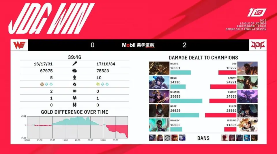 #2023LPL无畏竞顶峰#2023年3月2日,LPL春季赛第七周第四个角逐日,JDG对阵WE。 首局BP: JDG拿到维鲁斯,随后锁下酒桶杰斯的中野组合,第二轮拿到上单奎桑提,末了一手锁下大头,和维鲁斯组压线组合。WE则是拿到烬作为AD,中野拿到大树、刀妹,第二轮上单先出赛恩,末了一手锁下女枪辅助。 角逐阶段: 5分钟,JDG对线打出上风,烬压线被大头手雷砸中,率先被打出一血,随后失去了被动移速加成的女枪也被大头第二发手雷砸中,JDG对线取得双杀! 今后WE抓到JDG回补的机遇先控下小龙,JDG则是控下前锋,12分钟JDG依靠下门路权控下小龙,13分钟下路施压资助双人组吃下一血塔。13分半中野对抗,酒桶大招炸回大树,固然WE的反手已经不错了,但大头突然出现交出RE,资助JDG在中野对抗中取得双杀! 15分钟,WE大树大招先手留人,但被JDG拉开,酒桶反手大招炸回女枪,尺帝轻松收下人头,JDG控下二前锋,将经济差拉开到惊人的7K5。 今后固然WE在18分钟的小龙团打出反扑,但经济差距着实太大,JDG后续打得很浪,WE则是打得很坚强,但还是无力回天,JDG硬是把20分钟竣事的角逐打到了30多分钟。 赛后数据,经济曲线着实就能看出这场角逐差距有多大,下路对线双杀,大树野区被反烂,中野对抗被双杀,JDG全线上风下灵敏滚动雪球。 MVP给到了Missing操刀的大头,前期对线双杀开启了JDG滚动雪球的第一步。 第二局BP: WE一抢猪女,随后锁下烬、卡尔玛的双人组,第二轮拿到鳄鱼、妖姬的中上,阵容比力偏前中期对抗。JDG则是拿到女警、拉克丝,打野锁下豹女,第二轮拿到奎桑提上单,末了一手锁下卡萨丁,阵容有点怪,卡萨丁中路没线权很难掩护豹女的野区,豹女野区压不住猪女便很难辐射下路女警、拉克丝打克制,中期也很难以奎桑提为支点接团。 角逐阶段: 2分半,WE对线又出标题,原来换血已经取得小上风了,但烬卖的太深,导致本身直接被秒,猪女即便就在反蹲也毫无办法,只能看着队友交出一血。 不外小龙还是由前期中门路权稳固的WE控下,9分半,前锋团,JDG有点不恭敬阵容了啊,居然选择接团,猪女先手共同鳄鱼出场先手秒掉了拉克丝,固然369大招带走卡尔玛打出击杀,但也仅此而已了,WE打出1换3的完胜控下前锋。 11分钟,JDG强行先手控下小龙,只是以阵亡辅助拉克丝为代价,WE龙魂节奏小断一波还能继承。13分钟,WE又是在下路塔下强行击杀拉克丝。 14分钟,WE在野区逮到Kanavi豹女,率先打出击杀,Missing拉克丝还想救兄弟,效果只能是买一送一,WE取得双杀。 15分钟,JDG依靠369的TP绕后乐成越塔击杀卡尔玛,资助卡萨丁提到人头,但女警在中路被妖姬轻松完成单吃,鳄鱼还上路单吃一血塔,WE顺势控下小龙。17分钟,WE中路越塔一连击杀双人组,拔掉中路一塔,在转头控下二前锋,JDG只是互换到上路一塔。 中期JDG依靠一波抓边边线击杀鳄鱼,算是缓了一口气,22分钟WE控下听牌电龙,22分半上路抓死单带的奎桑提,WE选择大龙逼团,而且依靠鳄鱼的绕后直接咬死豹女,克制了Kanavi抢大龙。JDG仅仅是依靠卡萨丁单带换到了下路高地塔。 24分半,WE中路推进,先手尺帝被尺帝交出双招拉开,JDG顺势反开,击杀WE野辅克制大龙推进。顺势反推中路一塔,经济差只剩2K。 27分钟小龙团,WE选择先手卡萨丁,但被Knight丝血锁住乐成逃生,反而是追击过深的鳄鱼率先阵亡,JDG拿到人数上风控下小龙,经济已经追平WE了。 31分钟,鳄鱼野区踩夹子直接被秒,JDG正面顺势睁开追击,固然Shanks搏命换掉了两人,但还是被JDG打出一波2换4的完胜,JDG顺势控下大龙,局面已经彻底逆转。 今后JDG再次控下小龙,WE的电龙魂遥遥无期,固然后续369奎桑提硬装一波被击杀,但进入大后期,JDG双C战力超群,终极在39分钟龙魂团打出1换5一波竣事角逐,JDG从BP到游戏内容真就突出一个纵情。 赛后数据,JDG逆转前期最多的5K的劣势,在后期依靠发育起来的双C乐成继承角逐。 MVP给到了Knight的卡萨丁。 |