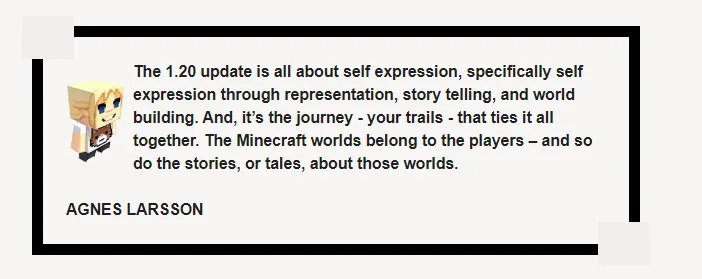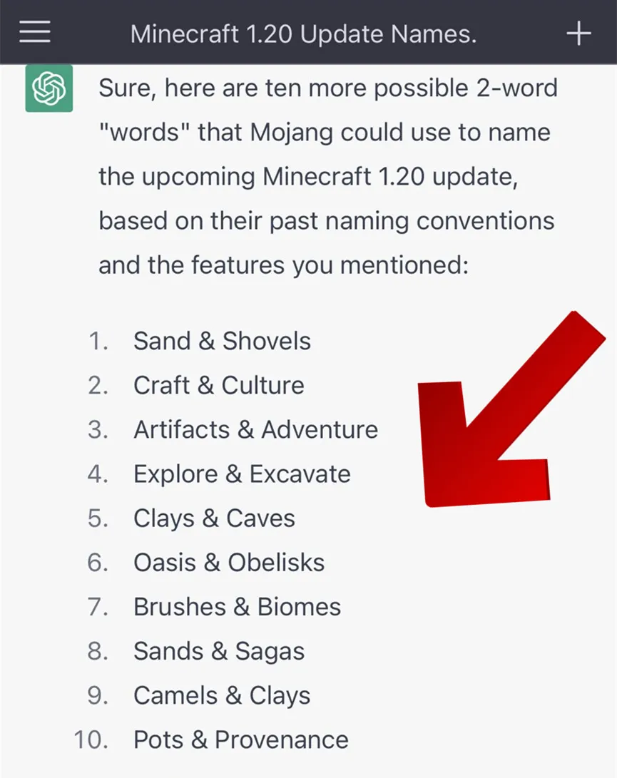 号外!号外!Minecraft 1.20更新主题发布啦!正式更新名称为Minecraft:Trails & Tales足迹与故事!(注:英文直译,暂未定名) 01 1.20的更新主题是什么? 1.20的更新主题既然是Trails & Tales,这意味着《我的天下》1.20至少包罗了两个大方向的主题更新,此中Trails有陈迹、足迹的意思,而Tales是指布满了惊险的一种故事,一种历险记。以是1.20的这个更新主题不外乎也分为两个主题,就类似1.18的一个洞穴更新一个山崖更新两部分一样。 1.20的第一个更新主题是Trails,也就是足迹。这里刚好对应了此前LadyAgens提出的旅途的概念,足迹可以用来指基于骆驼为轴心的全新的旅程,也可以指在考古配景下的到处探索汗青文明留下的陈迹,固然也不清除1.20大概的戈壁更新和丛林乡村带来全新的旅途。 1.20的第二个更新主题是Tales,出色的传说,历险的故事,Tales代表的更新大概将会是玩家基于考古体系,史宿世物嗅探兽所带来的属于Minecraft古代汗青和传说。 同时呢,两个主题又是相互关联相辅相成的,玩家通过探索、观光和足迹劳绩属于Minecraft独一无二的汗青和故事。更深条理的寄义,Mojang盼望1.20这个版本可以重新让玩家去誊写一个自己在游戏中冒险的故事,乃至是玩家陪同着Minecraft一起走来的故事。 大概LadyAgnes的这段话可以总结1.20想要表达它的更新目标: The 1.20 update is all about self expression, specifically self expression through representation, story telling, and world building. And, it’s the journey - your trails - that ties it all together. The Minecraft worlds belong to the players – and so do the stories, or tales, about those worlds. ——Agens Larsson. Minecraft 1.20 更新完全关注于自我表达,特殊是通过代表性、叙事和天下构建的自我表达。而且,它是旅程-你的履历-将全部内容细密接洽在一起。Minecraft 的天下属于玩家,这个天下的故事和传说亦属于玩家。——Agens Larsson. 以是接下来一段时间,1.20带来的新内容盼望如官方口中如许,可以重新述说一下《我的天下》是一个怎样的冒险,拥有怎样的故事和传说。 02 AI猜对了,照旧人猜对了? 此前我们基于当前已知的信息,实行猜测了《我的天下》1.20的更新主题。包罗了人工猜测和AI猜测两个部分,AI的部分我们用了当前大火的AI画图和ChatGPT两种模子举行猜测。 可以肯定的是,用AI画图猜测完完全全的失败了,它补全了空缺部分的主题是“Minecraft”,便是没说。ChatGPT猜测的10个名字当中没有一个是对的,乃至完全搭不上边。看来人脑终究照旧要强于AI的。 但有一点M菌本人是100%猜对了,那就是《我的天下》1.20的更新是双主题的情势“xxx & xxx”,而不是单纯主题情势的“xxx update”,而且毗连主题中的两个词语都是简短的。至少不会是“考古archaeology”这种长长的单词。同时我们也乐成猜到了1.20的主题肯定是和旅途、考古这类核心内容有关。固然只管我们明白的猜测了以上的内容,却也很难精确的判断出“Trails & Tales”这两个词。 如果你要问Mojang接下来的更新方向是什么,我只能说现在《我的天下》1.20社区最等待的两大新内容:一个是基于竹木打造丛林乡村,一个是基于考古和骆驼的戈壁翻新。对了,中国风的纸灯笼热度也非常高。 |