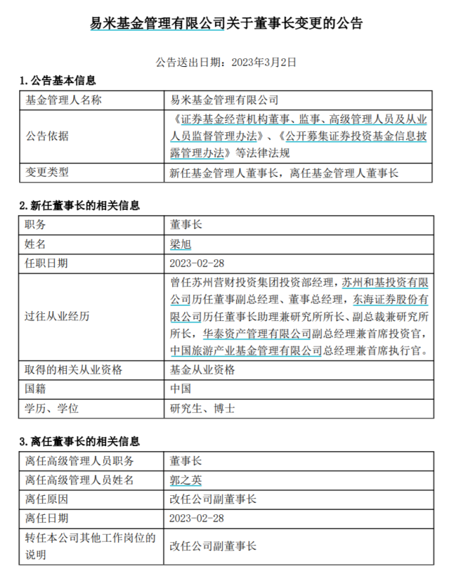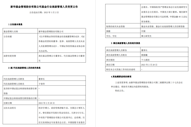 3月刚刚开始,就有基金公司官宣高管人士变更。 日前,新华基金发布公告称,总司理于春玲代任董事长一职,原董事长翟晨曦、原副总司理刘征宇皆因个人缘故原由于同日离任,这也意味着新华基金正式告别了“天风”期间。而个人系公募易米基金也于同日官宣,梁旭为新任董事长,原董事长郭之英改任公司副董事长。 “岁末年初是各家公司职员活动的高峰期。”有基金业人士告诉记者,行业竞争剧烈下,行业高端人才活动剧烈且愈加常态化,股权变更、业绩考核、薪资报酬等都是影响公募高管变更的紧张因素。 据第一财经统计,停止2023年3月3日,自客岁12月以来已有104位基金公司高管出现职务变更,涉及65家基金公司。而将时间拉长至2019年以来,出现职务变更的高管数目累至1545位,单一年度的变更数目均凌驾320名 新华基金迎来新“掌门” 3月2日,新华基金发布高管变更公告,总司理于春玲于2023年2月28日起代任董事长一职,原董事长翟晨曦因个人缘故原由离任,与其一同离任的尚有原副总司理刘征宇。公开资料体现,于春玲具有丰富的复合型金融行业从业履历,此前曾在银行、保险、资管等机构任职,并于2021年4月加入新华基金。 新华基金高管变更的背后,大概是实控人的厘革。本年2月,证监会允许批复,北京金融街投资(团体)有限公司成为新华基金实际控制人。股权穿透体现,北京金融街投资(团体)有限公司的实控人为北京市西城区国有资产监视管理委员会。 在此之前,天风证券曾在2020年收购恒泰证券29.99%的股权,成为其第一大股东,并曲线控股新华基金。换言之,新华基金在天风证券实控不到三年后再度易主,至此被国资收入麾下。业内广泛以为,国资入股获将有利于新华基金打开新发展空间。 而作为天风证券副总裁的翟晨曦于2021年4月继承新华基金董事长一职。在她的向导下,新华基金的基金管理规模曾有短暂的上涨,不外,到达高点后仅半年时间里,公司管理规模缩水近300亿元。 Wind数据体现,新华基金的管理规模从2021年2季度末的558.55亿元涨至2022年2季度末的868.37亿元,创出汗青新高。但好景不长,随后新华基金规模大幅下滑,2022年底的规模已经降至576亿元,较之高点已降落三成以上。 作为一家2004年创建的公募基金公司,新华基金发展至今已有19年,但不敷千亿元的发展规模并不理想。与其发展相悖的是,基金行业比年来的高歌猛进。数据体现,2004年底,全市场公募基金规模为3258亿元,而在2022年底,这一数字已经灵敏增至25.75万亿元。 从上述数据不丢脸出,在已往近20年的时间里,本该拥有先发上风的新华基金并未跟上行业的扩张步调,发展速率相对滞后。且其现在在全市场195家公司中排名达72位,非货资产排名则在83/185,在行业中处于中游位置。 从产物结构来看,新华基金的货币市场型基金和债券型基金产物占据绝对上风,二者分别有230亿元、218亿元,二者合计占比凌驾77%;而其主动权益类仅有不到121亿元的规模,占比2成左右。 四年来高管变更超1500人 在新华基金迎来新“掌门”的同一天,个人系公募基金公司易米基金也发布高级管理职员变更公告,任命梁旭自2023年2月28日起为公司新任董事长,原董事长郭之英改任公司副董事长。 作为一家2020年创建的次新基金公司,易米基金发展至今的规模并不大。数据体现,停止2022年12月31日,易米基金旗下仅有3只基金,均为权益类产物,合计管理规模为5.81亿元,位居全市场第175位。 毕竟上,上述基金公司的人事故动,是比年来基金圈频现掌门人变更的缩影。作为公司“掌舵人”,基金公司董事长、总司理等核心职位的紧张性不问可知,因此干系职员变更备受市场关注。 “股东方有所厘革,自然会导致公司的董事长、总司理等高层的转换。”一位不肯具名的基金市场部人士告诉记者,创建较晚或规模较小的基金公司发展会相对艰巨,若没有“出结果”,大概也会盼望通过换帅来打开局面。 上述人士对记者进一步体现,作为机构发展方向的掌舵人,董事长的职员大多来自负股东委派,对股东的风格和诉求颇为相识,而总司理则多是由市场化雇用的方式举行的职业司理人。 “高管变更的背后着实是当前剧烈的行业竞争。基金公司控股权的频仍变更,则进一步进步了高管变更的频次。”华南一位基金业内人士告诉记者,现在业内越来越必要复合型高管,以带来新的管理层发展视野,开辟新的业务发展方向。 在他看来,公募机构的高管变更可以为公司带来新的方向和谋划理念,大概可以在剧烈的市场竞争中探索出一条得当本身的蹊径。“但高管变更过于频仍,也会给公司管理带来挑衅,由于这或多或少会影响公司的一些关键性政策。”他称。 “业内有人才变更很正常,岁末年初是各家公司职员活动的高峰期。”另一位基金分析人士则体现,近两年基金行业高管变更已成常态,公募行业竞争愈加剧烈,基金公司数目日渐增多,良好人才有所活动是正常征象,相对而言中小机构出现的情况偏多。 “核心高管对团队的稳固性、投研建立、渠道建立等都会有肯定的影响,假如变更频次较大也折射出公司管理方面的一些标题。”他对记者体现,核心高管对基金公司的发展起到举足轻重的作用,“军心不稳”以致会在公司基金规模上直接体现。 Wind数据体现,停止2023年3月3日,本年以来已有58位基金公司高管出现职务变更,共涉及35家基金公司。具体而言,上
