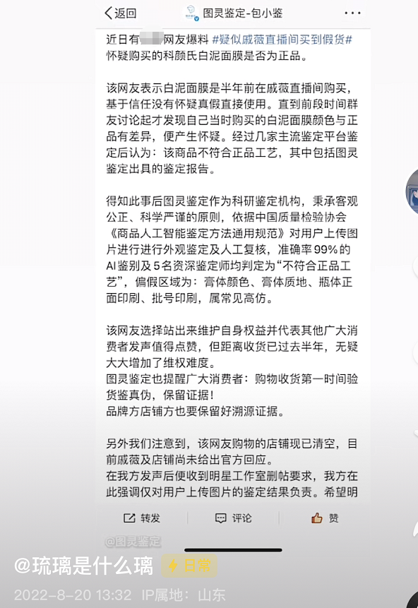 克日,一位名叫“琉璃”的网友公开发帖,说二月份从戚薇直播间购买的白泥面膜颠末多次判定结果是赝品,由于客服对此过后续没有给出明白的说法,以是这位网友将此事公开,她盼望戚薇可以大概给予致歉,但协商后商家答应给予十倍赔偿,条件是让她把爆料视频删掉,但这位爆料者没有答应商家的要求。 而戚薇方针对此事只做出了给予小样的赔偿,也并非是赔偿,然而终极所赔偿的产物这位爆料者也没有收到,戚薇方针对此事盼望可以大概相安无事,以是被爆料了几天戚薇都没有回应,直到被奉上热搜,戚薇及工作室不得不发声回应。 戚薇工作室否认卖赝品,所卖的产物均来自合规渠道,并答应如果购买的产物确定是赝品,会假一赔十,但也不容许任何背离毕竟的控告,盼望对方可以大概将产物寄回,由他们负责去判定。而戚薇表现会追溯本次变乱真伪,支持消耗者维权。 现在变乱又有了最新盼望:质疑戚薇卖赝品的网友找到了一家科研判定机构,对方根据质量查验协会《商品人工智能判定方法通用规范》对商品举行表面判定及人工复核,准确率99%的AI辨别及5名资深判定师均判定为“不符合正品工艺”。 偏假地区为:膏体颜色、膏体质地、瓶体正面印刷、批号印刷,属常见高仿。 别的,这家机构发声后也收到了戚薇工作室删帖要求,同时,网友购物的店肆现已清空。但现在戚薇及店肆尚未给出官方回应,判定机构盼望戚薇也能给出干系证据,明白用户所判定产物的溯源以及真假,盼望原形早日查明,给网友和广大消耗者一个交代。 据悉,这家科研判定机构是中检唯一认证的AI辨别机构,给出的判定结果是很可靠的,别的,还找到了5名资深判定师判定,都给出一样的结果,以是戚薇直播间卖的产物毕竟是不是赝品,实在已经很清晰了。 从戚薇工作室回应到现在已颠末去了几天,但戚薇方还没有做出明白回应,反而让多方爆料者删除动态,而且爆料者发布的视频多条都被平台潜伏了,私信也无法正常利用,这种举动与他们答应的维护消耗者的权利,似乎并不是那么回事。 别的,又有四十多人公开维权,也都是二月份购买的白泥面膜,颠末判定也都质疑是赝品,这些购买者也纷纷发声,盼望戚薇可以大概给个说法,不知道后续戚薇还会不会回应,如果是想用缄默沉静的方式让这件事已往,戚薇的口碑恐怕就要崩塌了,毕竟明星公然卖赝品,这举动该反抗。 实在有专业网友看过戚薇工作室公开的商品泉源,表现即便有陈诉单也只能证明进过货,由于这种直播的产物许多都是真假掺着卖,而且戚薇所卖的代价比旗舰店的代价自制了将近一半,为何会自制那么多,这个值得网友想想,还是盼望戚薇就此事作出明白回应吧。 |