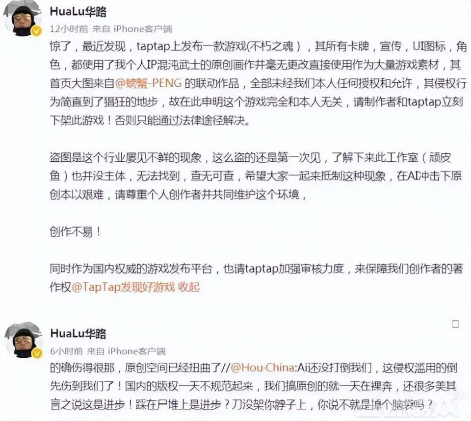 各人好,这里是正惊游戏,我是正惊小弟。 这段时间AI绘画疯狂的发展,让很多画师都感到了威胁,但是技能无罪,人才是最可怕的,人才是恶的源头,克日一位国内让很多大佬都尊称一声老师的顶级画师就被盗图抄袭的人给伤到了。 克日国内闻名手游平台下架了一款名为《不朽之魂》的游戏,这款游戏是叫淘气鱼工作制作的卡牌游戏,固然游戏不是什么大厂出品,但是依附不俗的美术吸引了不少的玩家,评分在某平台也高达7.3,要是没故不测的话工作室可以小赚一笔。 但不测来了,游戏被平台光速下架了,由于这游戏的卡牌,宣传图,乃至是游戏的界面险些全都是盗来的素材! 因由是国内顶级画师华路在网上发文吐槽,《不朽之魂》这款游戏险些全部的美术素材都是盗用他的原创画集《混沌武士》的内容,面临云云放肆的抄袭盗用,他的挚友画师Hou China表现“Ai还没打垮我们,这侵权滥用的倒先伤到我们了。” 比方《不朽之魂》首页的宣传图是他的挚友的作品,游戏的图标,游戏的界面,游戏卡牌人物全都是来自《混沌武士》,淘气鱼工作室根本上就裁剪变色处置惩罚一下就直接拿来用了。 华路可不是一样寻常的画师,国内很多大佬见了他都要叫一声老师,他是中国影戏美术学会CG专委会常务委员,环球顶级游戏美术概念大赛的评委,给游戏公司的画师授课,网易旗下不少游戏都和他的公司有相助,如《阴阳师》《第五品行》《非人学员》《荒原办法》等,别的还和洽莱坞的影戏公司也有相助。 4个小时后官方平台做出了回应,立即下架了《不朽之魂》并对原创者的丧失表现歉意,下一步会举行协商具体的办理方案。同时表现美术素材的检察很复杂,确定素材的源头和版权很难,末了表现渴望各人能继承监视,实时举报,一起掩护原创。 华路也表现感谢平台实时处置惩罚,渴望能一起维护原创者的长处。 面临如许放肆的盗用的举动网友吐槽“这是拔高了盗图界的天花板”,“从前是盗封面图,如今是整个游戏都是盗来的”“这不是来盗图是来进货的。”有被这操纵震动的网友“盗了一套图直接做出一款游戏?” 浩繁品评里有个比力特殊的网友,网友“淘气鱼小姐姐”说是《不朽之魂》的制作人,这是测试版,盗用是为了验证玩法,没有商用,哀求体贴。固然这个网友是真的游戏制作人,照旧无聊蹭热度的路人,就不清楚了,由于这位网友什么信息也没留下。 小弟嘠绿共:专业的游戏美术概念画师一幅画都几万起步,著名气的就要加个零了,听说《阴阳师》一张插画就高达15万,就算华路来个友爱价,《不朽之魂》光是美术大概就要花上百万,固然条件是淘气鱼请得的话。 一个正惊标题:要是你玩的游戏是盗用资源的你还会玩吗? |