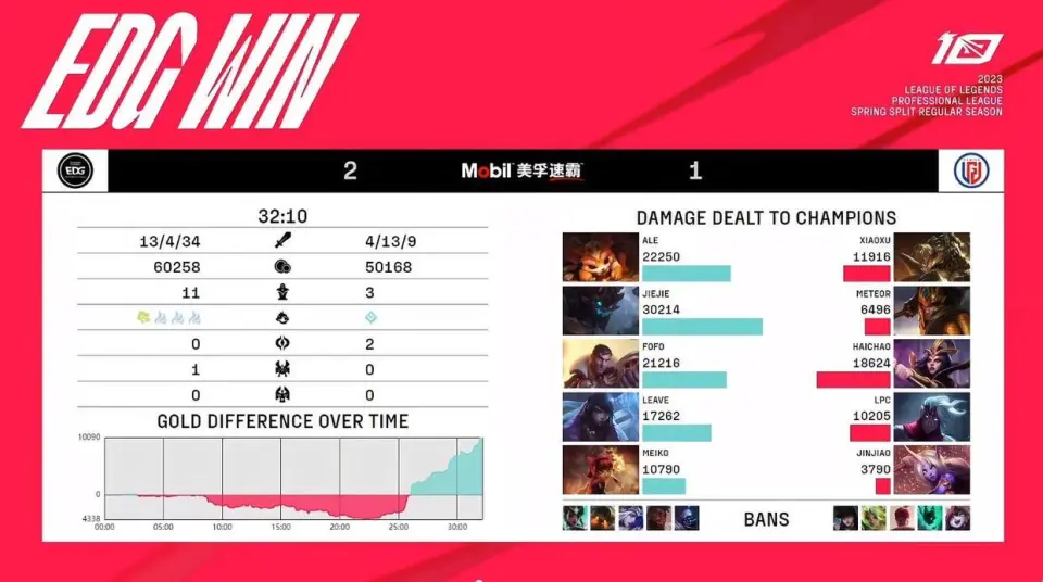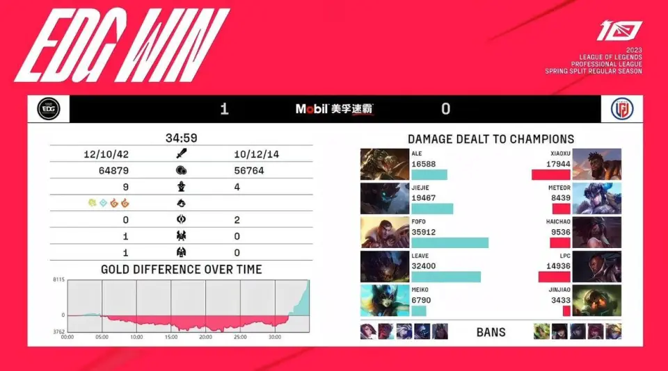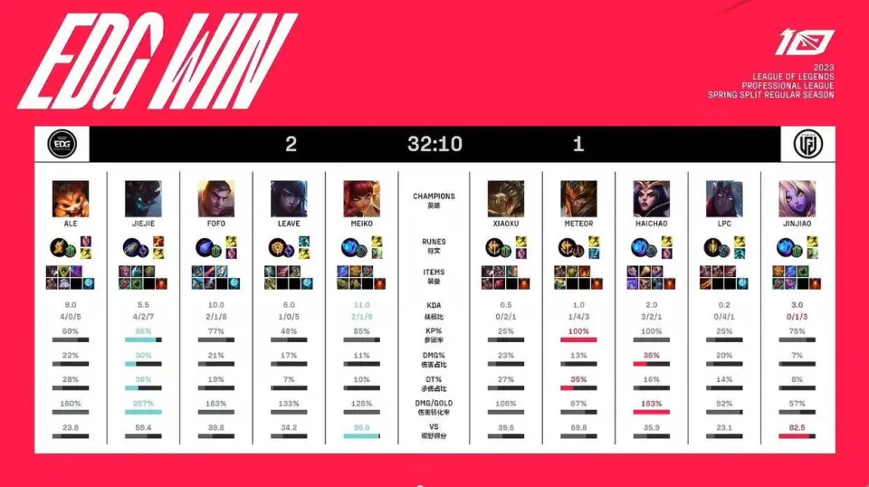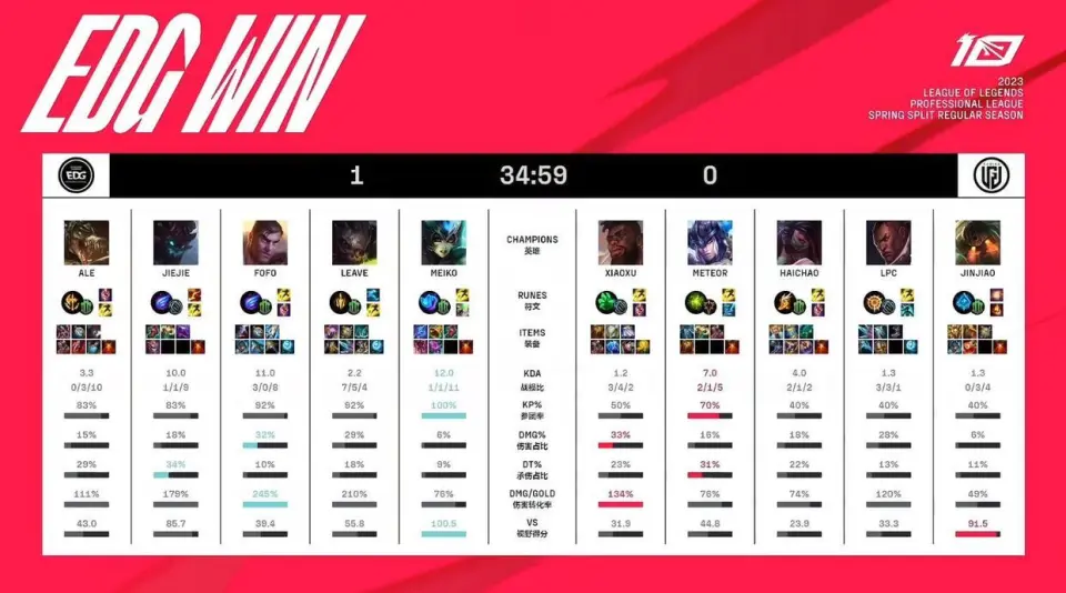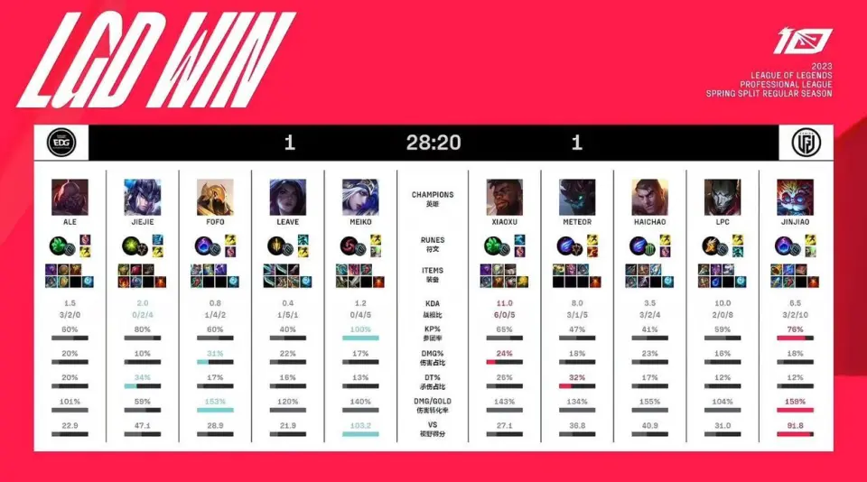 #2023LPL无畏竞顶峰#2023年3月9日,LPL春季赛第八周第四个比赛日,EDG对阵LGD,赛前EDG以9胜2负的战绩仅以小分劣势掉队于LNG位居第二,LGD则是4胜7负位列13,固然另有理论上的季后赛时机,但确实不大,不外LGD在上一场爆出小冷门击败BLG,EDG依然不能大意。 首局BP分析: 两边第一轮BAN位大量投资到下路,EDG加BAN一手Xiaoxu上一场发挥精彩的武器,自己则是一手锁下杰斯,随后选择拆强拆卢娜组合,打野拿到大树,前三手出来已经是拉扯POKE阵的板子了。 第二轮选择按掉LGD的单带好汉,自己锁下鳄鱼提前中期强度,末了一手AD位在被按掉了比力多的好汉的环境下选择了大嘴,也是长手POKE角,鳄鱼根本只要站住位置掩护队友就好。 LGD则是卢娜被拆后选择了泰坦,打野拿到猪女,前三手奠基了冲阵基调,第二轮继承强化冲阵本领,阿卡丽、奎桑提都有比力好的针对C位的本领,缺点则是对线挺难打的,就全看团战冲阵的结果了,毕竟对手拿到的大嘴照旧很怕被冲的,固然有娜美、大树两个反手大招,但只要能打出包夹的局面,照旧由时机肢解EDG阵型的。 比赛进程: 前期两边打野第一轮支援都给到了下路,卢锡安泰坦强打一波稳住了对线,第二轮打野动向猪女直奔上路资助奎桑提击杀鳄鱼,在上中野的对抗中率先打出突破口,而且后续Xiaoxu也没有辜负队友,完成了对Ale的单吃。 Jiejie则是将注意力继承投入到下路,控下小龙。7分半,LGD下路推线进塔后和猪女一起蹲草,而且乐成逮到了放松鉴戒的大嘴。另一方面上路奎桑提的雪球还在继承扩大,在大树比猪女先到场的环境,率先完成击杀,而且残血反打,和大树互换闪现,LGD顺势控下先锋。 11分钟小龙团,LGD中戮由以先动,因此野辅实验开团,但共同出现失误,被娜美大树两个反手大招结果打得太好了,两边互换AD的环境下EDG状态更佳控下小龙。 但大嘴娜美照旧站不住中线,15分钟,LGD野辅的先手乐成秒掉了大嘴,LGD顺势收下了中上两个一塔以及二先锋,EDG则是下路抓阿卡丽无果,只换掉了下路一塔。 后续LGD下路开释先锋拔掉下路一塔,但却放掉了中路兵线,反而是导致自己中塔陷落,最肥的奎桑提被卡在战场之外,但上风之下的LGD依然是可以踩住龙坑,却被大树不测的1滴血抢下了听牌火龙,这也让LGD压力陡增。 重压之下的LGD果然在后续团战堕落,野辅的先手直指大嘴,但被大树、娜美双反手大招耽搁了正面的冲阵,阿卡丽绕后出场处理处罚大嘴也花掉了太多时间,正面险些没有给到队友任何资助,鳄鱼、大树精密连合在杰斯四周完成了1换3的完胜控下火龙魂。 有了火龙魂加持的EDG已经开始占据上风,30分钟太古龙团,固然EDG率先秒掉了猪女,但大嘴过于托大的走位,被奎桑提和阿卡丽切到,LGD总算是打出了一波好团,顶着EDG的火龙魂打出2换3。 以后两边继承围绕太古龙交锋,EDG罗致了上一波的教导,Ale侧翼单防奎桑提,正面队友扎稳篱笆保着双C输出,EDG击杀泰坦拿到太古龙,再收大龙,带着三龙汇的推进LGD根本无力拦截。 赛后数据: LGD依靠奎桑提单点的上风前期打出了比力大的经济领先,但下半区由于最肥的奎桑提没有参团,EDG照旧可以大概控下小龙,而且也是有些天时地利人和吧,LGD最强势的一波小龙险些是志在必得的一波被大树1滴血抢龙,让LGD背负了太大的压力。 输出数据上,EDG掩护双C输出着实就够了,上野两个点控以及野辅的两个团控可以有效的克制LGD的冲阵,延缓C位被切的时间,毕竟上在如许的设置之下,个人感觉LGD每次只是安排阿卡丽单点绕后是远远不敷的。 MVP给到了Jiejie的大树。 第二局BP分析: 两边没有换边,LGD继承三BAN下路,EDG选择放出艾希自己一手抢下,随后点出猪女、卡莎,一个偏团战冲阵,中期也能抓边的板子,第二轮由于LGD没有出双人组,EDG按掉了两个反手大招比力克制冲阵的娜美和霞,自己则是锁下赛恩、沙皇的阵地战组合,变了一手阵。 LGD则是前三手拿到杰斯、大树、奎桑提的上中野,主打资源团战的板子,第二轮按掉了格温、剑姬为奎桑提的边线上风铺路,双人组则是拿到烬、大头,强化了阵容的节奏以及资源团战力,LGD这把险些是肯定要速龙的。 比赛进程: 前期两边打野都是优先保下,但大树捕获到EDG中上兵线告急的信息多蹲了一会,果然等走了猪女,下路闪现抱住艾希打出一血,后续回家整补后早早控下小龙,迈出速龙第一步。 8分钟的先锋,杰斯不吝放弃兵线和塔皮资助队友控下,大树顺道在上路资助奎桑提击杀赛恩,边线再次打出上风。11分钟,LGD铺垫小龙节奏中戮营释先锋被EDG逮捕,没能撞出来,大树还亏掉闪现,但幸亏双人组抢龙坑视野打出上风,完成辅助AD互换。 也是在如许的铺垫之下,LGD13分钟的龙团大获乐成,踩住龙坑位置,大树大招逼退,资助队伍控下小龙,还拿到了沙皇人头。以后的二先锋LGD也依靠奎桑提领先沙皇TP的上风控下。 17分半小龙革新前EDG实验找时机破局,否则又是LGD中戮营释先锋抢兵线踩龙坑地形控听牌土龙的节奏,但惋惜的是艾希固然大招掷中大头,但卡莎出场输出不敷,被大树反手大招留住完成反杀,LGD按照前文的脚本轻松收下听牌土龙。 以后EDG实验抓边破局,但LGD也能互换到东西,22分钟,EDG中路先手秒掉了大树想抓一波大的,选择直接Rush大龙,但被猪女抢下不说,团战还被奎桑提完成收割,打出一波1换5的完胜。 后续LGD在大上风之下收下土龙魂,得到土龙魂加持的奎桑提成为了怪物,LGD28分钟一波竣事比赛。 赛后数据: Xiaoxu奎桑