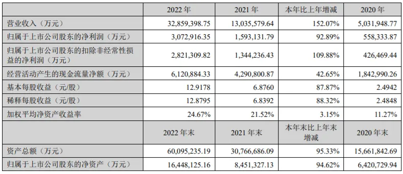 宁德期间3月9日晚间发布2022年年度陈诉,2022年实现业务收入3285.94亿元,同比增长152.07%;净利润307.3亿元,同比增长92.89%。 年报表现,根据SNEResearch统计,2022年公司举世动力电池利用量市占率为37.0%,较客岁同期提升4.0个百分点;2022年公司举世储能电池出货量市占率为43.4%,较客岁同期提升5.1个百分点。 研发方面,公司连续加大研发投入,2022年研发费用投入达155.10亿元,同比增长101.66%。动力电池方面,公司无热扩散技能电池产物已得到多个国表里客户的认可并量产;公司2.2C快充三元产物国内首家在乘用车上得到应用;AB创新成组方式批量推广。储能电池方面,公司基于长寿命电芯技能、液冷CTP电箱技能推出的户外EnerOne电柜和户外预制舱体系EnerC大批量出货,储能表后业务的6C高功率UPS新电池体系也已实现出货。 别的,公司拟以现有总股本2,442,514,524股为基数,向全体股东每10股派发现金25.20元(含税),合计派发现金股利6,155,136,600.48元;同时以资源公积金向全体股东每10股转增8股,合计转增1,954,011,619股,转增后公司总股本为4,396,526,143股;本年度不送股。 同日,公司发布公告称,2023年3月31日15:00,公司将召开2022年年度股东大会。本次股东大会将审议《关于<2022年年度陈诉及其择要>的议案》等议案,2023年3月22日收市后登记在册的股东可现场参会投票,或通过买卖业务所投票体系利用表决权。 |