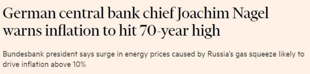 【文/观察者网 周弋博】 本地时间8月20日,英国《金融时报》报道称,德国央行行长阿希姆·纳格尔日前担当德媒采访时透露,俄罗斯对天然气供应的收紧已导致能源代价飙升,或将在本年秋季推动德国通胀率增至10%以上,以致在来岁继承处于高位。 报道指出,若纳格尔的推测建立,则意味着德国的通胀率将到达近70年来的最高程度。纳格尔称,为应对通胀题目,欧洲央行(ECB)将必要在9月8日的集会上继承加息。 英国《金融时报》报道截图 “通货膨胀的题目不会在2023年消散。”纳格尔在担当德国《莱茵邮报》采访时称,“供应瓶颈和告急的地缘政治大概会不停一连。与此同时,俄罗斯已经大幅淘汰了天然气供应,天然气和电力代价的上涨幅度超出了预期。” “(德国)通胀将高于此前推测的大概性已然越来越大,来岁均匀通胀率在小数点前的数字将会突破到6。”纳格尔指出,这个数字将高出德国央行本年6月推测的2023年约4.5%的均匀通胀率。 纳格尔以为,到本年秋日,德国的通胀率大概会突破10%——这也是自1971年以来德国通胀率初次突破两位数。本年7月,德国通胀率已经到达8.5%,系近40年来的最高记录。 据报道,经济学家已经对德国以及欧元区本年经济增长的预期举行大幅下调,同时上调了这些国家的通胀预期。有专家告诫称,俄罗斯克制能源供应将迫使德国当局对重工业用户限量供应天然气。 8月19日,俄罗斯当局公布将于本月尾对“北溪1号”天然气管道关闭3天,以便举行维修。“北溪1号”是向欧洲运送天然气重要管道,此前俄罗斯已将管道供应量淘汰至产能的20%左右。 据彭博社消息,欧洲能源买卖业务所公布的德国整年电力代价已上涨11%,至每兆瓦时530.50欧元。这标记着德国已往一年基准电价上涨了约500%,背后的重要缘故原由是俄罗斯天然气的供应淘汰。 客岁以来,德国的基准电价上涨了500% 图源:彭博社 在克制7月份的一年里,受能源资本影响,德国工业生产者的费用付出上涨了37.2%——德国联邦统计局表现,这是有史以来最高的费用增幅。 别的,正在肆虐欧洲的高峰热浪导致莱茵河水位低于驳船满载水位,这限定了工厂的运输供应本领。经济学家告诫称,这也将对德国本年的经济增长产生打击。 “假如再加上进一步的运输题目,比方(莱茵河)恒久恒久处于低水位,本年下半年的经济远景将进一步恶化。”纳格尔说,“随着能源危急的深化,(德国)在来岁冬天大概会出现经济阑珊。” 德国央行行长阿希姆·纳格尔 据报道,纳格尔也是欧洲央行利率订定管理委员会25名成员之一。他以为,欧洲央行将必要在9月8日的集会上继承加息,但并未透露该机构是否会重复上个月“将存款利率从-0.5%上调至零”的做法。 “在高通货膨胀率的环境下,必须进一步举行加息。”纳格尔说,“这也是符合广泛预期的,但我不想在市肆橱窗里直接放一个电话号码。” 据报道,德国经济在第二季度故步自封,在欧元区重要国家中表现疲软。本年7月,国际钱币基金构造将德国的2023年经济增长预期下调了1.9个百分点,至0.8%,这也是全部国家中最大的下调幅度。 本文系观察者网独家稿件,未经授权,不得转载。 |