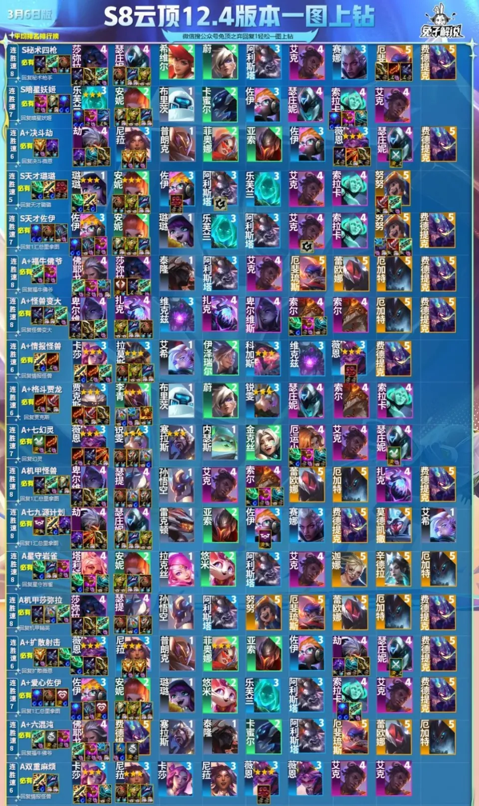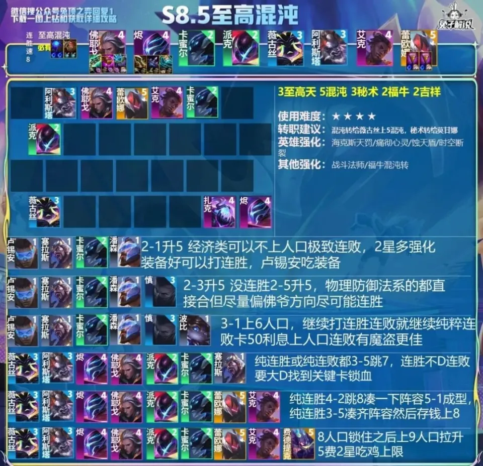 这个版本非常的平衡,版本平衡体如今已往的版本都是百变的过渡终极卷一个最强,其他阵容不天胡是不能打T0的,而这个版本只要是强势的阵容只要能成强度和过渡都是差不多的,真的可以说是汗青赛季真正完全全部阵容平衡的版本了,而且各个阵容都极具特色,秘枪四枪或九五、决斗劫/扩散或三星VN、五天才璐璐圆盾波比、暗星/对准妖姬、七幻灵/吞噬恶行扩散五幻灵、武器、谍报整整七大运营什么胡就能玩什么,赌狗的天胡版本也非常多,实战和强化德子、金钟罩、卡密尔、迸发璐璐、弹射船长、怒之鳄鱼、咒能EZ、不屈蔚、弑君塞拉斯、刀锋男刀、恶行金克丝、精准猫、火炮叠狗头、坚如磐石墨菲特,弱势但假如天胡的源筹划、岩雀、混沌也是可以玩的。 开局魔盗9连败 这局完全不慌 要说逆转连胜锁血 还得看我大佛爷 尤其是4费烬的到场 更是让新赛季混沌的上限彻底拉满 成型吃鸡更是一种享受 佛爷一旦启动 斩斩斩游戏就竣事了 开局利滚利思绪立即清楚 直接20块钱开吃最大利钱 直接5连败走起经济爆炸 血量是个最没用的东西请你忘记它 魔盗在手必须开贪 来的早那就是神器无敌 来的晚咱就贪点小钱 正常3-5上7大D一波开始转连胜 这局咱利滚利另有不少血量完全不慌 直接上8生齿凑齐3至高天加5混沌 预备开杀 假如佛爷和烬不能直接2星 记得机动的使用怪兽 记着混沌的装备肯定要极致暴力 佛爷和烬只要有一个2星那就能锁 有5费2星大概多风天气 5混沌也不是那么刚需 上9生齿找到蕾欧娜 拘束直接拉满 搭配一些5费2星直接开启屠杀模式 这种高上限的阵容 绝对是虐菜上分吃鸡的一把能手 练起来绝对不亏 看到这点个赞 兔年上大分 |