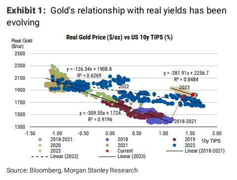 摩根士丹利以为,黄金和现实收益率的传统关系已经逆转。 摩根士丹利分析师 Amy Sergeant 等在最新陈诉中表现,从汗青上看,当美国现实收益率靠近或低于零时,黄金代价与其出现出非常强的负相干关系。2018年到2021年间的数据回归表现,当现实收益率上升时,金价下跌。 这意味着当美联储在这种环境下实行刺激性钱币政策时,金价就会上涨。除客岁外,已往15年的大部分时间都是云云。但从客岁开始,黄金与现实收益率的这种稳固关系被突破了。 大摩指出,2022年开始,当现实收益率开始上升时,金价并没有大幅下跌:2022年下半年现实收益率从0.67%上升到了1.57%,按照2018年至2021年的趋势,金价应该下跌约18%。但是现实环境恰好相反,金价颠簸并不大。 大摩以为,这紧张是源于市场避险需求的增长。但从ETF持仓和头寸中可以看出,避险需求现实上只在第一季度刺激了资金流入,实物需求是否也在发挥作用仍不得而知。 天下黄金协会的数据表现,2022年环球黄金需求增长了18%,到达728吨,为2011年以来的最高水平。环球央行的黄金需求同比增长150%,到达685吨,创汗青新高,抵消了黄金ETF的流出。在大摩看来,这可以在肯定水平上表明黄金代价的韧性。 大摩以为,从2023年前两个月的数据中可以看出,金价和现实收益率已经规复到一个更“正常化”的关系,此前的趋势已经被突破重置。新的趋势线表明,在本年,黄金对现实收益率变更的反应大概比2022年更剧烈。 1月初,大摩夸大了看涨黄金的观点,其时美元走弱,现实和名义收益率都在降落。然而宏观形势自那以后就恶化了——美国更强劲的数据使经济学家预计美联储在2024年3月才举行初次降息。 但由于10年期美债收益率隔断2022年的高点不远,而且收益率曲线的移动在汗青上不绝先于降息,金价的机遇大概在下半年出现,大摩维持对金价到达2160美元/盎司的观点。该机构以为,央行的黄金购买大概会放缓,但珠宝和技能需求大概会因中国需求复苏而得到提振。 本文来自华尔街见闻,欢迎下载APP查察更多 |