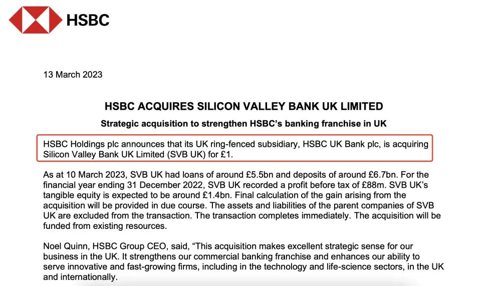 本文泉源:期间财经 作者:周立 张汀雯 图片泉源:Pixabay 3月13日下战书,汇丰控股(00005.HK/HSBC.N)以1英镑的代价收购了硅谷银行英国子公司(SVBUK),据当天汇率换算约为8.36元人民币。 在被《福布斯》杂志评为美国最佳银行仅3天后,硅谷银行(SVB)在建立40周年之际轰然坍毁。3月10日,硅谷银行美国加州金融掩护和创新部(DFPI)公布关闭硅谷银行,并由美国联邦存款保险公司(FDIC)接受。 图片泉源:硅谷银行官网 硅谷银行位于地处高科技企业云集的圣塔克拉拉谷,告急服务于科技型企业,如Facebook、Twitter等。硅谷银行在美国拥有27家服务处,商业关系网遍布亚洲、欧洲等地域。 硅谷银行停业之后,雷蛇团结首创人兼首席实行官陈民亮(Min-Liang Tan)体现,Twitter应该收购硅谷银行,而马斯克对此则持开放态度。 除了8块钱收购硅谷银行英国子公司的汇丰,以及传言中的Twitter之外,美国汗青上倒闭的第二大银行留下的“烂摊子”,尚有谁会来接盘? 在美国,多方虎视眈眈 硅谷银行停业后,纳斯达克敏捷公布停息其买卖业务,并将停牌直至满足提供更多信息的要求。以后,标普500指数将硅谷银行剔除,Insulet取而代之成为标普500指数成份股。而美联储发言人也立即体现,硅谷银行首席实行官Greg Becker将不再是旧金山联邦储备银行的董事会成员,该去职于3月10日马上见效。 同时,联邦存款保险公司已成为硅谷银行的接受人。为了掩护投生存款人,联邦存款保险公司创建了圣克拉拉存款保险国民银行(DINB),硅谷银行全部受生存款将转移到DINB。作为接受人,联邦存款保险公司也将生存硅谷银行的全部资产,以备日后处理。 停止2022年12月31日,硅谷银行的总资产约为2090亿美元,总存款约为1754亿美元。硅谷银行留下的“遗产”非常丰厚,各方也对其虎视眈眈。 美国财经媒体Semafor报道称,对冲基金拟以低至面值60%的代价收购硅谷银行的创业公司存款,对这一扣头,美媒利用了“Steep”(陡峭)一词。这一极低的出价也反映出该行资产被出售或整理时未受生存款终极被追回的预期。 另据美国科技媒体The Information此前报道,华尔街著名投行Jefferies也在接洽存款在硅谷银行的创业公司,提出以扣头价收购他们的存款索取权。 如今联邦存款保险公司已经启动对硅谷银行的拍卖步伐,The Information以为,较小的地域银行是最有大概的买家,由于羁系机构不想将硅谷银行出售给摩根大通或美国银行等大型银行。 而曾与银行业务无关,但被硅谷银行提供过贷款的Twitter,也在大概接盘硅谷银行的候选名单上。雷蛇团结首创人兼首席实行官陈民亮(Min-Liang Tan)体现,Twitter应该收购硅谷银行,成为一家数字银行。马斯克则复兴称,他对这个观点持开放态度。 除了外界各股“权势”的虎视眈眈之外,硅谷银行子公司也在寻求回购公司的方法。硅谷证券(SVB Securities)的负责人Jeff Leerink和他的团队正在寻求资助,为潜伏的管理层收购提供资金。 在英国,8块钱被甩卖 3月13日下战书3点,汇丰控股公告称,其英国的子公司(ring-fenced subsidiary)汇丰英国银行有限公司(HSBC UK Bank plc)以1英镑的代价收购硅谷银行英国有限公司。 图片泉源:香港买卖业务所汇丰控股公告 上述公告体现,停止2023年3月10日,硅谷银行英国子公司的贷款约为55亿英镑(约合人民币458.64亿元),存款约为67亿英镑(约合人民币558.84亿元);2022年其税前利润为8800万英镑(约合人民币7.34亿元)。硅谷银行英国子公司有形权益预计约为14亿英镑(约合人民币116.77亿元)。 汇丰控股提到,硅谷银行母公司的资产和负债不在买卖业务范围内。此次买卖业务的收购资金将泉源于自有资金,汇丰控股将在2023年5月2日发布的2023年第一季度业绩陈诉中向股东提供关于此次收购的最新情况。 该消息看似来得突然,却早有蛛丝马迹可觅。 英国时间3月13日上午,天空消息发布《汇丰银行即将救济英国硅谷银行》报道称,汇丰银行预备与当局一起公布,已告竣收购硅谷银行英国子公司的协议。报道中还提到,英国央行体现,预计全部储户的钱都是安全的,硅谷银行英国子公司将继续在汇丰银行英国有限公司的全部权下正常运营。 上周末,英国央行便计划向法院申请,将硅谷银行英国子公司纳入银行停业步伐。英国央行称,3月10日公布硅谷银行英国子公司资不抵债时,该公司拥有近70亿英镑存款。此前,英国金融时报曾称,英国当局寻求利用中东资金收购硅谷银行英国子公司。 天空消息称,“当局认识到,鉴于硅谷银行对其客户的告急性,它的失败大概对科技生态体系的运动性产生庞大影响。英国当局把这个题目作为一个高度优先事项,英国宰衡、央行行长和财政大臣在周末举行了讨论。” “当局正在加紧订定一项办理方案,以制止或只管淘汰对英国的一些最有出息的公司的陵犯。我们将立即提出操持,以确保硅谷银行英国客户的短期运营和现金流需求都可以或许得到满足。”上述报道称。 在汇丰发布公告后,英国央行体现,英国的银行体系是健全的。“没有其他英国银行直接、实质性地受到硅谷银行母公司决定的影响。” 汇丰团体首席实行官诺埃尔奎因(Noel Quinn)体现,“此次收购对我们在英国的业务具有很好的战略意义。它加强了我们的商业银行专营权,进步了我们为科技和生命科学等范畴的创新和快速发展的企业提供服务的本事。” 同时他还体现,欢迎硅谷银行英国子公司的客户到场汇丰银行,也热烈欢迎该