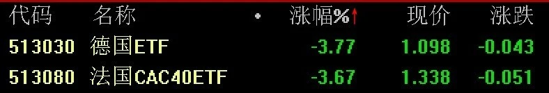 每经记者:叶峰每经编辑:肖芮冬 欧股重要指数昨夜收盘普跌,德国DAX 30指数跌2.88%,英国富时100指数跌2.55%,法国CAC 40指数跌2.87%,欧洲斯托克50指数跌2.98%。 受此影响,多只跟踪欧洲股指的跨境ETF本日团体调解,德国ETF、法国CAC40ETF跌超3%。 逐日经济消息 |