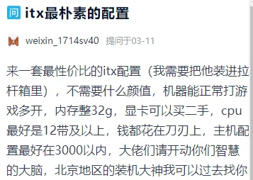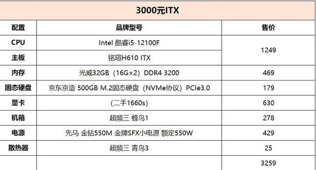 ITX小整机是比年来渐渐盛行的趋势,它更小巧便携,雅观度也更胜一筹。但代价较高、搭配难度较大不绝困扰着玩家,本日来分享一位题主的3000元攒ITX整机。 3000元内还要12代处置惩罚器的ITX整机太难了,除非一套都是二手,下面我们分开来说说。 起首ITX主板就要比一样寻常的贵一些,我们选择一套最自制的12100F+H610 ITX铭瑄主板。 内存方面,由于H610的ITX主板都是双内存插槽,以是必要选择16GB×2的。但由于预算限定的比力死,以是只能上光威这类的牌子。 电源只能SFX,但大部分SFX都比平凡电源更贵,550W是为了预留显卡供电,先马这个金牌电源还是比力划算的。 存储的话,紧着自制的来吧,京东京造这个优点是真自制,缺点就是pcie3.0,相比现在的pcie4.0来说,速率慢了不少。而且它究竟不是什么专门做存储的品牌。 现在为止,已经花掉了2736元。但是……这还没算机箱,按照题主的要求,要能装进拉杆箱,直接找最小最自制的吧。 超频三的蜂鸟1,充足小巧自制,尺寸为308×128×190mm,我们就假设题主的拉杆箱是最大号的,装下它还是绰绰有余的。 别的12490F的散热题目不敷为惧,原装散热器就好,再不可买一个ITX专用散热器。 零零总总算下来,已经花掉了2629元,这还是没有算最大头的显卡,不外按照题主说的,可以或许继承二手,能上网淘一张16系或20系的入门卡,大概能在3000出头拿下。 显卡的话,即便是卡诺基如许纯纯的矿卡,3060ti也在1800多元,大部分1660s在600多元。以是即便是二手显卡,想要一张像样的,总预算也要在4000元了。 (8137391) |