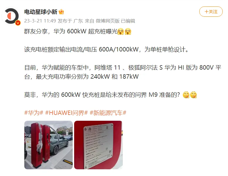 IT之家 3 月 21 日消息,据 @电动星球小新 消息,有网友提供了一组华为自主研发生产的 600kW 超充桩无伪装实拍图。从实拍图来看,华为研发的超充桩团体造型方正,并利用了极为显眼的赤色配色,底部处设有散热装置,为单桩单枪计划。 从这一超充桩的铭牌来看,其制造厂商为华为数字能源技能有限公司,外部尺寸为 295*340*1700mm,产物型号为 DT600L1-CNA1。该充电桩输出电压范围为 200-1000V,最大输出电流为 600A,最大输出功率为 600kW。 值得一提的是,IT之家查询现在华为已赋能的新能源汽车品牌发现,包罗阿维塔 11 以及极狐阿尔法 S 华为 Hi 版在内的多款车型最大充电功率均低于 600kW,显着无法适配。 |