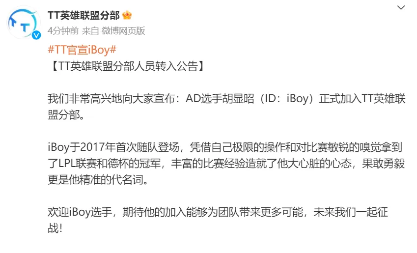 LPL春季赛通例赛即将竣事,但是没想到尚有战队在举行职员的变动。在通例赛末了一周的时间,TT这边官宣了下路新选手的到场,消散在赛场上有一段时间的Iboy到场了。 TT官宣的原文如下,表现iboy正式到场TT,而且歌颂了iboy在过往职业生活中的表现,认可了他的大心脏和敢打敢拼的心态,末了就是欢迎他的到场,等候他可以为TT带来更多的大概性。 对于iboy来说,这个肯定是一件功德。由于iboy从春季赛开始就没能找到工作,反面上了《饭堂》也公开喊话盼望可以重回赛场,反面又在微博上表态想要继续打比赛,以是他可以或许再次回到LPL联赛之中,终于实现了自己的愿望,也肯定会改掉客岁的一些标题,积极打出精彩的表现。 只不外很多TT的粉丝面临iboy到场这个消息,由于焕烽在近来的比赛中,打得挺好的,很多粉丝以为现在的iboy未必有焕烽打得好,近来焕烽状态也很好,盼望不要瞎轮换,导致自己比赛败北。 焕烽近来确实打得挺好的,特殊是在面临TES的时间,他的厄斐琉斯一改畏畏缩缩的常态,狂风闪现向前输出,接济了差点被翻盘的比赛,让各人眼前一亮。进步很大,以是很多粉丝也都看在眼里,非常支持焕烽继续打。毕竟iboy这边很久没打比赛了,状态怎么样还不好说,客岁在RA又打得特殊差,以是没法让粉丝们信任。 而根据前V5锻练涵艺的透露,iboy签了一个月的短约到场TT,这也是焕烽近来打得这么好的缘故因由。 以是应该是TT管理层想要学习BLG,买了lvmao后,ON打得特殊好。TT这边也买了iboy,给焕烽压力,引发他越打越好。别的iboy固然客岁打得差,但是曾经也有过高光表现,而且应该是在试训时表现不错,以是才得到了TT管理层的青睐。就看反面首发的安排吧,TT现在晋级季后赛还是有盼望的,盼望不会由于瞎轮换而导致功亏一篑吧! 那么,对于这波TT的职员变动,你们有什么想说的吗?你们以为iboy和焕烽谁更恰当TT呢? |