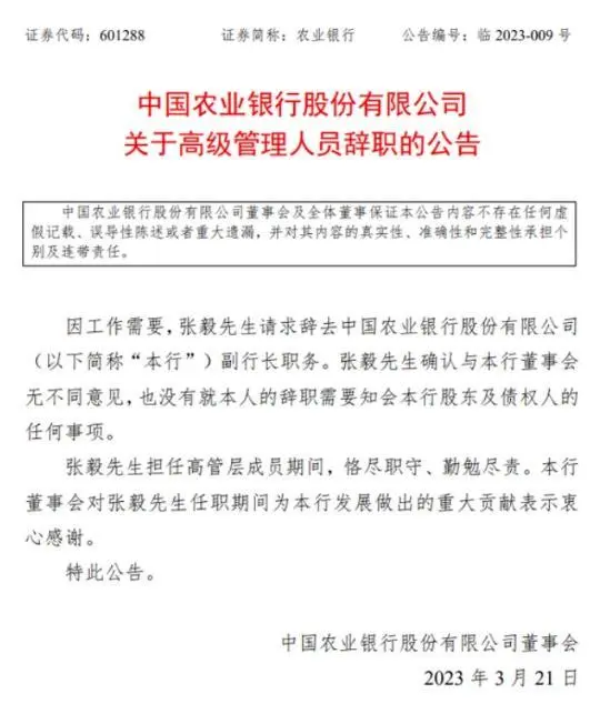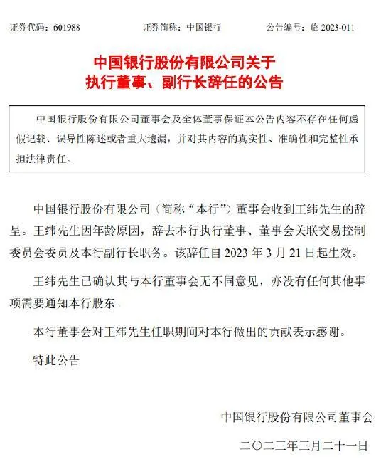 继中国银行董事长辞职后,中国银行、农业银行副行长也辞职了! 中国银行副行长辞职 3月21日下战书,中国银行公告,董事会收到王纬的辞呈。王纬老师因年龄缘故原由,辞去本行实行董事、董事会关联生意业务控制委员会委员及本行副行长职务。该辞任自3月21日起收效。王纬老师已确认其与本行董事会无差别意见,亦没有任何其他事项必要关照本行股东。 同日,中国银行发布了“H股公告-董事名单与其脚色和职能”,详细如下: 据中国银行官网体现:王纬,自2020年6月起任本行实行董事,2019年12月起任本行副行长。2019年加入本行。2018年2月至2019年11月担当中国农业银行股份有限公司实行董事、副行长,2013年12月起担当中国农业银行股份有限公司副行长,2011年12月任中国农业银行股份有限公司高级管理层成员。 此前曾任中国农业银行宁夏区分行副行长、甘肃省分行副行长、甘肃省分行行长、新疆区分行行长、新疆兵团分行行长,总行办公室主任、河北省分行行长、内控合规部总司理、人力资源部总司理、三农业务总监等职务。 1983年结业于陕西财经学院,2015年结业于西南财经大学,得到经济学博士学位。具有高级经济师职称。 而就在两天前的3月19日晚间,中国银行发布公告,公司董事会收到刘连舸的辞呈。刘连舸因工作调解,辞去中国银行董事长、实行董事、董事会战略发展委员会主席及委员、企业文化与消耗者权益掩护委员会委员职务。该辞任自2023年3月18日起收效。 履历体现,刘连舸,1961年出生,1987年结业于中国人民银行研究生部,获经济学硕士学位,具有高级经济师职称,自2019年7月起任中国银行董事长。 农业银行副行长辞职 3月21日晚间,农业银行公告称,因工作必要,张毅哀求辞去副行长职务。张毅确认与本行董事会无差别意见,也没有就本人的辞职必要知会本行股东及债权人的任何事项。 “张毅担当高管层成员期间,恪尽职守、勤勉尽责。本行董事会对张毅任职期间为本行发展做出的巨大贡献体现衷心感谢。”公告体现。 履历体现,张毅,出生于1971年,是中国人民大学工商管理硕士,高级管帐师。此前曾任中国创建银行资产负债管理部副总司理,江苏省分行副行长、行长,总行财务管帐部总司理,中国创建银行首席财务官兼财务管帐部总司理。2021年11月起,张毅任农行副行长,到现在辞职,任职时间不到一年半时间。在农业银行任职期间,张毅照旧主管财会工作负责人、财会机构负责人。 张毅是年内农行第三位辞职的董监高人士。 2023年2月初,监事长王敬东因年龄缘故原由辞职;同年2月末,首席风险官李志成因年龄缘故原由辞任。 现在,农业银行高管层还剩“一正4副”行长,外加一董事会秘书。行长为付万军、副行长分别为张旭光、林立、徐瀚、刘加旺;董事会秘书为韩国强。 同日(3月21日),中央纪委国家监委网站体现,据中央纪委国家监委驻中国农业银行纪检监察组消息:中国农业银行国际金融部巡视员刘燕忠涉嫌严峻违纪违法,现在正继续中央纪委国家监委驻中国农业银行纪检监察组和辽宁省本溪市监委规律查察和监察观察。(泉源:中央纪委国家监委网站、公司官网、公司公告;整理:方凤娇) 编辑:李云鹏 |