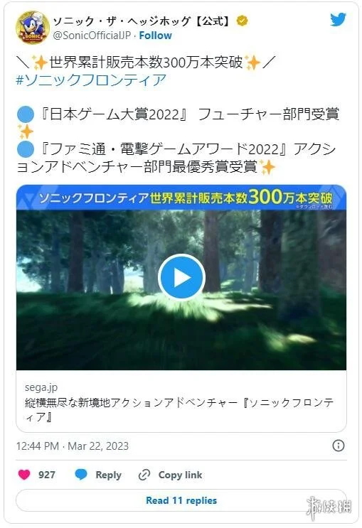 世嘉正式公布,开放天下动作冒险游戏《索尼克:未知国土》的环球销量已经突破了300万套。该游戏销量的上一个里程碑是在2023年2月10日到达的,其时游戏的销量到达了290万套。而《索尼克:未知国土》的销量显然超出了世嘉的预期。 《索尼克:未知国土》于2022年11月8日发售,该游戏将开放天下设定引入到了索尼克3D跑酷动作游戏中。索尼克须要探索“星落岛”,在探索过程中,他将会与秘密的智者和泰坦们发生辩论。在秘密声音的指引下,索尼须要一起战斗一起网络混沌翡翠,并终极把囚禁中的Amy、Tails和Knuckles调停出来。 《索尼克:未知国土》现已登岸XB1/XSX/XSS/PS4/PS5/PC/NS平台。游戏的最新DLC“Sights, Sounds and Speed Update”已于昨日正式上线。 |