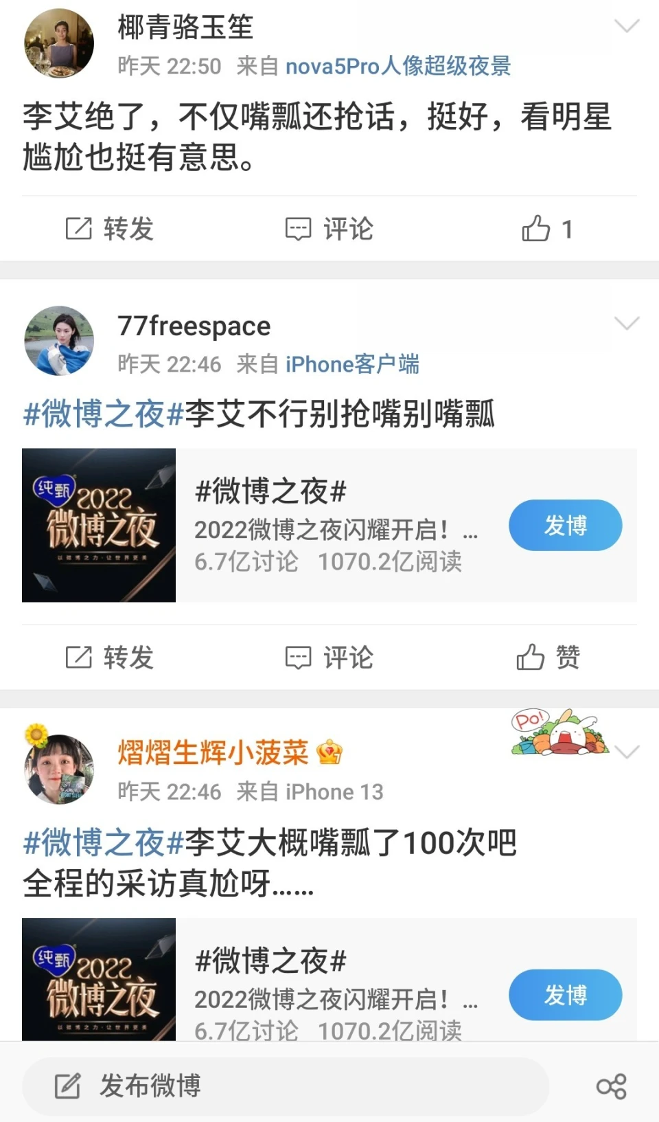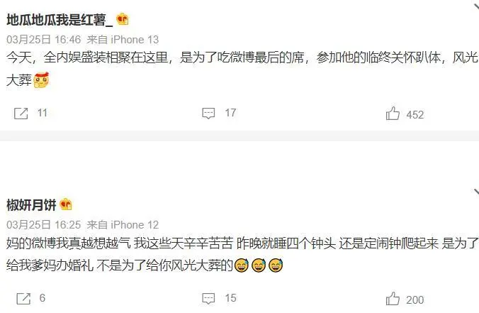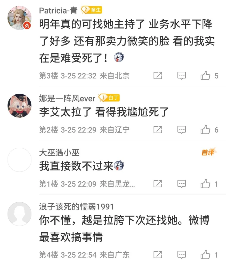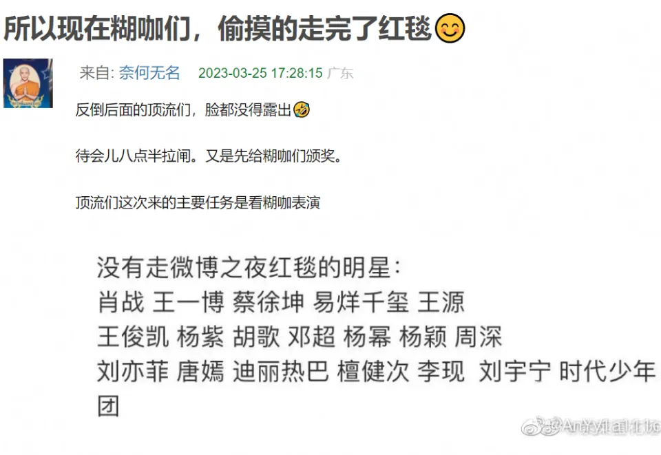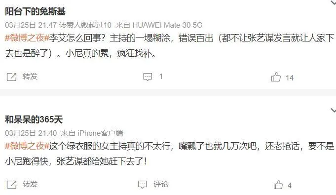 微博之夜,已经无语到让我不知道说什么好了,支持我写这篇稿子的动力就是:全网都恳切祈祷这是末了一届微博之夜,既然全程围观了史上最尴尬分猪肉——哦不是,颁奖运动,好歹也要给它写一篇悼文。 这是疫情之后惆怅的一次娱乐圈盛事,微博提前预热好几天,粉丝被明星绑架,不得不线上线下地共同微博送热度,让围观群众看了好几天的热闹,谁知,末了一天即将开始时,直播却反复克制,红毯更是被告急叫停。 然后 ,这齐备的锅,天然还是粉丝来背。 我的发起是,前几天梅奔夜排,粉丝露宿陌头的样子太丢脸了,本着内娱向来“粉丝举动偶像买单”的原则,有一家算一家,通通点名品评。 重点品评那些所谓“逆应援”变相鼓励粉丝应援的,代表:龚俊、杨幂、虞书欣。 这么心疼粉丝,宴客用饭,那么头天晚上上海那么冷粉丝淋雨挨冻的时间,为什么不劝他们回家? 更可笑的是,走红毯跟官宣的序次一样,也是越今后咖位越大,结果前面小明星先走完红毯,然后官方公告红毯取消,背面那些穿了一身大牌做了半天造型准备美美艳压的大咖们傻眼了。 算了,前面懒得说,咱直接说“颁奖礼”有多杂乱多无聊多尴尬吧。 主持人尼格买提不说了,尚有一个司雯嘉,全程看提词板,另一个李艾,也算是老牌主持人了,全程笑得用力到眼睛都没了、让人幻视杜华也就算了,更可骇的是,嘴瓢频率高到已经让人数不外来全场到底有多少次口误了。 在李艾打告终的舌头下,于文文变成“云文文”,惠英红变成“卫英红”…… 最最搞笑气死粉丝的一次口误是,年度剧集,她居然把《与君初相识》说成了“与君初相死”,然后紧接着《好似故人归》又变成了“好似古人归”…… 最最致命的是,张艺谋上台给易烊千玺颁完奖之后,她居然让国师先下去苏息!!! 还好尼格买提追上去调停了一把——毕竟,人家老谋子还想给心爱的四字撑场子说两句,哪儿能上来遛一圈就走? 网友:你到底行不可,不可就换朱丹上! 李艾:在反省了,在反省了。 呵呵,多半跟朱丹一样,老实认错,下次还敢! 真的已经对内娱主持人的程度绝望了。 但是为什么如今主持人程度团体下滑动不动就嘴瓢口误呢? 由于只有如许才有热度啊!像微博这种自身拉胯的主理方,最喜好请如许带来争议的主持人了,各人团体吐槽,流量不就来了吗? 下次还请! 就是这么一群主持人,尤其是两位女主持人,全程只听她们仿佛自说自话一样的聒噪,积极想生动氛围然而却积极积极白积极,现场的明星高朋们更是犹如不会语言的提线木偶一样。 特殊是最开始上台分猪肉——哦不是,领奖的明星,都是批发一样缄默沉静地列队上台,上台之后缄默沉静地找到本身的奖杯(没错礼仪小姐只负责捧着一束看着非常寒碜仿佛采购吃了背工的花,不负责发奖杯…… 然后他们继承缄默沉静地在台上站一排,末了缄默沉静地列队下台。 要不是这个运动,谁知道内娱尚有这么多哑巴呢! 你要说是由于到场运动的明星太多时长有限,以是要加快流程不给各人发表获奖感言的机会,那,主持人少说点尴尬到让人脚趾抓地的话,把时间匀给获奖人不好吗? 着实不可,你砍掉那些除了粉丝根本没有任何人想看的演出节目呢? 蔡徐坤一开口唱歌,“难听逆耳”这个关键词又火了,我也不是说身为歌手的他唱歌难听逆耳,当初的《恋人》还是挺好听的,但这次都唱的啥? 五音不全的龚俊,也上台跟刘宇宁合唱了,笑死,要不是他的cp已经殉了,跟他对唱的是不是就是另一位了? 末了微博King和Queen都颁完之后,合法我以为这漫长的尴尬终于要竣事了我可以洗洗睡了的时间,忽然听到李宇春的名字,内心咯噔一下,差点以为新浪终极还是要再给她安排一个压轴的奖项,没想到原来是唱歌,唱的是…… 周末愉快,祝你周末愉快! ……你看我像愉快的样子吗? 唯一愉快的是,终于摆脱了。 然后,新浪的势利眼体如今方方面面,好比每次都让人布满讨论欲望的座位表…… 再好比,上台拿个奖杯就走的只针对职位不敷的小明星,越今后猪肉越肥——哦不是,奖项越紧张,领奖的大明星于是就有机会在台上多停顿一会儿。 但是我想,他们应该也不是很乐意在台上多停顿。 尤其是次次被当猴耍的85花。 真的,太陵暴人了,你怎么不去耍李冰冰那些大花呢?你怎么不去耍同咖位的男明星呢? 然后,客岁《梦华录》《去有风的地方》让刘亦菲有了作品傍身,成了这一届的Queen,于是她就可以不消像上一届一样跟其他85花一起被耍了。 剩下的,杨幂刘诗诗以及谁人谁,大概就是心一横真把本身当成不能语言的猴子了吧,共同主持人玩吧,反正末了挨骂的也不是我。 由于特殊缘故原由缺席微博之夜的唐嫣,算是“逃过一劫”,不错,当晚尚有一件非常离谱的变乱:“唐嫣去哪了”冲上热搜之后忽然被炸了。 这事儿也得重新提及。 原来,唐嫣是跟刘诗诗同一批官宣的,再加刘亦菲和杨幂,吃瓜群众早就知道这次仙剑重聚肯定会是重头戏。 然后中场时分,新浪发了一张“世纪同框”:胡歌坐在中心,左手边刘诗诗杨幂,右手边刘亦菲,《仙剑一》《仙剑三》都圆满了。 网友:拍照师是没有关照美国人看镜头吗? 固然,最紧张的题目还是,唐嫣去哪儿了呢? 我一开始,以为是新浪太势利眼了,A区二排C位这一列是仅次于A区一排C位列的好位置,唐嫣由于淡出各人视野太久过气了以是“不配上桌用饭”,还痛骂了新浪一顿,没想到…… 原来唐嫣当晚是跑去到场品牌