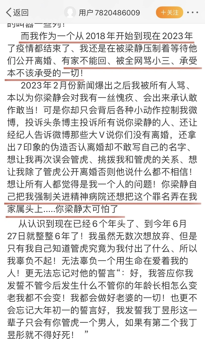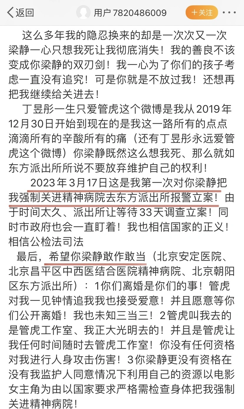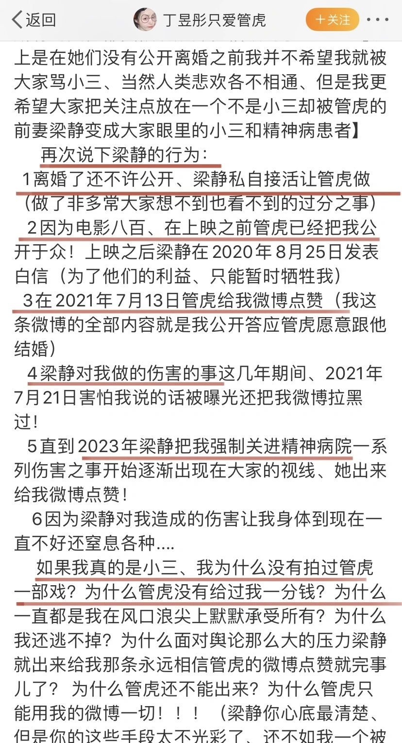 有关管虎和梁静婚变一事闹得沸沸扬扬。 因由是演员丁昱彤连续在网上喊话管虎、梁静,让他们官宣仳离的事变,丁昱彤即便被封号也不依不饶,开了新号接着喊话。 仅3月25日一天,丁昱彤就连发数文,艾特管虎,对其表明,并称会在存案之前官宣仳离的消息,表现信任他末了一次。 这里的存案指的是女方状告梁静逼迫将关进精神病院一事,丁昱彤在3月17日已经报警了,但是存案须要时间。 丁昱彤连续在网上喊话,但是管虎和梁静不停没有回应过,本以为丁昱彤是在唱独角戏,但是发现事变并不简朴,管虎和梁静之间简直出了标题。 昨天是微博之夜,身为导演的管虎和老婆梁静也现身现场了,但是夫妻之间的反面从走红毯环节都表现出来了。 管虎刚一上红毯立定之后,就把挨着梁静的那只手背在了死后,导致想要挽手的梁静好尴尬,梁静机敏应变,用挽袖子的动作粉饰了她的无奈和尴尬。 两夫妻同台,管虎不但不牵她的手了,连挽手机遇都没有,红毯过程中梁静好频频想挽着管虎胳膊,但是管虎却始终刻意把手背在背面,就是不给挽。 管虎真是一点面子都不给梁静。 到了内场之后,管虎也是手机不离手,看上去不以为意。 丁昱彤还发文称管虎很累,信任他。 身边的梁静拍视频的时间把镜头给到了管虎,想给管虎拍个照片,但是管虎不但不共同,更是一脸嫌弃,还直接瞪了梁静一眼。 除了昨天的运动中两夫妻冷脸不互动之外,在3月15日英皇举行的运动中仍旧云云。 其时,管虎和众星合影的时间挽动手,黑着脸,心情非常不好,也反面身边的梁静互动,两人就像是互不相识的生疏人一样。 种种迹象表明,梁静和管虎婚姻真的出了大标题,看上去非常反常,要知道管虎和梁静之前加入运动的时间都是笑眯眯的,夫妻俩感情很好,而梁静很爱老公管虎,曾直言:我可以为他死。 恩爱夫妻酿成如许,肯定是不正常的。岂非真如丁昱彤所说的两人早已在2018年就协议仳离了? 此前丁昱彤发布了千字长文控诉梁静折磨侮辱本身,以致被送进精神病院,而且表现管虎和梁静早已感情反面,两人在2018年就协议仳离,但是其时恰逢《八佰》上映,丁昱彤选择了相安无事。 丁昱彤不停在等管虎仳离,而且坚称本身不是小三,和管虎是真爱,管虎梁静之间已经没有爱情了。 3月26日,丁昱彤再次发出长文控诉梁静六点内容。 与此同时,丁昱彤还晒出了本身所说的点赞截图,被梁静投诉的截图,尚有梁静的点赞内容,可以说是信息量很大。 此中丁昱彤表现两人仳离了但是不许公开,梁静擅自接活给管虎做,还称这些事变很太过。 其次丁昱彤表现原来管虎要官宣她,但是由于影戏《八佰》上映临时断送了她。 别的,管虎在2021年7月管虎还点赞了她的微博。 之前丁昱彤还晒出了本身和管虎的的谈天内容,管虎对丁昱彤是自动关心,只是时间在2018年,也就是丁昱彤所说的二人相识时间。 紧接着,丁昱彤控诉梁静这些年对她的伤害不停都有纪录,2023年被逼迫关进精神病院,有医院的证实。 在上一次的千字长文控诉中,丁昱彤详细形貌了这六年的时间里怎样被梁静折磨侮辱,被助理打耳光,以致告知她奶奶做小三,被送进精神病院等干系事件。 末了,丁昱彤表现如果本身真的是小三,为什么没有拍过管虎一部戏?没有收过他一分钱?为什么还要在风口浪尖上岑寂蒙受全部。 丁昱彤的喊话是在说他们是真爱,否认本身是小三,不停在等管虎官宣。 丁昱彤从几年前就开始喊话,到现在账号都被换了三个了,但是管虎仍旧没有回应她。 不外从近来两次运动中的表现来看,管虎和梁静之间没有变数是不大概的,只是丁昱彤到底是什么身份,还得管虎来官宣才行,她到底是不停在唱独角戏,照旧两人真的是真爱,我们坐等后续更新。 【发展路上,感谢关注】 |