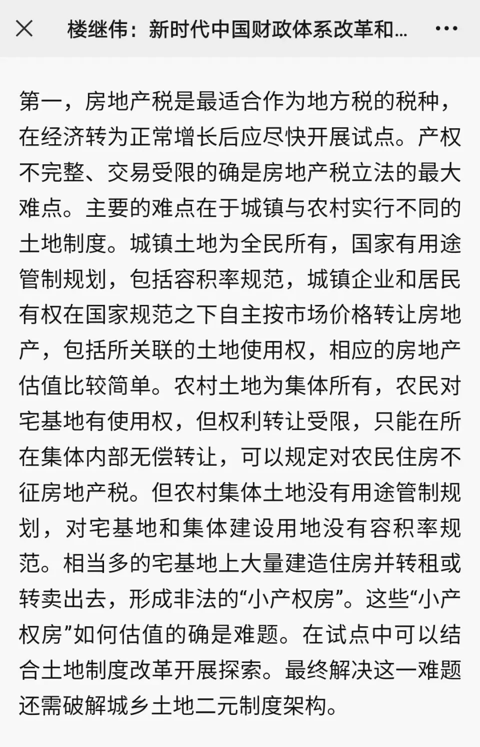 原创 刘晓博 3月26日,多家媒体转发了前财政部长楼继伟的一个紧张观点: 房地产税是最恰当作为地方税的税种,在经济转为正常增长后应尽快开展试点。 楼继伟是在《比力》发表《新期间中国财政体系改革和未来推测》一文中,表达上述观点的。 他的原话是: 这是在投石问路吗?房地产税试点的脚步真的近了? 房地产的立法是由天下人大预算工作委员会牵头,财政部、国家税务总局予以共同。 看起来,财政部只是“共同”的职位,但究竟上它的作用非常大,到达无可更换。 好比2021年10月23日,天下人大通过了“授权国务院在部门地区开展房地产税改革试点工作的决定”。第二年,也就是2022年3月16日,由于房地产市场非常低迷,财政部公布:试点推迟。(下图) 作为前财政部长,楼继伟固然认识房地产税立法的来龙去脉,面临的困难、争议在那边。 当他发起“经济转为正常增长后应尽快开展试点”时,信号意义是不能忽略的。 究竟上,早在2022年12月28日我在“刘晓博说财经”公众号发表的“关于2023年的23个推测”中,就发起早点让房地产税试点落地。 我的来由是:房地产税悬剑效应对楼市伤害太大,早日发布一个理性的、温暖的房地税试点方案,有利于楼市走稳。 楼继伟发起“尽快开展试点”,则是从办理地方财政压力、低沉负债率角度思量的,这固然也是紧张来由。 由于房地产低迷,2022年天下卖地收入淘汰了2.02万亿(下图): 财政部官员克日曾表态,“土地出让收入降落影响并没有那么大;若按照2022年土地出让收入减收约2万亿元匡算,影响地方一样平常公共预算财力约3000亿元。” 但我们要看到题目标另一面:外貌上看,客岁卖地少了2万亿,实际出让金收入6.69万亿。但此中40%以上是地方国企大概融资平台接盘,相称于地方政府左手卖右手。 如果地方融资平台不托市,则2022年天下卖地收入大概只有3.5万亿左右,那对经济的影响就大了! 下图是停止2021年末,各省市政府的“债务率”(债务÷地方年度财政总收入)和“负债率”(债务÷本地GDP)。此中广义部门,包罗了城投债;非广义部门,没有包罗城投债(只是平凡地方债+专项债)。 可以看出,各地的广义债务率和负债率都已经比力高了,就连北京、天津如许的中心都会都不例外。 这种环境下,为了维持经济落伍、生齿流失地区的运转,中心中心对地方转移付出到达了创记录的9.71万亿元,增长17.1%。 很显然,地方政府必要找到一个张稳固的“恒久饭票”,变乱已经非常告急了。 在美国,地方政府的恒久饭票就是房地产税。 好比美国县级政府的花销中,靠近80%来自房地产税。我曾看到过一个数据:按照 2012 年的数据:全美县级政府的财政总收入为 5850 亿美元,房地产税为 4608 亿美元,占比为 78.9%! 那么:中国2023年有没有大概启动房地产税试点(换一种说法是“扩大房地产税试点”,由于重庆、上海已经在试点了)? 我的见解是:大概性不算小。 缘故原由就是上面说的两个:第一,地方政府财政压力巨大,急必要推进房地产税立法;第二,早点公布一个温暖的方案,让“靴子落地”,反而有利于楼市的稳固。 至于楼继伟在文章里说的部门房产估值困难,我以为换一个思绪是不存在的。 所谓估值困难,是说军产房、集资房、小产权房、违法修建等,无法流畅、买卖业务,以是很难估值。既然很难估值,就很难征税。 实在,这是思绪没有打开而已。 环球房地产税征收有两种模式,一种是美国式的,按照房屋的估值征收。好比1套房子市场价是100万美元,政府打7折给出征税评估价,按照70万美元来征收。如果税率是1%,每年房地产税就是7000美元。 别的一种是新加坡式的,是按照房屋出租能得到的租金来征收。只不外人家新加坡比力仁慈,无论你是四个睡房的住房,照旧2个睡房的住房,都按照对外出租1个睡房来盘算“租值”,按照1个睡房每月出租的代价来盘算房地产税。 如果用“租值法”征收,就不存在估值困难的题目。 好比:甲的房子是高档商品房,3个睡房,对外出租每月1万元、每年12万元。如果按照10%的税率,每年就是1.2万元的房地产税。 乙的房子是城中村、农民房,每月市场租金是1500元,每年是1.8万元。按照税率10%盘算,每年房地产税是1800元。固然,鉴于这种房子没有缴纳过土地使用金,可以设置较高税率,好比15%来征收。 征收房地产税,肯定要思量老百姓的遭受本事。 在美国,匀称每套房的房地产税,低于这套房子同期的水电费。(下图) 差异地方的税率差异非常大。好比在美国,税率最低的是夏威夷州,税率只有0.28%。最高的新泽西州到达了2.49%(以上均为2021年纪据)。 未来中国房地产税率也会千差万别。 权衡房地产税率是否恰当,关键看两点:起首看老百姓是否能负担得起,其次地方政府的收入是否够用。 由于生齿红利、土地红利都日渐式微,未来政府也必要精兵简政,不能再让那么多人吃财政饭了。 都会和都会之间,省和省之间,存在着剧烈的竞争关系。好比,如果广州的房地产税率偏高,企业、个人肯定会流向深圳;反之,亦然。 生齿流失、经济阑珊地区如果开征房地产税,肯定会让更多的人用脚投票,卖房走人,末了人财两空。而发达地区,由于经济繁荣、生齿增长,不消征收多少房地产税就可以维持正常运转。这恐怕才是比力贫困的事。 别的,会不会有累进制、处罚性的税率,以处罚房子多的人,也是各人关注的核心。未来有须要如许做的都会,恐怕不凌