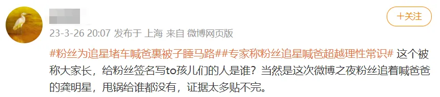 2023年第一个娱乐圈大集会微博之夜落下帷幕,但后续话题仍旧火热,奖项、同框、座位、大合照,又见名利场到处是看点,正当各人高兴讨论明星们互动的时间,中国教诲科学研究院研究员储朝晖却出头泼冷水了。 提前分析,这位专家并没有特殊点名某位明星,他继承了媒体采访,只是针对微博之夜应援运动提出了品评,他以为这些粉丝为了追星堵车喊“爸”,裹被子睡马路的举动,已然逾越了理性和知识。 要知道运动期间,上海警方都不得不出头提示,盼望明星粉丝们切勿占位圈地,拦阻蹊径通行,可见微博之夜的应援运动早就“坏事出门”,出圈影响到了公众了。 很快,网友也扒出,加入微博之夜运动的超百位明星,举行应援运动并睡马路夜排的占了泰半,但在稠人广众追着明星喊爸爸的,似乎只有男星龚俊一家,以致他们的应援物品上,都印着大大的“爸”字。 龚俊本人对于粉丝叫自己爸爸的举动大概率是知情的,根据网友扒出的龚俊署名照片上的笔墨,不难发现这还是一场“双向奔赴”,一边追车应援叫着爸爸,一边署名回应叫着孩儿们。 对于龚俊被粉丝喊爸爸这件事,专家固然不知道详细人物,但也提出了自己的观点,直言这个社会的爸爸妈妈是有特定内涵的,不能恣意喊。 固然,专家的话只是个人看法,不代表绝对精确,只能说追星应援团体还是小众文化,并不得当大张旗鼓对外展示,双方都无法明白,很轻易产生争议,这次微博之夜就是范例。 别忘了,固然仪式话题不停,可在仪式之前,微博之夜没少上演闹剧——粉丝夜排占位、大量人群聚集、红毯中途取消、现场直播延伸,也正是这些闹剧导致了85花女星唐嫣未能进场,失去了领奖以及与杨幂、刘诗诗等旧交同台的机遇,开场后不少明星比及脱妆,面对镜头非常狼狈,这些都是粉丝不当应援造成了连锁反应。 不外比起辛劳应援却无人在意的粉丝来说,明星们这点小贫困根本算不上什么,有路人前去微博之夜场馆拍摄应援现场,粉丝们各自成堆,相互如临大敌,黑暗一片冷风袭袭,又可笑又可怜。 就看一个光显对比。 场馆外,王鹤棣粉丝与棣欣引力粉丝(王鹤棣与虞书欣CP粉)远远隔开,冲着误会的路人大发性情; 场馆内,王鹤棣与虞书欣坐在一起,还一起上台互动,美美制造话题。 更令人无语的是,不管粉丝应援怎样阵容浩大,且不说由于影响公众被驱赶,就这一举动,对于明星自己也是困扰居多,更很难提供所谓助力,说到底,明星想在娱乐圈久远驻足,靠流量人气远远不敷,还是必要作品。 就看微博之夜终极座位表,粉丝取消了夜排去做公益运动的肖战,坐在前排中心位置,根本上没有粉丝应援的李冰冰、惠英红、大鹏、雷佳音、王阳、童瑶、宋佳等人都在前两排——大要上还是按照明星们的作品厚度分列的。 而被喊爸爸的龚俊和王鹤棣、白鹿、虞书欣、期间少年团坐在同一排,这一排明星的场外应援可都不少,却仅仅坐在第三排。 这里也不由得开个打趣,大导张艺谋是微博之夜最大咖,位置最佳报酬最高,按照粉丝逻辑,他是不是应该有着最大排面的应援还得被啼声爷爷啊? ——听听看这笑话有多离谱吧,难怪被专家品评逾越了理性和知识呢。 末了还是要夸大一句,固然这次微博之夜的争议有主理方未能公道安排的元素在,但想要扼制不当应援这一风气,还是得靠明星本人和他们团队引导呢。 本文未经授权严禁转载违者必究! |