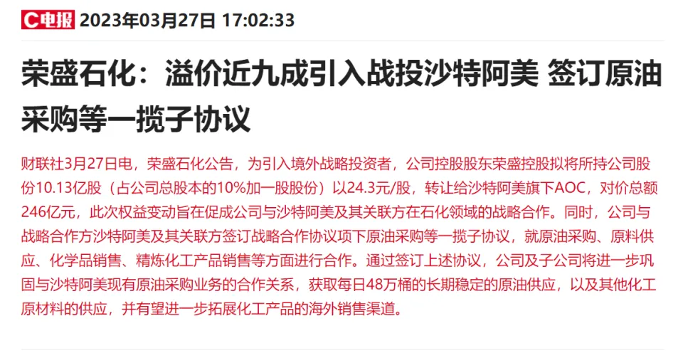 财联社3月27日讯(编辑 平方 训练编辑 刘星雨)总市值超1300亿元的荣盛石化盘后公告,为引入境外战略投资者,公司控股股东荣盛控股拟将所持10%公司股份以24.3元/股,转让给沙特阿美旗下AOC,对价总额246亿元。 同时,公司与沙特阿美及其关联方签署原油采购等一揽子协议,公司及子公司将获取逐日48万桶的恒久稳固的原油供应,以及其他化工原质料的供应,并有望进一步拓展化工产物的外洋贩卖渠道。 据先容,沙特阿美是天下最大的石油生产公司和天下第六大石油炼制商,拥有天下最大的陆上油田和海上油田。公司2019年在沙特证券生意业务所上市,停止3月23日的市值约为1.88万亿美元。沙特阿美2022年净利润1611亿美元,这是石油和自然气行业有史以来单个企业实现的最大年度利润。AOC是沙特阿美的全资子公司。 荣盛石化则是中国综合力气领先的石化龙头之一,运营环球最大的单体炼厂浙江石油化工有限公司4000万吨炼化一体化项目,是中国以及亚洲紧张的聚酯、新能源质料、工程塑料和高附加值聚烯烃的生产商,拥有环球最大的PTA、PX等化工品产能。公司拥有浙石化51%的股权,而浙石化的炼化一体化项目天天可加工80万桶原油。 荣盛石化业务的紧张原质料是原油,沙特阿美是荣盛石化比年来采购原油最紧张的供应商。2022年,荣盛石化向沙特阿美及其关联方购买了约603亿元人民币的原油等原质料,占公司同类生意业务的比例为21%。2023年1-2月,公司向沙特阿美及其关联方购买了约90亿元的原油等原质料。 通过本次战略互助,荣盛石化及子公司将进一步巩固与沙特阿美现有原油采购业务的互助关系,得到恒久稳固的原油以及其他化工原质料的供应,保障石油化工品财产链的稳固性。 二级市场方面,荣盛石化收涨7.76%,报12.91元,以此盘算沙特阿美方面的收购价较本日收盘价溢价88%。拉长时间来看,公司股价2021年创下汗青高点后迄今累计最大跌幅67.7%。 此公告一出,便引起便立刻引起浩繁网友在财联社APP热议。有人表现,“要么你们买不到,要么买到就是坑”,也有人表现,“无敌了沙特阿美溢价这么多收购”。 半年报表现,荣盛石化上半年化工产物、炼油产物、PTA等石化行业产物收入占比超87%。 东吴证券分析师陈淑娴2月16日研报指出,公司浙石化项目二期项目中位于舟山绿色石化基地的年产40万吨ABS装置正在稳步推进,大规模产线近期投料乐成,并已产出合格产物。待后续高性能树脂项目完成,公司又将新增年产120万吨ABS装置。 根据荣盛石化公示,公司现有30万吨光伏EVA产能,未来还将建立70万吨EVA产能装置,总计EVA规模将会到达100万吨/年,将成为中国EVA行业龙头企业。国君石化团队研报指出,我国EVA入口依靠度较高,近5年入口依靠度在50%以上。 陈淑娴表现,看好长丝终端需求回暖,同时荣盛石化结构的高端新质料将成为第二发展曲线,提升公司红利本领。预计公司2023年归母净利润为104.68亿元,同比增速156%。 值得注意的是,荣盛石化2022年年度业绩预告表现,陈诉期内归属于上市公司股东的净利润33亿元-42亿元,比上年同期降落67.25%-74.27%。公司表现,陈诉期内,公司紧张原质料原油代价颠簸较大,卑鄙产物受疫情反复、需求等因素影响,未能完全传导质料颠簸带来的倒霉因素,致公司产物价差缩窄,毛利率降落。 (财联社 平方 刘星雨) |