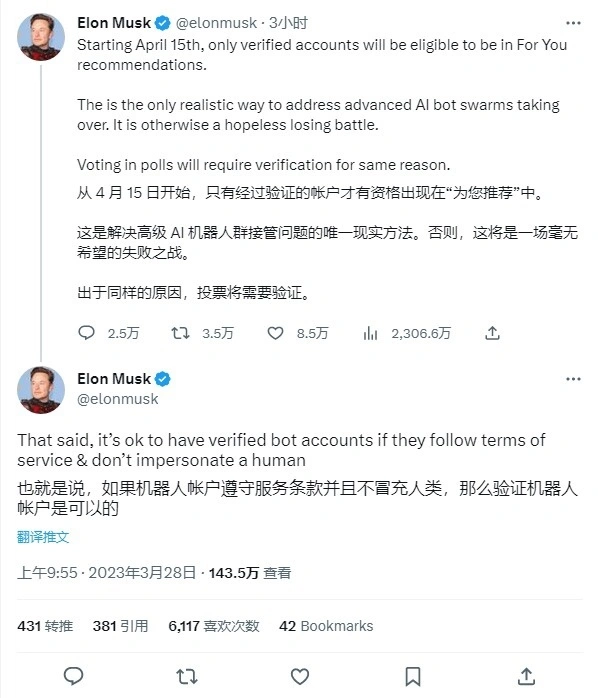 IT之家 3 月 28 日消息,外交平台 Twitter 在马斯克的执掌下,迎来了大量的调解,其焦点就是进步营收。为了说服更多用户购买 Twitter Blue 订阅服务,马斯克公布自 4 月 15 日开始,只有认证账号才气出如今“为你保举”标签页中。 现在未购买 Twitter Blue 订阅服务的账户所发送的推文,也可以出如今“为你保举”页面中。而自 4 月 15 日之后,假如某家企业大概机构想要扩大用户群,那么唯一的方案就是购买 Twitter Blue 订阅服务。 马斯克在同一条推文中还表现,未订阅 Twitter Blue 的账户将无法再加入投票。他声称这是“办理高级 AI 呆板人滥用的唯一现实方法”。 |