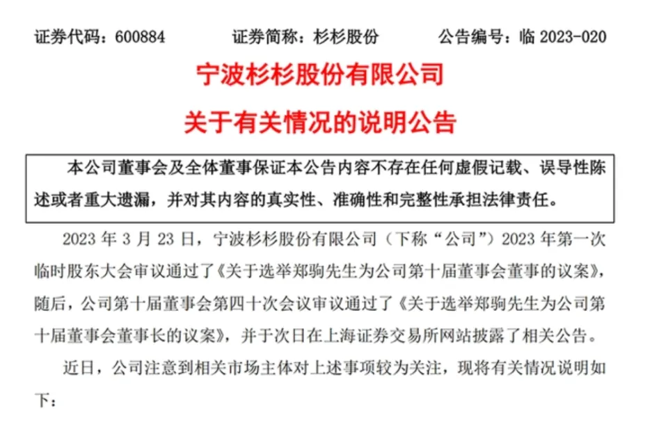 杉杉的股价在郑永刚去世以来已经下跌了11%,再争下去,缩水就更锋利了…… 文 | 海上客 一代甬商郑永刚去世不到一个半月,他所留下的400亿元“杉杉帝国”就上演了争产大戏,一边是郑和前妻所生的90后儿子郑驹,一边则是比郑小27岁的85后遗孀周婷(艺名“慰笛”)。 由于65岁的是郑永刚是在本年2月忽然去世的,围绕其建立的杉杉股份以及涉及的财产继承权和现实控制权的争斗,在本年3月23日的临时股东大会上忽然白热化。 这场风波轰动了羁系部分,上交所3月26日向杉杉股份及相干方发出羁系工作函,督促公司及相干方妥善处理惩罚有关事项、保障上市公司筹谋稳固和规范运作。3月26日晚间,杉杉股份披露了“关于有关情况的分析公告”并称对安稳办理争议持开放态度。 迄今为止,这场争产大战未完待续,也为国内眷属企业的传承和交班题目提供了前车可鉴…… 01 海姐先带各人来复盘一下“400亿元争产”的来龙去脉。 本年2月10日,杉杉公司原现实控制人、65岁的董事长郑永刚因突发心脏疾病救治无效,与世长辞。 3月3日,杉杉股份发布了召开2023年第一次临时股东大会的关照,筹划在集会上讨论推举郑驹为公司第十届董事会董事的议案。 3月23日,杉杉股份第十届董事会第四十次集会,推举郑永刚之子郑驹为董事长。可遗孀周婷出现在会场,指称该次股东大会是违规和错误的,并要求成为杉杉实控人。 先来说说郑驹。 郑驹生于1991年,现年32岁。郑永刚与前妻共生有两个儿子,郑驹另有一个“身段不太好”的哥哥,后者并没有更多公开资料。 3岁时,郑驹开始上全托幼儿园。从高中起,郑驹就被郑永刚送去英国留学,不买车不买房,寻常出行都乘地铁。他读完大学就返国,随即进入父亲一手建立的杉杉。2018年郑永刚继承采访时就曾明确表现,正在造就儿子郑驹交班。 被称作“服装大王”的郑永刚,从一家濒临停业的服装厂开始做起,不但引领杉杉成为中国服装业第一家上市公司,还摆设企业战略转型,先后在时尚财产、锂电新能源质料、光学表现质料等范畴乐成布局。 2015年,郑驹出任杉杉控股总裁,负责投资、医疗、旅游等业务,并重点加入杉杉锂电池业务的决定管理。 随着郑永刚渐渐退居幕后,杉杉系焦点平台杉杉控股自2018年起,就由郑驹继承法定代表人及董事长,2019年9月,郑驹出任杉杉团体董事、副总司理(副总裁),后于2020年1月升任杉杉团体总司理(总裁)。 如许来看,郑永刚简直是故意把郑驹造就成杉杉的交班人。 再来说说周婷。 估计很多人和海姐一样,是第一次听到这个名字。但提及上海的财经女主持慰笛,大概知晓度更高一些。 周婷出生于1985年,浙江杭州人,浙江大学消息与传播学硕士研究生。2007年,她进入上海电视台工作,一连继承《上海清晨》《世博快报》《财经早班车》《财经中心站》《最消息》《理财宝典》《财产地理周刊》等节目标主持人。由于不停聚焦财经节目,周婷于2013年被调往第一财经频道,主持晚间黄金档《财经夜行线》,并给自己起了个艺名“慰笛”。 通过她的微博,可以发现她2015年3月采访一些企业家时,有一张和郑永刚的合影。 从2016年起,周婷渐渐淡出公众视野,很少再主持节目。2017年,郑永刚和周婷正式完婚,迄今为止育有3名子女。 直到本年3月23日独闯董事会,外界对她及其子女知之甚少。这位昔日的财经女主持表现,基于继承关系,她应当成为杉杉股份的现实控制人。 周婷进一步表现,董事会擅自审议未经自己审视和同意的议案并对外发布,是违规和错误的。她以为,董事会的做法对她和子女应该正当继承的财产及权利造成了侵害,也违反了郑永刚老师的遗愿;而且,上市公司管理布局与实控人完全摆脱,大概对杉杉股份管理布局、规范运作产生庞大倒霉影响,继而引发上市公司合规性风险。 02 从法理上来看,周婷的责备非难未必站得住脚。 一方面,从公开的流程上看,杉杉股份推举新董事,没有题目。股东也可以通过股东会,任免董事。 另一方面,根据状师的专业发起,董事会推举与实控人认定并无关系。杉杉股份相干人士也回应称,作为上市公司,公司有独立和美满的法人管理布局;无论公司的现实控制人终极确认结果怎样,公司的一样寻常运营以及董事会、股东大会的召开都是一如既往的按照法律法规和公司章程的规定举行。公司现实控制人的终极认定结果,不会对公司本次推举董事的步伐和决定的正当性、有用性产生任何影响。 因此,周婷此次出头,更像是博关注。 值得一提的是,周婷是否能成为杉杉股份的现实控制人,还存在争议。郑永刚是否生前立了遗嘱,假如是,具体内容又是什么?现在一概不知。 据股权穿透图表现,杉杉股份的现实控制人郑永刚,重要通过持股51%宁波青刚投资有限公司,间接持股杉杉控股有限公司。再通过杉杉控股,持股杉杉团体有限公司、宁波市鄞州捷伦投资有限公司等公司,以间接持股杉杉股份。 郑永刚持股杉杉股份,终极持股仅有5.645%。就算周婷拿下了郑永刚持股杉杉股份的全部份额,依然无法成为绝对控股股东。 03 在这场400亿元资产争斗中,一个机密人浮出水面,引发外界很多推测。 据悉,郑永刚持股宁波青刚投资有限公司51%,剩余49%由天然人周继青持股,宁波青刚公司拥有杉杉控股约44.5%的股权。 据《南方周末》梳理,郑永刚与周继青,曾在信息披露的夫妇一栏中写下了对方的名字。这意味