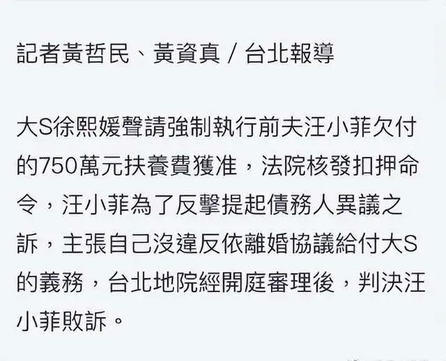 3月27日,娱乐圈最被关注的事变莫过于大S与汪小菲之间的诉讼案件的灰尘落定了,据台媒报道,大S向前夫汪小菲索讨750万元(新台币)米饭钱一案一审效果出炉,汪小菲败诉,可上诉,对于讯断来由媒体还没有公布。 对于这个效果,许多网友已经推测到了,不外等真正的效果出炉,网友照旧不淡定了,感慨万千,对汪小菲表现怜悯。 最初仳离,汪小菲同意了大S提出的各种要求,既然最初同意,以是如今提告状讼,自然不会胜诉,不外题目来了,那么汪小菲为何最初会签下各种看起来不同等的仳离协议呢? 大S与汪小菲的闹剧事故一连了半年之久,在这期间发作的“床垫梗”“天价水电费”等事故,让吃瓜群众都很怜悯汪小菲,尤其是2个孩子的抚养权都归大S,更是让人无法明白,最最少2个孩子一个人一个,那才叫公平。 固然对于他们仳离有各种爆料版本,不外此中的一个爆料,能表明汪小菲为什么最初会签下对自己各种倒霉的仳离协议,那就是汪小菲有复婚的操持,以是同意了各种仳离的条件,只是没有想到大S仳离之后,很快嫁给了具俊晔。 提到具俊晔,近期也时常上热搜,出席运动谈到了他与大S完婚一年来的生存点滴,通过具俊晔的爆料,知道了他们夫妇近期的一些动态。 在春节之际,有媒体时常爆出,大S约请韩国的婆婆来中国的台湾省一起过年,其时以为只是听说,如今通过具俊晔的自曝,原来在春节之际,具俊晔的母亲确实来台湾省看望自己的儿媳妇。 大S已往给人的印象那就是一个很懂礼仪很面子的明星,但是通过具俊晔的自曝,发现大S真的是与众差别。 大S嫁给具俊晔,固然是二婚,但是究竟是新媳妇,在过春节的时间,尤其是韩国也过春节,身为晚辈的大S为何不能去自动看望韩国婆婆呢?要知道具俊晔的妈妈如今也是78岁高龄的老人,怎么忍心让老人在春节自动来看望自己呢? 在春节之际,有许多多少台湾省的女明星都在外交媒体上分享了自己过年的点滴,好比:伊能静、陈妍希、杨丞琳等,她们都嫁给了本地男艺人,在过年的时间,都去婆婆家过年,正是有这么多故乡女明星做对比,更加烘托出大S的与众差别。 大S在还没有与汪小菲仳离的时间,由于不喜欢北京的天气,回抵故乡定居,逢年过节的也不返来与婆婆家人团圆。 为了能一家人一起过年,身为婆婆的张兰,还得自动去台湾省过年,在晚上张兰住的地方也不是自己儿子买的别墅,而是旅店,料想如果大S很热情,信托张兰不会放着别墅不住而去住旅店吧! 在没有仳离的时间,汪小菲的古迹重心在北京,但是为了能陪伴老婆孩子,他时常在两地奔忙,尤其是前些年由于戴口罩的缘故原由,汪小菲非常的不容易,但是为了家庭他无怨无悔。 如今看到具俊晔的自曝,再次感受到大S特立独行的办事方式,更加心疼张兰汪小菲已往的不容易。一日夫妻百日恩,但是大S在过年之际,差别意2个孩子回北京过春节,这番操纵肯定让汪小菲悔不妥初吧!等候汪小菲在北京打官司吧,早日夺取到孩子的抚养权。 |