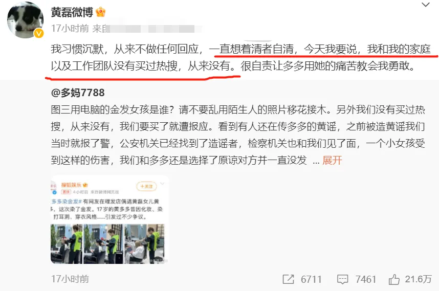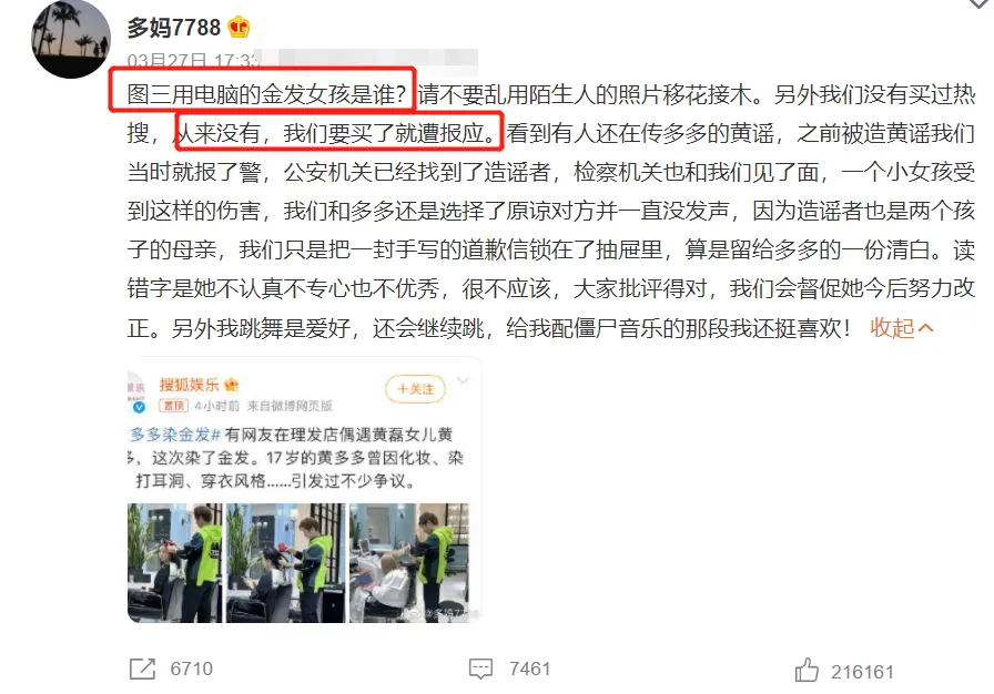 老话说,墙倒众人推!娱乐圈里的明星艺人、星二代,一旦有什么不被大众继承的地方,就很难再被簇拥。黄磊的女儿黄多多,便是一个最好的例子。 小时间的黄多多,是观众眼中的乖巧、懂事的小姑娘;发展中的黄多多,也时常被各人贴上学霸的标签,由于良好而火出圈;然而,如今长大了的黄多多,却徐徐失去了观众缘,成为了一部分人吐槽的焦点。事故的因由,还要从她读错字开始提及。 各人都知道,黄多多读了高中后就跟同砚一起开立了一个读书专栏,教小孩子读书。但厥后,有网友发现黄多多在一个视频中多次读错简朴的汉字词汇,由此引发了热议,她的学霸形象,也就此崩塌。大概也正是由于云云,在那些不绝就看不惯黄多多经常由于良好上热搜的网友看来,无疑就是讽刺。 黄多多读错字上热搜引发争议后,有一段时间也非常安静。但没想到的是,她在3月27日时,却由于一个“黄多多染金发被偶遇”的话题上了热搜榜,冲上了热搜第一。 该网友表现自己在剃头店偶遇到了黄多多,还晒出了黄多多的正面照,以及染了金发的背影照。 随着照片的曝光,各人对黄多多的争议也是南北极分化。有人以为黄多多一个17岁的小姑娘,染发、扮装、打扮成熟是自己的事故,并没有什么不当。但更多的网友,并不在意黄多多是不是让金发,反而对她上热搜表现无法明确,以致质疑黄磊、孙莉是为了给女儿出道铺路,买的热搜。 一时间,只不外是在剃头店被偶遇的黄多多,一时间又成为了全网攻击的焦点,很多人不绝质疑这个热搜是买的,屁大点的事故也要上热搜。由此可见,读错字风波后,黄多多的形象,在网友的心中已经越来越差了。 面对全网的争议,不绝岑寂无言的黄磊、孙莉也终于双双发文回应质疑。 作为孩子的妈妈,孙莉很气恼自己的女儿从小不绝被造谣、咒骂。她说黄多多是去剃头店了,但是金发姑娘的照片并不是自己的女儿,而是有人移花接木找话题。对于买热搜,孙莉更是倔强表现到:们没有买过热搜,从来没有,我们要买了就遭报应。 而作为爸爸的黄磊也非常自责,他不光转发了孙莉的长文,还配文表现:我和我的家庭、工作团队从来都没有买过热搜。 很显然,孙莉跟黄磊为人父母,也不盼望自己的女儿遭受陌生人的网暴。买热搜这件事故,自己就是子虚乌有,只是他们不绝没有任何回应,不绝岑寂无言,才会让诋毁黄多多的声音越来越放肆。 实在,站在客观角度来说,黄多多只是个17岁的女孩,她有自己的审美需求,别说这一次真的没有染金发,就是染了,也是人家的自由。那些由于人家犯了一次错误就急着否认她全部的网友,也是跟风质疑人家上热搜就是黄磊孙莉想要让女儿走红,真的有点离谱了。 好了,文章的分享就到这里了,盼望各人对黄多多善良一点,为人父母,没有人盼望自己的小孩蒙受这种年事不应蒙受的争议。你以为呢? |