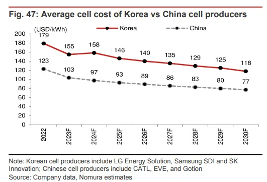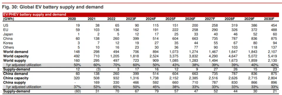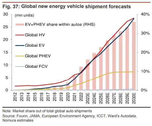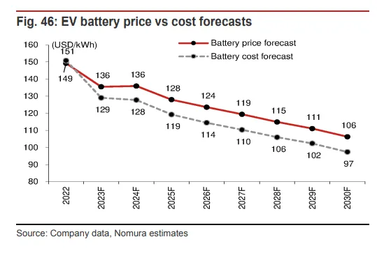 伴随着环球政策和步伐的推动,电动汽车电池范畴正在迎来亘古未有的发展远景。 当前,天下各国分别颁布了促进电动汽车财产发展的法案和步伐,力图扩大电动汽车财产和供应链在其本土的发展。在政策的刺激下,野村证券分析师Cindy Park、Yu Okazaki等人在3月21日发表的陈诉中指出,将来五年内,环球电动汽车电池需求将以每年18%的速率增长,2028年到达1647GWh,2030年到达2107GWh。 野村证券体现,随着中国电动汽车补贴的渐渐退出,叠加本年一季度供应链去库存,中国电动汽车行业在本年将处于一个适度增长的情况。 同时,由于宁德期间等行业向导者接纳战略性贬价,电池市场竞争大概加剧,国内市场代价也将进一步降落。 野村证券预计,2030年动力电池匀称售价将为136美元/kWh,同比降落9%,这重要是由于原质料代价的下跌。野村证券以为,随着资本低落举措的推进,从2024年开始,动力电池代价将每年降落3%,直到2030年。 别的,碳酸锂代价进入下行通道,也将有助于缓解电池制造商的利润压力。 2030年环球动力电池需求达2107GWh野村猜测,2023-2030年,环球电动汽车(包罗纯电动/插电肴杂动力车辆)的电池需求将以17%的年增速增长;到2030年,动力电池需求将到达2107GWh,这是基于电动汽车排泄率将在2030年到达34.6%的底子上推算的: 我们猜测,2023年电动汽车电池需求将同比增长43%至706GWh,2023-2028年和2023-2030年的年均增长率分别为18%和17%,到2028年和2030年时分别到达1647GWh和2107GWh。 这基于2023年、2028年和2030年环球电动汽车排泄率分别为15.8%、29.8%和34.6%(2022年为11.8%)或2023年电动汽车出货量为1370万辆。 2023年1月至2月,15个国家的电动汽车出货量同比增长24%,到达140万辆,此中中国、美国和欧洲十国同比增长19%、94%和5%。中国、美国和欧洲十国占环球电动汽车出货量的59%、16%和21%。 详细而言,野村证券预计,2030年环球新能源汽车(包罗肴杂动力汽车、纯电动汽车、插电式肴杂动力汽车和燃料电池汽车)销量将到达6450万辆,电动汽车(包罗纯电动/插电肴杂动力车辆)贩卖量将到达3560万辆: 我们的环球汽车团队猜测,新能源汽车的贩卖量将在2025F/30F到达3590万辆/6450万辆。电动汽车的贩卖量将到达2020万辆/3560万辆,市场份额为22.0%/34.6%。 产能方面,克制2022年底,环球动力电池产能为1205GWh,出货量为497GWh,野村预计到2030年底,环球产能将增长至5419GWh,这意味着在2022年至2030F期间,产能增长率为21%,同时地区之间的产能也将发生变革: 按地区分别,2023F中国/中国以外的亚洲/北美/欧洲应占环球电池产能的73%/5%/6%/16%,根据我们的估计,这将在2030F年发生变革,变为52%/4%/17%/27%。 电池代价从2023年开始降落野村证券体现,随着原质料金属代价降落,电池的匀称代价将在2023年出现降落,预计降幅为9%: 对于我们覆盖的七家电池制造商——松下、宁德期间、LGES、SK On、三星SDI、亿纬锂能和国轩高科——我们猜测,2023年匀称售价为136美元/kWh,同比降落9%。 据我们估计,由于大幅度的金属代价上涨,2022年匀称代价上涨了13%。2022年,碳酸锂/镍代价的匀称值分别为71653美元/吨、26187美元/吨,同比上涨287%/42%。 对于2023F,我们估计ASP(匀称售价)将降落9%,由于我们以为这些金属代价会降落。 不外,本年迄今为止,一些正极质料制造商体现他们的ASP已经上涨。从2024F开始,我们猜测,电动汽车电池代价将每年降落3%,直到2030F,作为资本减少的一部分。 别的,野村体现,由于车企都盼望低落资本,全部电池制造商也都面对着低落资本和匀称售价的压力。比方,特斯拉在2023年3月的投资者日上体现,它操持通过规模增长、更高的生产率/开销服从/供应商规模、产物改进、工程变动和当地化将资本低落50%。 野村证券以为,这些目的应当是电动汽车行业的共同愿景,而不但仅是特斯拉的相干愿景。 就覆盖的七家电池企业而言,野村证券体现,就算将来电池代价降落,中国的电池企业预计仍将保持竞争力: 2022年七家公司的匀称运营利润率为1.6%,我们猜测这一数字将在2023F / 25F分别上升至5.1%/ 7.1%。 我们估计,2022年三家韩国电池公司(LGES,SDI,SK On)的匀称代价比中国电池制造商(宁德期间,比亚迪(未覆盖),亿纬锂能,国轩高科)高44%。由于50-60%的中国电池生产基于低资本LFP,因此中国的匀称电池代价低于韩国/日本的电池代价。 这种具有竞争力的代价以及高于行业匀称水平的红利本领推动了强劲的电池需求和供应增长。固然我们预计这种代价差距在各国之间将一连存在,但利润率大概会在将来几年收敛。 电池技能:更高能量密度、更长命命和更好的热稳固性就动力电池的技能门路而言,野村证券以为,动力电池正向着更高能量密度、更长的寿命和更好的热稳固性迁移: 我们预计2023年NCM/NCMA EV电池的能量密度将到达720-750Wh/L(280-310Wh/kg),在2025年之后,预计能量密度将向800Wh/L(320Wh/kg)迁移。 别的,我们以为阳极中的硅肴杂物有潜力从现在的约5%上升至5-8%(NCM)。 至于磷酸铁锂电池,野村估计当下其能量密度为约150Wh/kg,目的是在将来几年内朝着800Wh/L(高出320Wh/kg)的方向发展,以便为电动汽车提供每次充电约600-700km的行驶里程和不到15分钟的充电时间: 为了实现这一目的,我们估计须要镍含量高出90%的阴极、约10%的硅石墨和厚度小于9微米的湿式隔膜。 锂/镍价:2023/2024F预计降落野村证券以为,鉴于锂比年来的供给增长高出了需求增长,预计2023/2024锂价将同比降落35%/20%;镍的供给小幅