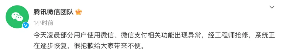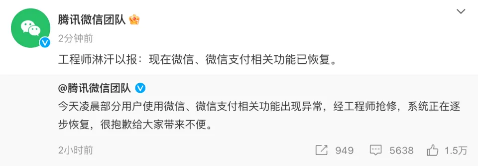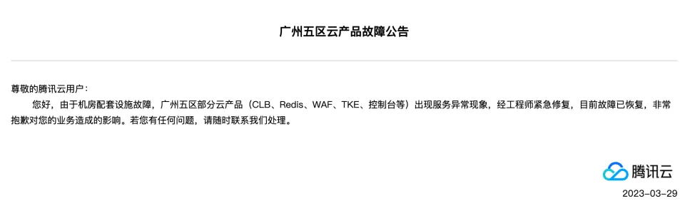 @腾讯微信团队 3月29日最新消息,如今微信、微信付出相干功能已规复。 本日破晓部分用户反馈利用微信、微信付出相干功能出现非常,经微信团队工程师抢修,体系正在渐渐规复,很歉仄给各人带来未便。 腾讯云方面也发布了相干故障修复公告。公告表现,由于机房配套办法故障,广州五区部分云产物(CLB、Redis、WAF、TKE、控制台等)出现服务非常征象,经工程师告急修复,现在故障已规复。 |