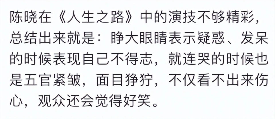 在陈晓演《人生之路》的“高加林”从前,不绝以为,他大概是将来的濮存昕,至少也是张嘉译[笑哭]。 毕竟,2013版《笑傲江湖》的林平之就令人惊艳。 厥后《陆贞传奇》火了,陈晓仍旧不骄不躁。 《神雕侠侣》的女主被骂得全天下都嫌弃时,他不为所动,仍旧对峙着本身的判定、恭敬着本身的爱情……在陈晓身上,我们曾难过地看到,他这一代演员缺少的沉稳和内敛。 《那年花开月正圆》中的沈星移、《梦华录》里的顾千帆,陈晓的表现都不俗,已往的15年,陈晓稳稳地显现了他踏实又不失个人风格的演技。 但是,《人生之路》里的“高加林”真的差能人意!这……演的是啥? 一脸阴鸷、自卑过甚,每集都要“巨婴”般无能狂怒,必须要靠女人安抚才气正常思索。 眼神呆滞无光,仿佛一个城里来富二代,突然被送到乡下饿了几天,立刻要偷鸡吃。 这照旧强健康健的农村知识青年高加林吗?照旧谁人把苦难锻炼成人生傲骨的高加林吗? 大概,对于以上形貌您感受不深,只要对比一下影戏《人生》中“高加林”的眼神就一清二楚了。 这才是真正在农村长大,既爱这片土地爱得深沉,又渴望走出大山、在苦难中涅槃的高加林啊! 这一次,陈晓的演技不是差了一星半点,而是感觉完全就不对。网友吐槽: “用发呆表现本身不得志,哭的时间眉头紧皱、面目狰狞……陈晓演技降落严峻。” “周里京眼里坚忍、英气……陈晓公子哥气,演演少爷还行。” 网友说得太对了,陈晓版的高加林公子哥儿气有余、人物纯朴感、极重感不敷……岂非,85后男演员中的翘楚陈晓,这回真要跌下神坛了吗? 陈晓为何不像“高加林”?没有阅历《人生之路》14集里,巧珍坐着双星的拖沓机,来到县里看高加林。两个小情侣久别相逢,幸福地相拥在一起。这一段,陈晓和李沁都演得很生动。 高加林来到县里当记者,面临妆扮时髦、会审美、爱文学的黄亚萍之“勾引”,他那种欲拒还迎的忸怩感,和高兴心情、希奇感,都表现得很玄妙。 乃至,当小学西席时,给孩子们上课的那几场戏也教得尤其生动,能看出他对情节的经心计划。 凡是演得生动的戏份,都是陈晓有生存阅历的部门——他谈过铭肌镂骨的爱情、他有职场履历,乃至他也当过老师(在他成名前曾在合肥艺术学校当老师,他非常热爱那段生存)。 演得差能人意的部门,也皆是陈晓没有生存阅历的部门。 起首,陈晓眼光过于呆滞,感受不到农夫的淳朴和阳光。 笔者在农村长大,过节和周末仍旧会偶尔回到农村。 固然村里的人都不大认识,但我很喜好和村民语言,由于他们少有焦急和心机,快乐来得很简朴,身上更有一丝优美的纯朴与阳光。在老版的高加林和刘巧珍身上,我们还能看到农村人这种气质。 陈晓之以是演不出来,大概率跟他自小在都会公务员家庭长大,完全没有农村生存履历有关。 其次,他总是表现出对农村人的藐视,这是原著中高加林是不大概有的状态。 《人生》原著有一句形貌高加林的话: “他从来也没有藐视过任何一个农夫,但他本身从来都没有当农夫的精神准备。” 固然厥后高加林脱离了农村,坦然担当了权势对他的勾引,借助二爸的官位进入县委大院,并想使用黄亚萍前往上海发展。但这是由于高加林的抱负、脆弱和虚荣在打架,而不是由于心田的貌寝。 末了,从家教和生理分析上来看,高加林不大概有狂妄或藐视的感情。 原著中,高加林的西席职位被高明楼儿子顶替,他曾因一时气不外非要去找人家拼个不共戴天,但是父亲高玉德劝他: “你不但不能去找他,以后见了面还得叫他叔,人活低了,就得按照低的来。” 这是农村老一辈的典范生存哲学,也是高玉德的智慧。 在如许的家庭长大,不管高加林进县城也好、甩了巧珍攀高枝也好,他的心田都应该是歉疚而抵牾的。 但陈晓版的高加林,担当了巧珍的爱同时,却多次表现出他对农村生存的不耐心,和对巧珍的藐视。 包罗和别的西席竞争先辈时,他表现的狂妄而高高在上…… 这统统,都让观众感受到了脚色的违和感。 更别说开头骑着二八自行车飙车了,高玉德如许贫苦家庭出来的孩子,怎大概这么暴殄天物,云云的公子哥活动习气? “体验派演员”陈晓,“纸上谈兵”了一回?一样平常来说,演员的演出方法可简朴归纳为以下四类:本色演出、体验派、表现派和“超等BT”的拟态派。 本色演出,多数是指记载片中的素人演员,好比贫苦山村的孩子、武士等等。 表现派,是指演员在脚色中代入一部门自身性格,并夸大表现。好比《仙剑奇侠传》中的胡哥、《司藤》当中的景甜、《去有风的地方》中的刘亦菲,另有宋丹丹在《家有儿女》中的脚色……都算是典范的表现派。 体验派,是险些不代入本身的性格,而是融入别的一个人的感情和性格去演出。 这种演法很累,须要更多想象力和相干阅历,要演出本身都信任的真实感才算乐成,陈道明、李冰冰都属于体验派。 超等BT的“拟态派”演员很少,但也是演员的最高田地。 即完全没有体验一秒进入与本身性格相反的人物脚色,能演到这个田地的都是老戏骨。 好比冯远征老师、“星爷”周星驰、刘青云、梁家辉这些人,他们演出的人物和他本人的性格完全没有关系,神乎其神。 而陈晓也是体验派的代表。他之以是能在85后男演员中排行靠前,是由于之前的脚色大多塑造真实。 陈晓家景较好,从小造就了大量的爱好爱好:书法、舞蹈、绘画、篮球(还得到