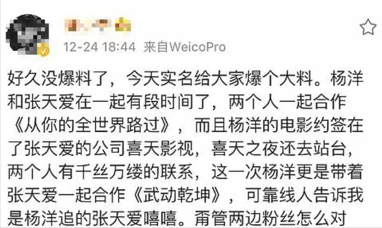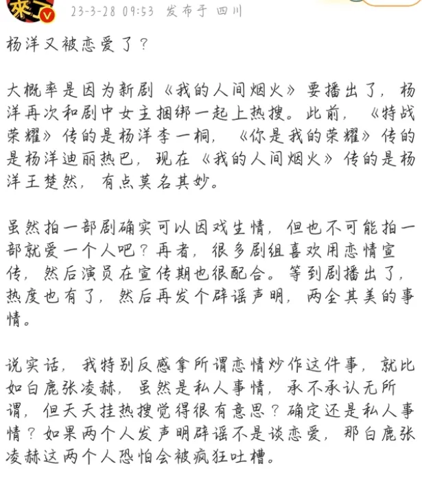 杨洋被曝恋上有着“小刘亦菲”之称的99小花王楚然,事故发酵好几天,但男女双方都没有回应,仿佛在等下一个热搜。 两人于3月28日被网友偶遇在马尔代夫和友人共进晚餐,第二天还直接来了一个海滩热吻。 这之后,蛛丝马迹随着神通广大的网友们越来越多,以致连最初的爆料人还改了id和头像,简介直接成了:“撒谎的人吞一千根针。” 此事也直接使得杨洋之前的感情故事,再度成为话题。 从16年前踏入演艺圈之后,他的绯闻就没断过,而且疑似女友个个都是肤白貌美的女神级明星。 但每一段所谓的“感情”终极都没能换来一个说法,而且了局都不尽如人意,以致尚有互撕到老死不相往来的存在呢。 1.炒作照旧真爱?杨洋和王楚然由于客岁5月一起相助电视剧《我的人间烟火》,而产生交集。 这部作品报告的是消防站长宋焰和急诊科医生许沁的故事,根本上就是前段时间大火的“武士+医生”题材的偶像剧。 当时作品在拍摄阶段,从一连放出的路透照或预告来看,就有粉丝狂磕这一对的颜值,以为他们“CP感十足,特殊养眼”。 没想到的是,作品尚未播出,两个养眼的偶像派,便在现实中对上了眼? 相比杨洋出道16年,出生于1999年的王楚然也是冉冉升起的内娱新秀。 她在2017年由于一部古装剧《将军在上》中的“表妹”柳惜音,顺遂出道,小范围“出圈”。 由于长相特殊出挑,和刘亦菲有几分神似,因此被外界称为“小刘亦菲”。 确实,王楚然的古装扮相非常亮眼,是那种聚集了英气和饺惑的一种浑然天成。 她上一次被大众再度留意到,是2020年到场了真人秀节目《演员请就位2》。 固然当时的演技不见得有多么惊艳,却也依附长相赢得了评委的关注,尤其是尔冬升,将她称为“有质感的花瓶”,也因此她得以顺遂走入郭敬明的团队。 那之后,王楚然在《画皮》片断中饰演了英气十足的女将军佩蓉,给人留下了比力深刻的印象,以致连“如鲠在喉”的李成儒也夸她“演得好”。 那之后,她的戏约显着多了起来,尤其是客岁,参演的《尚食》《邂逅时节》等作品一连开播。 同一阶段,杨洋也有《特战光彩》《且试天下》两部和一线小花相助的作品开播。 固然王楚然没有杨洋名气大,但两人照旧在片场邂逅,睁开了一段奥妙的缘分。 这次被扒出疑似恋情,网友也用了比力耐人寻味的语言形貌:“女孩看到中国人就跑”,好像可以映衬对他们对于这段感情的真实态度。 固然双方的粉丝纷纷留言“没图勿扰”,但从被扒出的蛛丝马迹中看,两人确实都在海边,尚有不少旅店、游艇等相干的“证据”。 而且王楚然在这之前还将自己的影视约签约给了悦凯娱乐,而这个悦凯正是杨洋的经纪人贾士凯开办的。 因此两人除了相助关系、疑似的情侣关系,之前照旧同事。 以是,也有大批人不信赖这次爆料,以为大概是电视剧开播前的一次炒作举动。 但无论怎样,杨洋拍一部戏便出一段绯闻仿佛成了“定律”,也让诸多网友不满,有人直接发帖诘问: “确实可以因戏生情,但也不大概拍一部就爱上一个人吧?” 说到杨洋的绯闻女友,确实一大堆。 但是神奇的是,无论外界怎么传,大概怎么撕,他及他的团队都没有出来正面回应或认可过任何一位。 实在出生于1991年的杨洋,本年也已经32岁了,谈个爱情不是正常的吗? 2.一部戏爱上一个人?众所周知,杨洋是曾经的“军艺校草”,小时间就长得特殊悦目,还学过很多多少年舞蹈,身姿也挺秀高挑。 2007年,他从浩繁备选演员中脱颖而出,成为李少红版本《红楼梦》中的男主角贾宝玉。 而当时的他大概并不知道,自己未来的感情生存居然和宝玉有异曲同工之妙:朱颜知己着实太多了。 在这里,杨洋结识了女演员李沁,对方比他大1岁,之前是学昆曲出身的,显得娇俏可人。 当时的《红楼》剧组都是年轻的少男少女,李沁和杨洋由于相助的关系或性格的缘故起因,相互之间生出感情并不特殊。 该剧在2010年播出之后,两人便被外界评为“最佳荧幕CP”,杨洋对此的评价是“非常高兴”。 确实,当时两人还一起相助了《花开半夏》和《饮食男女2012》,关系不停不错。 而且早期他们还留下大量的密切合影,说密切是由于每次和主创团队一起照相,两人都“黏”在一起,身材语言也并不陌生。 他们还时常隔空互动,带着少年独有的灵活和密切。 各人以为杨洋和李沁曾经真的在一起过的重要缘故起因,在于李沁曾经在担当采访时,直言自己的绯闻男友里有真的前任。 但到了两人主演的《花开半夏》播出的同年年底,杨洋便由于拍摄电视剧《茧镇奇缘》,结识了比自己大4岁的宋茜。 两人当时频仍隔空互动,厥后又被扒出大量同款,以致还被拍到同住旅店、杨洋前去女方住所等“实锤”,绯闻因此甚嚣尘上。 他还曾在担当采访时直言自己“受不了姐弟恋,但如果真有,年事差要在4岁左右”,而他和宋茜之间就是差4岁。 而宋茜在2015年6月开始和贾士凯相助,也被猜疑是杨洋牵线的。 但终极她们的“感情”不光没有劳绩一个美满的了局,反倒闹得一地鸡毛。 由于杨洋搭档的玉人太多,当时有网站搞了一个“杨洋的荧幕搭档评比”,里边的女星不乏刘亦菲、白百多么一线大花,但最热门的照旧之前和她传过绯闻的那几位小花。 而宋茜却忽然也投出了自己名贵的一票,站了对方和爽子;杨洋却“古怪”地点赞了自己听宋茜歌曲的内容。 如许一来,双方的粉丝便互撕了起来,相互痛骂对方倒贴,