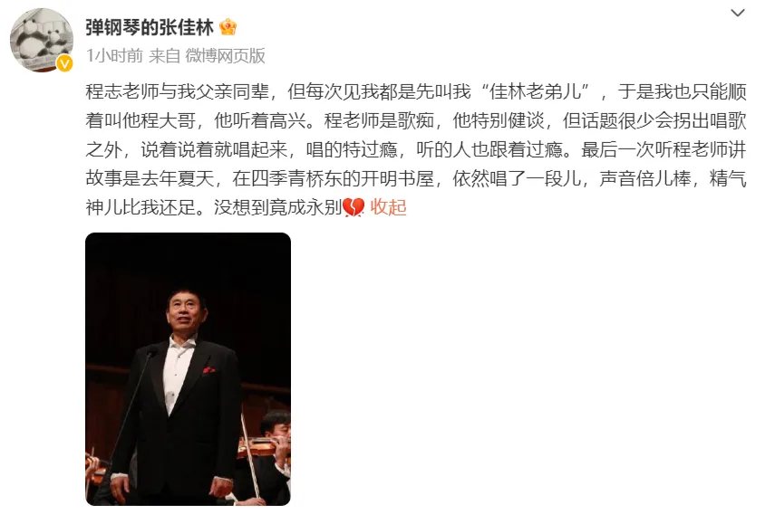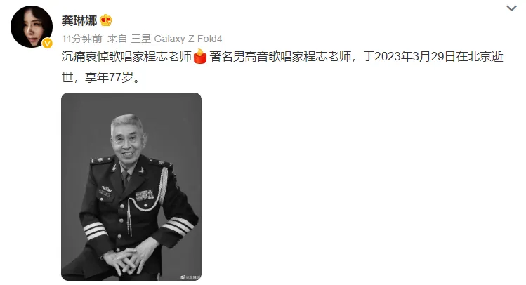 3月29日,据多位原总政歌舞团艺术家消息,我国著名男高音歌唱家程志在京去世,享年77岁。 据悉,程志老师生前在音乐圈颇具威望,也是家喻户晓的老歌唱家,他结业于中央音乐学院,师从著名声乐教诲家沈湘教授,他生前曾多次以中国艺术家的身份到天下各地演出访问,还搭档爱徒阎维文一起。 他的代表作有很多,包罗《在那迢遥的地方》《革命人永久是年轻》《冰冷的小手》等,提到这些经典的歌曲,信赖很多人都听过,在得知程志老师去世的噩耗后,不少圈表里人伤心不舍,在这些歌曲中送别程志老师。 此中歌手龚琳娜发文,“沉痛哀悼歌唱家程志老师。”钢琴演奏家张佳林回想过往惦记,直言末了一次听程老师讲故事是客岁炎天,依然唱了一段儿,声音倍儿棒,精气神儿比我还足。没想到竟成永别。 别的于文华还专门在平台上搜索有关程志老师去世的消息,她发了三个祈祷的心情,想来也是第一时间确定程志老师去世的消息是否属实,而两人之间也颇有渊源。 《革命人永久是年轻》这首歌于文华也演唱过,两人还曾一同出席公益歌友会运动,而且同台放歌,在于文华心中,两人不但是好友,程志老师更是她的模范。 在客岁李光曦老师去世时,于文华晒旧照合影哀悼,程志老师也有出镜,本来还约着一起过重阳节,没想到合影中已经有两位歌唱家拜别,也是令人伤心不已。 关于程志老师去世的缘故起因,亲朋没有过多透露,不外早在前两年,程志的身材就出现了题目,一开始只是以为胃疼,没有当回事,效果越来越严峻,末了查抄确诊为急性肠梗阻,做了两次大手术才拯救回生命,其时在医院住院了两个多月,一度暴瘦了30多斤。 当他再次回到观众视线中,很多人都没能认出来他,真就瘦得像重生了一样,固然不知道程志老师去世的缘故起因是否与这次抱病有关,但履历两次手术肯定让他元气大伤,以至于这次没能扛已往。 不外即便身材出现了题目,但程志老师一生为了音乐空想从没想过退休回家休养,在客岁10月他还登上国家大剧院的舞台压轴演唱了三首歌《我的太阳》《打靶归来》《中国梦》,站在舞台上的他浑身布满了力气,歌声铿锵有力,唱得勾魂摄魄,气吞山河。 客岁9月,主持人张泽群曾晒出与程志老师的合影,其时多位老艺术家一同露面,程志的体态固然瘦弱很多,头发也已经全白,但状态还不错,没想到仅仅过了半年就走了,留给亲朋无尽缅怀。 程志老师生前有过两段婚姻,前妻是国家一级演员殷秀梅,两人的联合可以说并不精美,在完婚当天,殷秀梅就有分手的想法,以至于这段婚姻仅仅维持了一年,末了两人由于性格不合宁静仳离。 着实分开的重要缘故起因是两人在没有相识透彻相互时就闪婚了,以至于婚后发现性格差别很大,殷秀梅性格生动,比力外向,而程志就比力内敛,寡言少语,差距过大的两人终极选择放开相互,后续两人也都再组家庭。 程志的第二段婚姻同样找了圈内人,是比他小8岁的王秀芬,也是国家一级演员,两人最初由于音乐成为了知己,渐渐才发展成情人末了走进婚姻,在相处的过程中,两人不但爱好爱好类似,就连三观都非常相似,以至于很少吵架,婚后两人在古迹上相互扶持,过得很幸福。 也信赖即便程志老师已经拜别,但在家人、亲朋、歌迷的心中,会永久铭刻他,吊唁他的歌声,渴望程老师一起走好。 |