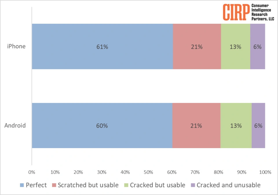 IT之家 3 月 30 日消息,消耗者谍报研究相助同伴(CIRP)日前发布美国智能手机用户陈诉,苹果 iPhone 用户更倾向于以旧换新,安卓用户更倾向于生存。CIRP 本日发布了后续陈诉,表现了智能手机在生意业务、出售、留给家人 / 好友时的状态。 陈诉表现,美国市场二手安卓手机和 iPhone 在生意业务、出售、留给家人 / 好友时的状态根本上雷同,IT之家附表格信息如下:60% 左右的手机屏幕齐备、21% 的手机出现划痕但可以使用;13% 的手机破裂但可以使用;只有 6% 的二手手机屏幕破裂且无法使用。 电池状态方面,四分之一左右的二手 iPhone 和安卓手机满电情况下可以使用一整天大概更长时间。33% 的 iPhone 机主表现可满足白天使用,42% 的安卓手机可满足白天使用。 |