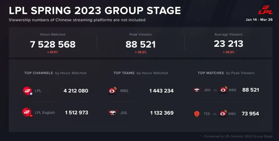 LPL春季赛通例赛的角逐已经全部竣事,本年的通例赛在国内受到了不少吐槽,比如很多人会以为角逐没有之前精彩,大概以为气力较弱的队伍太多,总体观感不如从前。而外媒迩来也统计了LPL在外洋的收视率,果然也是暴跌了。 详细的环境如下,本年春季赛LPL在外洋的总观看时长是7528568小时,对比客岁低沉了41%,最多的观看人数是88521人,对比客岁低沉了33%,均匀每场角逐的观众是23213人,对比客岁低沉了34%。 此中WBG是人气最高的战队,他们的角逐观看时长是1443234小时其次是JDG,观看时长是1132369小时,而人气最高的角逐自然是WBG大战JDG的,有88521人看,其次是TES大战WBG,有73954人看。 总体数据上来说,确实是暴跌了,不管是从观看时长还是从观众人数上来看,淘汰了30%-40%,这是一个非常浮夸的数据。而外媒分析收视率暴跌的缘故原由是本年LPL春季赛没有在AfreecaTV和越南平台直播,这两个平台在客岁的观看时长中占比靠近30%。 固然说越南和AfreecaTV确实造成了收视的下滑,但是就算撤除这两个平台,LPL的收视率在外洋一样是下滑的,而且正常来说,这个直播平台不直播了,想看的人自然可以去能直播的平台看,说白了还是吸引力不敷。固然越南观众流失,重要是由于sofm走了,而其他平台观众流失,重要缘故原由队伍太多了,摆烂的队伍又占很大的比重,精彩的角逐太少,质量下滑,自然看的人就少了。 固然也须要统计其他联赛的收视率变更,看看到底是游戏团体活着界范围内的关注度下滑了,还是说只是LPL有这种环境。也须要看看夏季赛到底会不会回暖吧! 那么,对于这件事变,你们有什么想说的吗?你们以为LPL外洋收视率了暴跌的缘故原由是什么呢?欢迎在品评区留言探究。 |