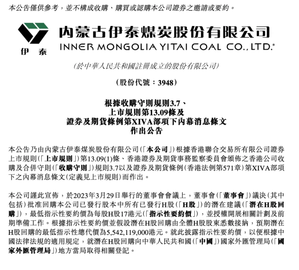 有钱任性 ” 作者|王磊 曹婷婷 有钱真好。 就在昨天,内蒙古煤炭龙头民企伊泰煤炭,推出了私有化要约回购筹划,筹划将香港发行的H股全部收回私有化,还要以溢价50%的代价收回H股股票。 按照昨天的伊泰煤炭的收盘价每股11.3港元,伊泰煤炭的收购代价在17港元每股。 至于为什么要打消H股于联交所的上市职位,并不是由于谋划不善。而是伊泰煤炭的管理层以为股价迟迟不涨而且交易业务低迷,公司股价被市场严肃低估了。 泉源:伊泰煤炭 这就是要告诉市场即便是提拔50%的代价,本身的股票仍旧有吸引力。 值得注意的是,即便是加上溢价50%的代价,这次回购价也没有到达上市第一年18.3元的汗青高点。 受此消息影响,本日伊泰煤炭泰煤炭早盘高开近15%,最高报价15.88港元,涨幅最高靠近48%制止发稿,伊泰煤炭报价15.76港元。 01 不差钱 在3月29日晚间举行的伊泰煤炭董事会集会会议上,董事集会会议决允许了回购公司已发行股本中全部已发行H股的埋伏发起(埋伏H股回购),最低指示性要约价为每股H股17港元,并授权开展干系筹划及前期准备工作,预期埋伏回购的最低总代价为55.42亿港元。 泉源:伊泰煤炭 筹划收购当前股本的90%,当H股回购竣事后,公司打消H股于联交所的上市职位,伊泰煤炭已发行股本中的B股将继续于上交所上市。 伊泰为什么肯定要回购全部股票并注销港股上市职位?在公告中则给出相识释。 “思量到H股的交易业务量较低且运动性有限,导致公司难以在H股市场有效地举行融资。埋伏H股回购如落实,将为采取埋伏H股回购的H股股东带来一次性投资收益;H股退市如落实,将令公司可以或许节省与H股上市羁系合规干系的本钱及费用,董事以为埋伏H股回购及H股退市将对公司及其股东团体有利。” 交易业务量的低迷,也使伊泰煤炭融资的本事受到肯定范围,不易通过股权融资为其业务发展提供可用资金泉源。 也就是说,伊泰煤炭以为港股融资难,而且流通性低,每年不但要花高额的成原来维护港股上市职位,本身还不好讲“新的故事”。以是甘心花大价格、高溢价往返购退市,也不愿继续在港股上市。 简直,伊泰煤炭在港股股本只有3.26亿股,港股股本市值为36.84亿港元。从昨天的数据来看,成交量仅有360万港元,换手率仅仅为0.1%,从久远来看,港股动态市盈率只有2.28倍。 而制止中午休盘,换手率飙升至2.29%,成交额到达了1.17亿,高价回购股本的筹划,无疑给伊泰煤炭H股注入一股强劲的活力。 毕竟上不但伊泰煤炭面对融资难、估值低的标题,也是比年来煤炭行业上市公司面对的共同困难。 现在正值新能源飞速发展的时期,鼎力大肆提倡“碳中和”模式,煤炭作为传统行业势必受到打击。 泉源:伊泰煤炭 而且许多国家已经大幅度淘汰煤炭使用。以致已经出现了新能源替换煤炭的环境。以是煤炭股行业长期走势,本就存在着肯定的悲观因素。 再加上,煤炭股的代价走势,通常和商品期货的走势有较强的干系性,受制于其不稳固性,煤炭股低迷也不是没有来由的。 但股市的低迷并不意味着企业就不赢利了。 伊泰煤炭作为少少数拥有铁路的煤炭企业,不但在内蒙古备受推许,在煤炭行业也是不可忽视的存在。 泉源:伊泰煤炭 假如说山东人的宿命是有体例,那么内蒙人心田OS:能进伊泰和神华就好了。 由于伊泰煤炭真在实打实的赢利。 昨晚伊泰煤炭发布拟回购公告的同时,也公布了2022年报。年报中表现,公司总业务收入606.47亿元,同比上涨19.68%;净利润109.75亿元,同比增长26.98%;根本每股收益3.37元/股,同比增长26.69%。 泉源:伊泰煤炭 公司整年累计生产商品煤4830.53万吨,贩卖煤炭6600.05万吨,铁路板块累计发运煤炭9053.16万吨,煤化工板块累计生产各类油品和化工品140.06万吨,贩卖各类油品和化工品145.61万吨。 制止客岁年底可供股东分配的利润为311.7亿元。 而根据2022年中报,2022年中期红利70.48亿元,同比增长167.85%;总营收310.54亿元,同比增长54.0%;每股净资产为13.906元,同比增长10.7245%。 客岁100多亿元的红利,也意味着伊泰煤炭回购全部港股流通股必要的56亿港元(约合人民币49亿元),不到半年的时间就挣返来了。 真的是有钱任性,既然不被市场承认,干脆把散在表面的资源全收返来,差异你们玩了。 02 5万元创下中国500强企业 内蒙古伊泰团体是鄂尔多斯市本土最大的煤炭民营企业,发展到现在并不是一帆风顺。 35年前,首创人张双旺拿着5万元的启动资金,正式开启一段“神奇之路”。 1988年3月,已经在某国企工作了30年的张双旺看到了煤炭的红利,领导了伊克昭盟州里企业处20名行政超编职员和经允许调来的10名业务骨干,和盟行署签署了承包原盟州里企业公司为期5年的协议书。 泉源:伊泰煤炭 创建州里企业公司时,除了手里5万元的启动资金,另有40万元的财政乞贷,这就是当时30来个人手中的全部资产。 在公司创建初期,公司就确定了发展方向,重要举行煤炭的运销。但是在实践过程中,发展不停受到打击。 在创建公司之前,张双旺先后在杭锦旗皮革厂、呆板厂、石膏厂、综合厂、工业局等地方工作过,在公司发展初期,就办了一个砖瓦厂,当时的砖瓦正是发展火热期,公司发展徐徐进入正轨,但由于一位员工在工作时受伤,封建迷信的风水标题吓退了其他员工。 砖厂赔了钱,张双旺又拿3万多元,办了个露天煤矿,结果连一块煤都没见到。接下来搞黄芪,由于职员分配标题又赔钱;办大理石厂,还