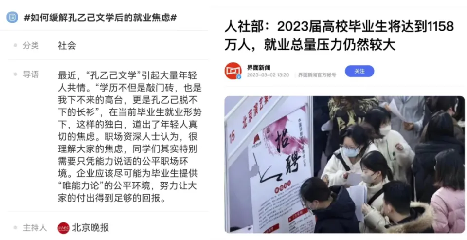 撰文|何芙蓉 编辑|王潘 已往三年,疫情犹如一块全能“遮羞布”。行业的不景气、业绩的不达标、工作生存的不快意等,全部负面效果都有了一个看似公道的表明。 客岁年中,于强主动辞去某头部互联网企业的工作,脱离上海回到三线故乡。“当时上海受影响快要3个月,本身心情就比力瓦解了。加上公司降本增效,留下的人工作压力也越来越大,心一横就辞了。” 相比已往两年更多互联网打工人的“被结业”,于强选择了主动竣事这种生理煎熬。 脱离上海泰半年的于强,现在在故乡固然不必再交着一个月大几千的房租,但来到小都会他险些找不到与原来专业对口的工作。于强新的烦恼也随之而来,即薪资大打扣头与丧失工作成绩感。 裁人、赋闲、躺平、拒绝内卷、逃离大厂与北上广……这些征象在过年两年的职场语境中已是常态,大部门年轻人也在这种“常态”中学会与不快意的职业履历暂时自洽。 陪同着新的一年各人重新回到社会生存的正轨,开年找工作的等待值也被拉上高点。 现在正值金三银四,但就业情况好像并没有完全同步回暖,打工人和结业生们的就业焦虑,便在这种预期毛病中被规模开释。 就业乍暖还寒,年轻人何去何从?2023年,就业形势依然充满寒意。 打开脉脉,热搜榜前三分别是“2023找工作的心伤进程”“TW公布2023应届生解约”,以及“当下就业情况为啥HR还诉苦招不到人?”职场交换软件好像渐渐沦为打工人赋闲心得的展板。其他交际软件上同样充斥着各种“就业难”的内容分享。 “快要瓦解了,感觉断港绝潢了。不绝找不到工作,口试都没有用果,真的不知道该怎么办,好无力。”一位披着阿里巴巴马甲的脉脉用户发帖体现。 在这种共鸣之下,引来了不少人的围观,乃至有用户安慰称,“没事,各人都一样”,也有人体现”降薪一半终于收到offer”,更有人感到不可思议“阿里出来的都找不到工作,这么卷的吗”。 薪资打折、投递无望、长等待业,打工人的就业焦虑在时间流逝中与日俱增。降本增效已是互联网的一个一样平常命题,而在此期间脱离大厂的互联网人好像很难再找到与此前可媲美的工作。 “在生存压力与工作压力之间,好像只有遭受住了工作压力才华维持生存的正常运转。”脱离互联网快一年了,佳林的压力没有由于脱离一个高压行业而随之消散。 与大多数没车没房没孩子“一身轻”的年轻人不一样,至今想起本身“被结业”的履历,佳林仍然心有余悸。“本身已经快35岁了”被结业后,这句话在佳林在心田反响了无数次。 客岁年初,佳林在北京找了两个月的工作,但始终没有收到offer。无奈之下他选择回到二线故乡,在曾经大厂配景的加持下,佳林收到了一个传统药企的职位约请。 ”当时疫情还在一连,我想药企应该是一个不错的选择,HR告诉我他们传统企业不会裁人,比力稳固。”即便在薪资报酬大打扣头的情况下,于强照旧同意参加,而背后的无奈则是他也没有其他可选项。 令他没有想到的是,入职不到一年,佳林所在部门的团体绩效比例被下调,其个人的薪资程度再次被拉低。 据佳林反映,他曾经在某互联网公司年薪靠近50万,而他现在的月薪仅维持在1万左右。“现在家里房子每个月要还7千多的月供,尚有小孩读书,都是用之前的存款补贴,现在的生存才华拼集。” 而降薪参加传统企业,在佳林心田深处始终只是一个过渡选择。固然工作压力越来越小,但家庭的各种付出却不得不让他为收入发愁。“假如有机会,我照旧想回到互联网行业的。”佳林感叹。 脱离大厂、脱离互联网之后,有人选择稳固,有人选择从事体力劳动不再精力内耗。但现真相况是,压力只会转移,不会消散,选择轻松稳固的工作就得以低薪作为代价,脱离北上广的条件也是丧失更多的工作机会。 不但是职场打工人,这个春招季,结业生们大概面临着更大压力。迩来,交际媒体上“孔乙己文学”一连高热,在抱负与实际之间,年轻人的就业焦虑广泛外露。 除了讨论年轻人“可否拉下脸来从事更多体力劳动”,背后更直接的缘故因由实则是当下结业生们就业压力的进一步走高。 数据体现,2023届天下平凡高校结业生规模预计达1158万人,同比增长82万人,再创新高。与此同时,“北京硕博结业生人数首超本科生”也在“金三银四”之际登上热搜,不但待就业结业生的规模越来越大,同时学历竞争也更加剧烈。 工作难找、渴求稳固、想躺平又不甘心、想拿高收入又怕卷、互联网和金融这些已往最具吸引力的行业也出现许多新标题……抵牾、焦虑、选择难,是时下结业生们求职的“真实群像”。 站在校园门口的结业生,格外等待一个有好消息的“金三银四”、一份付出有回报的工作。 互联网雇用初现复苏迹象往年这个时间,结业生以及跳槽人们正跃跃欲试,试图在“金三银四”雇用季拿到满足的offer。而进入互联网大厂也是曾经大多数人的一个目的共识。 已往两年,冷气包围互联网,降本增效、裁人、业务缩减的消息反复传来,“互联网大厂”这一曾经让众人趋附者众的地方开始上演种种的不确定性。 履历降本增效的震荡,互联网行业对就业者的吸引力有在显着降落。但逃离互联网就能不卷吗?脱离北上广就能躺平吗?答案显然是否定的。 陪同着线下经济的规复和斲丧复苏,各行各业正在渐渐扩大用工需求,尤其是涉及衣食住行的各类民生行业看到回暖迹象,这