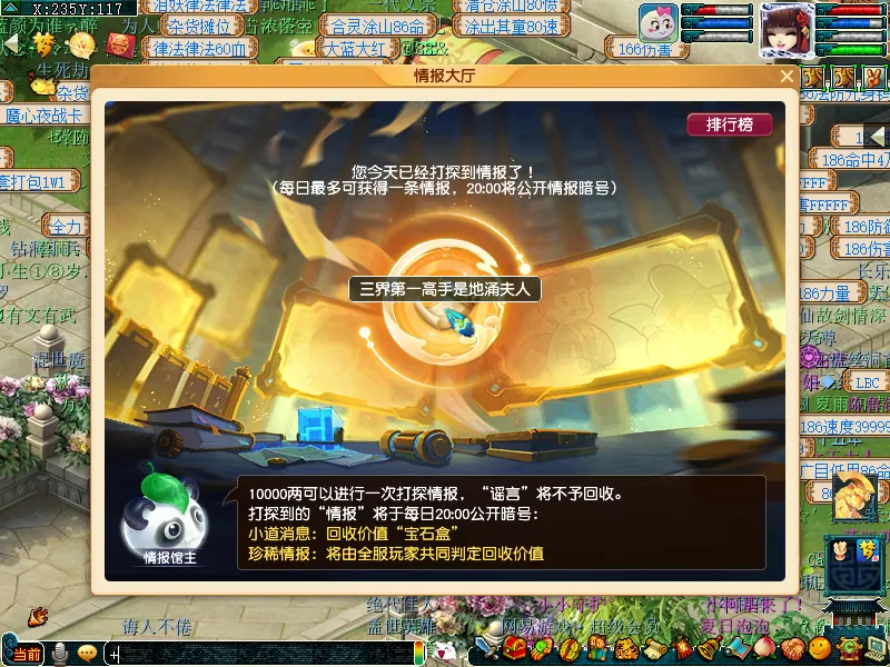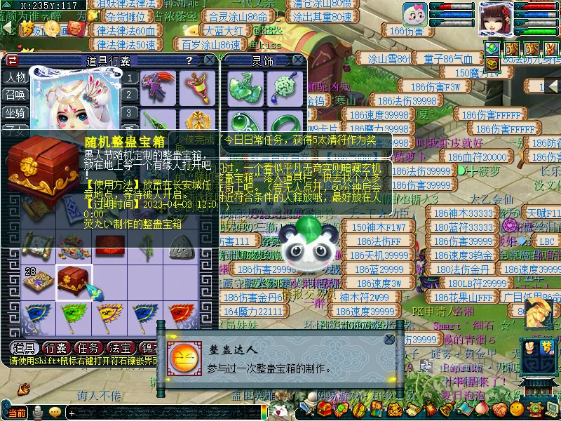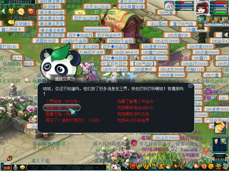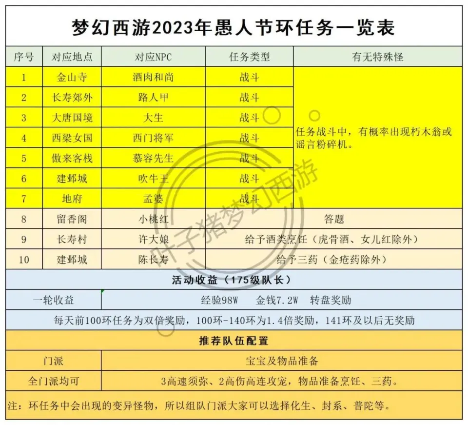 梦幻西游2023年愚人节运动如今已经上线全服,本次运动周期为2023年3月30日-2023年4月3日,任务范例只有环任务和特色任务,属于轻量型节日运动。下面,就给各人简朴先容一下吧! 一、环任务旅程较短,战斗难度中等偏下 运动期间全天,玩家(脚色品级≥30级,队伍人数≥3)可在长安城(237,113)谍报交易业务员处领取任务,本次环任务战斗难度不高,旅程相对一样寻常,前100环为双倍夸奖,101至140环为1.4倍夸奖,141环后无夸奖。 具体任务如下: 本次运动转盘夸奖一样寻常,最好的夸奖为星辉石,其次为宝石、强化石等,想要带队致富的玩家可以多多关注一下! 除此之外,本次环任务存在特别“飞行符”,对刷环任务有极大助力。 二、你也能当筹谋,谍报小馆特色玩法来袭 运动期间每天09:00至20:00,各人可以到运动NPC出选择玩家可打开“谍报小馆”。 打开后,可以以10000两/次的代价打探谍报,谍报消息共分为谎言和谍报,每位玩家每天最多可以得到一条谍报,得到之后将无法打探消息。 这个玩法非常简朴,点下鼠标斲丧一万即可随机得到谎言和谍报,比力得当多开玩家。 运动期间,将在20点开启全服玩家判定运动,此中不但有“荣幸儿”、“小黑子”尚有“热心网友”。小道消息的采取代价通常为“宝石盒”,珍稀谍报则会根据全服玩家评定决定采取代价,运气好的小同伴乃至可以得到高级魔兽要诀、130级附魔宝珠等物品。 注:当你打开谍报小馆右上方时,还可以发现一个“练习时长两年半”的彩蛋哦!各人不妨猜猜这里藏着什么网络梗? 三、整蛊宝箱高兴多,不妨拿给挚友试试 运动期间,玩家可以找到“谍报交易业务员”制作“整蛊宝箱”。本次的“整蛊宝箱”分两种,一种是随机整蛊,一种为专属整蛊,制造宝箱须要耗费50点体力。 玩家可以将制作好的整蛊宝箱放在长安城恣意地点,专属整蛊宝箱须要交给挚友才气触发。 当挚友/玩家打开宝箱时,就会触发“整蛊玩法”,非常风趣。须要留意的是,这个整蛊玩法会有概率返回自己身上,各位小同伴在整蛊之前要多多把稳哦。 小结 由于本次愚人节运动颇为轻量,以是运动成绩的难度也非常低,唯一难度就是须要刷100次环任务,晚上20点的时间点赞、点踩20次,对于热爱刷成绩的小同伴还算友爱。除此之外,发起多开小同伴每天都去点下“谍报小馆”,这个玩法不但很难亏钱,尚有概率博到好运哦! |
