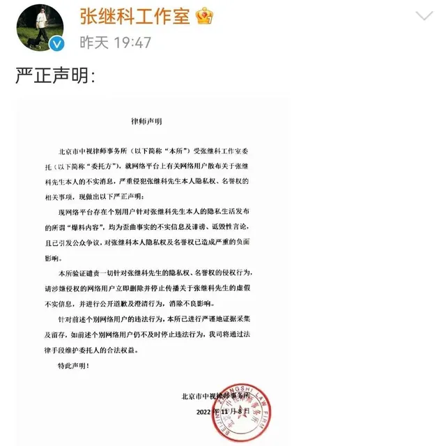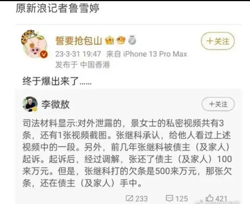 迩来,张继科负债不还拿景甜隐私照抵债的爆料埠孟,只管张继科工作室第一发布声明严肃斥责爆料不实,却仍未能阻断传言。在工作室否认之后,又有大V爆料张继科负债及外泄景甜私密照皆属实,引发热议。 该大V连续发布两条动态,称根据自己把握的司法质料来看听说属实,并曝光部分细节。他称景密斯私密视频一共有三条,另有一张是视频截图,张继科承认给旁人看过此中的一段视频。而关于债务的部分,张继科早前被借主告状,颠末调解后,张继科归还了债务100多万,但是张继科打的欠条是500多万,如今那张欠条还在借主及家人手中。 这则爆料有具体细节,爆料人又是热门法律博主,许多网友看后一时也摸不清到底是真是假,不知他是真有料,照旧蹭热度。据悉,该大V并不是平凡的自媒体作者,照旧一名记者,从2003年开始跑消息,是《经济观察报》的首席记者,曾经得到过亚洲出书业协会良好消息奖,照旧湖南财政经济学院客座教授。 粉丝看到这则爆料后直接艾特张继科工作室及状师,要他们立即取证,有的网友以为500万的欠款对张继科来说太小儿科,属于是看不起他,究竟不说他曾经得到过的成绩,光录制综艺节目就挣了不少钱,500万跟他的身价比起来不算什么。 另有粉丝直接指出李微敖曾经造谣被警方打脸,属于是不可信的人物。 张继科与景甜曾经谈过爱情,两人一度难舍难分,各种偶遇照片不绝,厥后莫名就有了分手听说,分手来由还特殊奇葩。在两人未分手前,就有张继科喜好赌博的听说,有爆料称犯裰缘故原由是景甜不乐意再无底洞地帮张继科还钱,告急脱身。 另有狗仔公开爆料称张继科以买婚房看成来由向景甜乞贷,结果景甜发现张继科并不是乞贷买房子,而是有其他用处。而且,张继科乞贷还不还钱,景甜咨询过张继科的某位明星前女友,得知张继科曾经也借过几百万,瞬间察觉不短冖便分手了。 乃至张小寒还曾有过一段漫画爆料,称某跨界转型综艺咖的男星乞贷不还,偷拍自己和女明星私密照,另有网友爆料袁姗姗就借过钱给张继科,也有业内出来转发。 各种爆料讲得有模有样,让听说变得越来越真。然后,张继科发布了声明,称网传消息不实,严肃陵犯了张继科的隐私权和光荣权。固然这则声明并没有提及任何具体爆料指向,但是听说照旧压住了。 再说到张继科走漏景甜私密照的听说,张继科同样选择使用法律本事维权,声明较上一份有进步,明白指出张继科身上无任何债务纠纷,也不存在侵害他人隐私以求自保的环境,全部谣传内容均为捏造。只是,各种明星声明翻车事故太多,这一回张继科的声明也没有能完全得到网友力挺。 张继科一封又一封的发布声明,也阐明他短时间很难撇清身上的风波。俗话说,无风不起浪,在声明不起作用的条件下,张继科大概必要更有用力的本事澄清,比如网友发起报警处理惩罚,大概告状维权。也渴望景甜工作室也可以大概实时回应,如果是假的,别造成进一步影响。 |