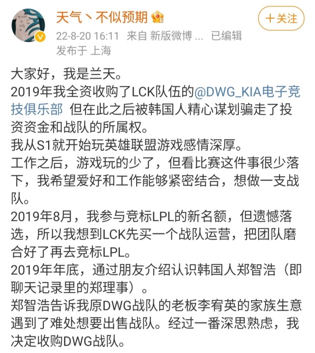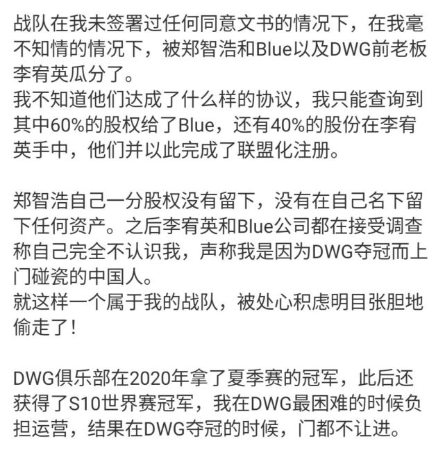 DK战队本年炎天的表现不算太好,在他们公布和Nuguri重新续约的时间,绝大多数观众都以为DK会成为本年炎天最强的黑马。但没想到夏日赛真的开打之后,这S10上中野三兄弟一个比一个离谱。而且由于Nuguri着实是太浮夸,在近来的LCK季后赛中,DK乃至把已经调到二队的Burdol重新提了上来,曾经的S10冠军上单沦为替补。 而在场外DK也欠好过,不久前有一位叫做“兰天”的老板在外交媒体上公开了自己投资好汉同盟战队的酸楚历程。 简朴的来说就是DK(DWG)战队在S9的时间碰到了难处,当时兰天想竞标LPL名额没能乐成,于是就把眼光放在了LCK。然后兰天通过朋侪熟悉了韩国人郑智浩,通过郑智浩的先容兰天得知了DWG战队的处境,在颠末深图远虑后,兰天决定收购DWG战队。 19年11月兰天以3000W+的资格拿到了DWG战队100%的股权,随后郑智浩表现盼望加入俱乐部运营,于是兰天就送给了郑智浩10%的股份。 从20年1月开始事变变得哺咝刷,郑智浩表现兰天的资金配景很难被韩国担当,要求兰天授权他代持兰天的股份,来由是出于对俱乐部发展的思量,兰天表现同意。 但兰天的至心并没有得到回报。之后郑智浩以LCK不喜好LPL投资者为由,不乐意向兰天透露DWG同盟化的一些具体资料。但这时郑智浩的态度仍旧是“奉劝”,来由也仍旧是“他为了俱乐部好”,兰天没有发现标题,于是再度表现同意。 大概是以为自己的底气充足了,郑智浩从这时开始袒暴露貌寝的一面。郑智连合了一家大公司开始一起打压兰天,郑智浩的态度从“奉劝”逐步酿成了“威胁”。 兰天意识到自己上当但为时已晚,郑智浩拒绝兰天任何方式的沟通。而且在没颠末兰天的同意,在兰天绝不知情的环境下,DWG战队被几个韩国人给瓜分了。而且本领极为高明,郑智浩本人没有留下任何股份,更是没有任何资产。之后几个韩国人开始倒打一耙,称兰天是看到DWG在S10夺冠后想要碰瓷的“小人”。 兰天约请了韩国第一的状师事件所来资助自己处理惩罚此事,但事变已往两年了,却没有任何希望。状师乃至直言在这件事上帮不到兰天,而且要求兰天及时止损,放弃DWG相干统统事件,仅仅是让郑智浩归还兰天3000W的本金。但上面也提到了,郑智浩名下没有任何资产,完全没有赔付本领,也就是说这本金大概率也是要不返来的。 事变大概就是如许,兰天还晒出了部门条约来证明自己没有说谎。用一句话来概括就是:战队被韩国人给偷了,光偷了还不算,他们还要反过来咬人,称兰天是站在“险恶”的一方。兰天在动态中专门@了好汉同盟官方,不外官方如今还没有任何亮相。乃至说由于兰天在动态中提到了T1,导致部门T1粉丝炸毛,开始在批评区攻击兰天,让人大开眼界。 兰天末了维权乐成的大概性大概会比力小,如今就看拳头会不会关注到此事了。如果拳头能加入办理的话天然是最好的,如果拳头办理不了的话,那这可真的算得上是一大丑闻了,这以后谁再想投资好汉同盟联赛,多少要掂量一下了。 |