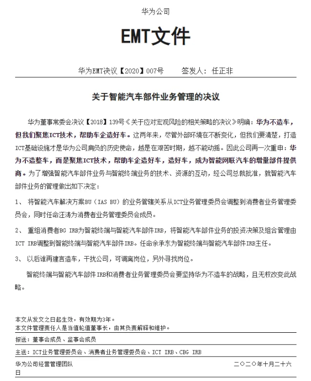 每经编辑:杜宇 3月31日,有消息称,华为再次关于汽车业务发出决议公告。公告由华为首创人任正非署名发出,再次夸大“华为不造车,有效期5年。”除此之外,任正非还对华为标记在汽车筹划上的暴露提出了严酷要求,夸大不能利用华为/HUAWEI出现在整车宣传和外貌上,不能利用“华为问界”“HUAWEIAITO”等。 值得注意的是,华为于2020年11月就曾在心声社区发布《关于智能汽车部件业务管理的决定》的帖子,明确“不造车”。 据第一财经,3月31日晚间,余承东在华为内网发文,疑似回应华为不造车决定,“这个期间变了,这只会让我们更加艰巨!多少年后,各人都会看明确的!留给时间去查验吧!” 停止现在,已看不到该批评。 据华为网站,余承东出生于1969年,结业于清华大学,硕士。1993年加入华为,历任3G产物总监、无线产物行销副总裁、无线产物线总裁、欧洲片区总裁、战略与Marketing总裁等。现任华为终端BG CEO、智能汽车办理方案BU CEO、智能终端与智能汽车部件IRB主任。 徐直军再次重申华为“不造车”:严禁华为作为汽车品牌,会整理整理全部门店、宣传物料3月31日下战书,华为举行2022年年度陈诉发布会。华为轮值董事长徐直军以及华为首席财务官孟晚舟出席了发布会。 会上,徐直军再次重申华为“不造车”。据报道,31日,华为内部再发关于汽车业务决议的公告,该公告由华为首创人任正非签发,再次夸大华为不造车,有效期5年,而且对华为标记在汽车筹划上的暴露提出了严酷要求,夸大“华为/HUAWEI”不能出现在整车宣传和外貌上。 徐直军表现:“31日上午,华为发布了不造车的决定,我们决定的‘有效期年为5年’(这点)引发讨论,但现实上我们全部文件的有效期最长就是5年。华为的战略没有变革,我们会资助车企造好车,成为智能网联汽车增量零部件供应商。迩来我们确实有些部门、个人、有些互助同伴在滥用华为品牌,我们不停在查处过程中,华为颠末30年构筑的品牌,不会被谁滥用。华为没有造车,也没有任何品牌的车。我们这次文件中,也对品牌的题目举行了明确的要求,严禁华为品牌出现在任何车的品牌前面、大概作为汽车品牌。我们会对全部门店、宣传物料举行整理、整理,使之回归到战略和定位上来。” 2019年,华为正式建立智能汽车办理方案奇迹部,定位是“提供增量部件”。但多年来,业界关于“华为要造车”的推测从未停息,只管华为已经多次夸大“不造车“。 余承东连夜下令:问界拆除全部华为标识据证券时报,内部发文重申不造车、且严禁华为品牌出现在汽车品牌前面,或作为汽车品牌后,3月31日夜间,华为终端BG CEO、智能汽车办理方案BU CEO余承东亲身下达:问界门店将于4月1日开始拆除全部干系华为字样的宣传物料。 4月1日早间,华为内部人士向证券时报·e公司记者透露:“这个我没有看到具体关照,但门店是接到了干系关照。” 4月1日早间,有深圳问界门店员工向证券时报·e公司记者表现,门店已接到华为方面发的关照,要求4月1日开始拆除全部干系华为字样的宣传物料,而且平常宣传话语中也不能再叫“华为问界”了,但还是可以叫“问界”。 据相识,在华为内部,有关造车与不造车,不停存在分歧,余承东不停主张造车,但支持的华为高管甚少。 逐日经济消息综合证券时报、第一财经、华为官网、华为心声社区、每经网(记者 王晶) |