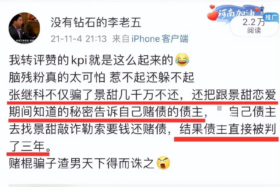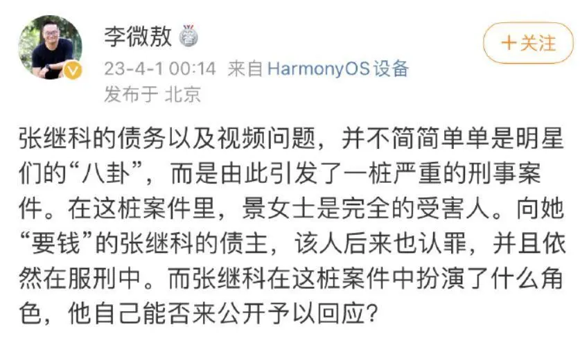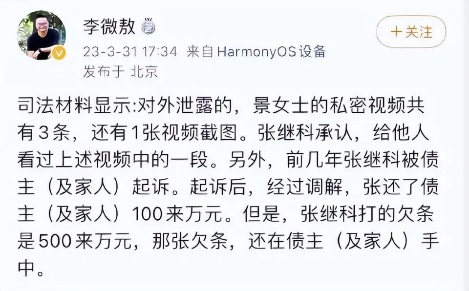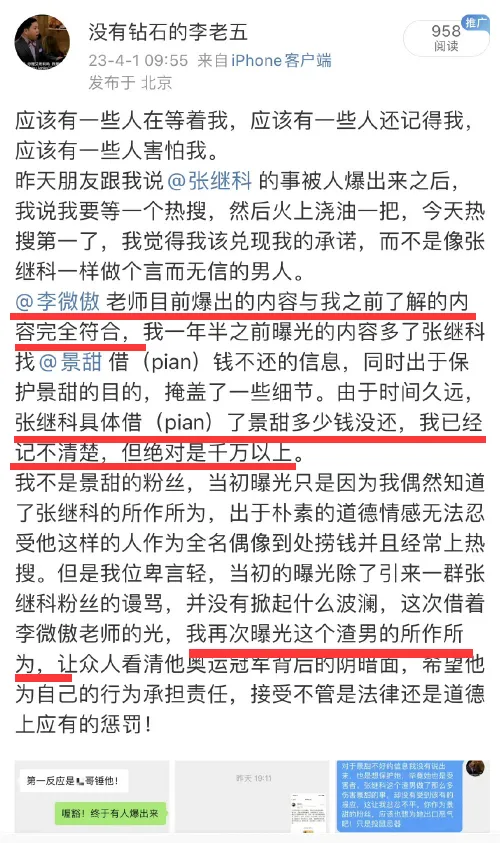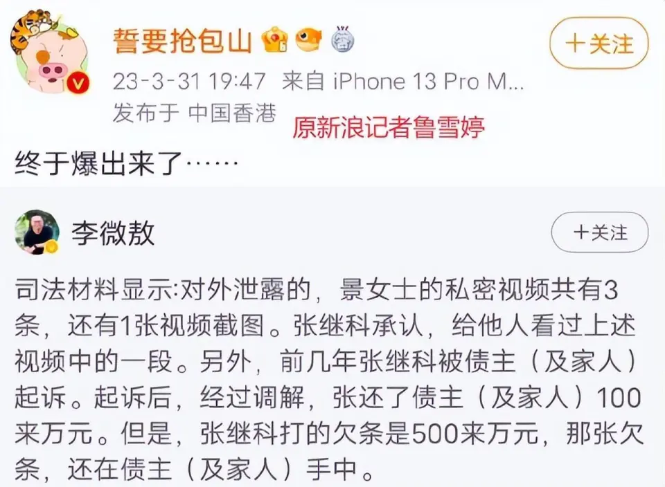 4月的军号刚刚吹响,娱乐圈便爆出劲爆大瓜,此次被爆料的对象是前乒乓球国手张继科。 有网友爆料,张继科作为体坛风云人物,固然曾争得了不少荣誉,但其私下品行令人堪忧,曾经沾染上赌博的恶习,效果赔钱赔的精光,由于无法付出巨额赌债,张继科便将本身与前任恋人景甜的私密照作为筹码,想借此来抵债脱身。 而张继科的借主把握了这些私密照片之后,很快找到景甜举行要挟,事后景甜果断选择状告对方来公道维权。 这则看上去有鼻子有眼的听说在外界掀起轩然大波,而张继科这边也很快作出回应,直接甩出了白纸黑字的诉讼声明。 只是爆料者“李微敖”并未因此善罢甘休,而是继续出言声讨张继科,此人连发三条动态,爆料其时与张继科有债务纠纷的借主在遭到景甜告状之后已经伏法下狱,而张继科也被借主告状,只是张继科本身的债务是500万,终极只还给借主100万,剩下的钱打了欠条。 有人对这位爆料者的身份举行考据,发现这位叫作“李微敖”的爆料者是竟然是专业记者出身,是经济观察报的在职记者,此前曾得到不少国际大奖,从事消息行业已经长达20年,可以看出爆料者的口气非常倔强,并体现本身已经把握了此事的干系司法质料。 除了李微敖之外,尚有一位博主也浮出水面,这位名叫“没有钻石的李老五”的博主发布动态同样力挺李微敖,声称本身早就知道张继科与景甜的事,而且李微敖所说的均属实。 翻看这位博主的交际动态,可以得知早在2021年,他便多次发文怒斥张继科,声称他嗜赌成性还诈财骗色。 别的这位博主还透露了更多细节,声称张继科曾骗景甜在青岛买别墅做婚房,这笔钱得手后就被他用来归还赌债,骗了景甜几千万。 这位博主也体现张继科曾将本身与景甜的爱情私密都告知借主,末了借主由于以此诓骗打单向景甜要钱而被告状,终极被判处三年有期徒刑,不知道是不是怕被告,这位博主现在潜伏了有关张继科的全部动态。 除此之外,尚有前新浪娱乐的两位从业人士鲁雪婷与卢旭宁分别转发了李微敖的动态体现力挺,使得这件事引发的舆论继续发酵。 更加让各人加重猜疑的是,有网友扒出景甜从前上综艺节目时的片断,其时的景甜曾透露本身在2019年由于私人的事故曾经遭遇了巨大的人生变故,以至于本身几天几夜都不敢出门,由于久未公开露面,一度有听说说景甜已经与某富商秘密完婚。 从时间线上看,景甜所提及的这段遭遇与她与张继科的分手节点险些符合,而当年张继科与景甜被爆分手之际,双方不停也没有明白透露两人的分手缘故起因。 在客岁也有网友爆料,说两人分手的隐情着实是张继科有赌债,以买婚房为由向景甜乞贷,现在回过头看,统统都有迹可循。 事故演化到当下这种地步,张继科无疑已经被各路舆论架在火上烤,景甜也由于此事被扳连进来,从现在来看,张继科方的辟谣声明可信度渐渐低沉,且不知景甜是否会出头回应此事,给予各人一个本相。 |