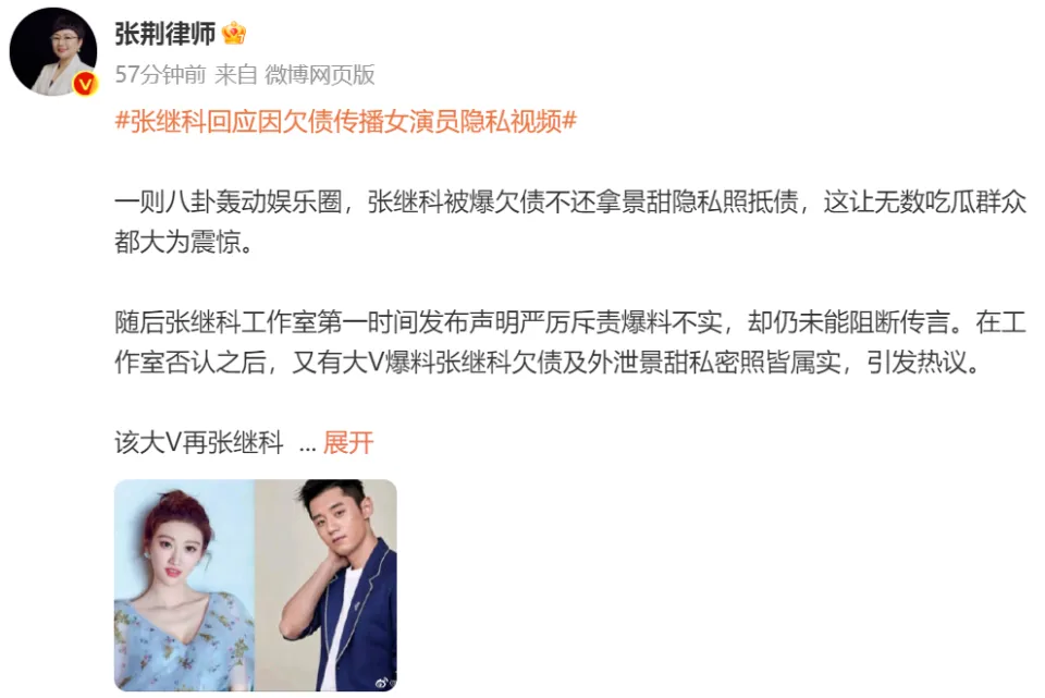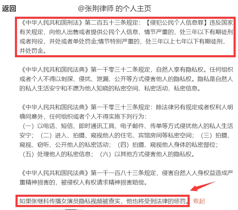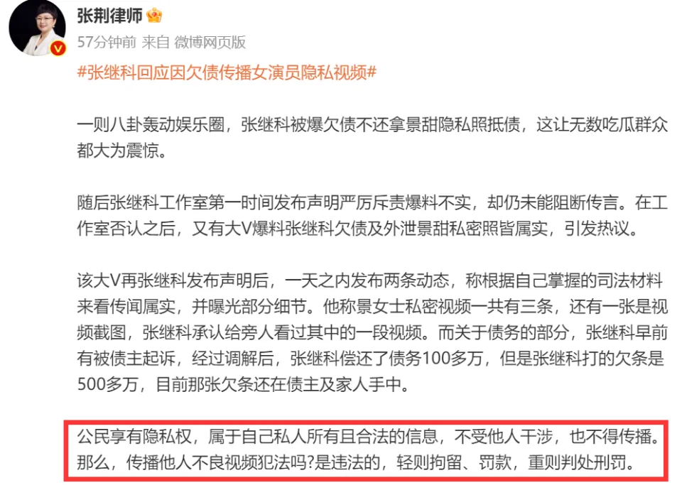 谁也没想到,张继科与景甜分手4年后还会有下文,4月1日,有知情人士曝出张继科因欠赌债流传景甜隐私视频还债,从现在的环境看,此事并非八卦爆料云云简朴,疑似已经上升为刑事案件,而张继科为了尽快平息此事,已经连发两条维权声明,可局面的演变显然超出他可控范围,眼看着舆论仍旧在连续发酵中,各人也都在期待末了的原形。 4月1日当天,媒体电话接洽到张继科本人,盼望他就爆料一事正面回应,电话中张继科否认负债也没有流传私密视频,但记者意图追问更多细节时,张继科却急忙挂断电话。 张继科的态度与反应更是给外界舆论添了一把火,毕竟如果爆料的内容都是谎言,张继科大可以借助媒体据理力图,自证明净,而张继科的当下表现简直颇为反常,给人一种张皇心虚的感觉。 而针对这起事故,已经有专业状师参加举行解读,为各人遍及与讲授非法流传他人隐私信息的举动须要负担怎样的责任? 着名状师张荆就此事发表本身的观点,抛开赌债纠纷不谈,单说流传他人隐私视频的举动已经显着得罪法律,张状师表现,诸云云类的举动,轻则拘留罚款,重则判处刑罚。 张状师还根据干系法律具体举行解读,对于流传他人隐私视频的举动,情节轻微者可以处五日以下拘留五百元以下的罚款,情节较重的要处五日以上十日以下的拘留,而且处以五百元以下的罚款。 而违反干系规定,向他人出售大概提供个人信息,情节恶劣的会处以三年以下有期徒刑大概拘役,并处大概单处罚金,情节特殊严峻的,会处以三年以上七年以下有期徒刑并处以肯定金额的罚金,以是如果爆料被查实,张继科将要受到法律的处罚。 据悉,张荆在业内颇为着名,拥有近万万粉丝,她执业于北京市两高事故所,以是她从法律层面举行的专业解读享有很高的权势巨子性。 回到这起事故中,张继科除了疑似向借主提供景甜的私密视频之外,还被爆料曾向许多圈内人士借过钱,后期都没有予以归还,而且之前的借主手中还留着张继科的欠条,本应该归还500万的金额,张继科却仅还了100万,现在疑似张继科的欠条也被曝光。 与此同时,演员邓莎与景甜的谈天纪录也疑似遭到曝光,在谈天纪录中提到本身与田亮曾经向或人乞贷,但对方不停乞贷不还,从语气与内容不难推断,邓莎口中的乞贷者大概率是景甜当时的男友张继科。 别的张继科还被爆以买婚房的名义曾向景甜乞贷,钱得手后就被他拿去还债,分手之后,张继科也没有归还这笔钱,如若统统都是毕竟,那么张继科这个人简直是嗜赌成性,操行鄙俚,景甜作为无辜受害者着实是被对方诈财骗色。 停止到现在,又有一位圈内人士疑似对此事发声,着名监制谭飞发布动态,声称本身也听说过那件事,固裙娓代暗昧,但不少网友猜疑谭飞所指的就是张继科与景甜一事。 在更多细节披露之下,目远景甜对此没有作出任何回应,而张继科之前发布的声明在繁多的证据眼前也不再存在公信力,且看针对此事,张继科方是否还会继续澄清辟谣,亦大概拿出有说服力的证据予以佐证。 |
