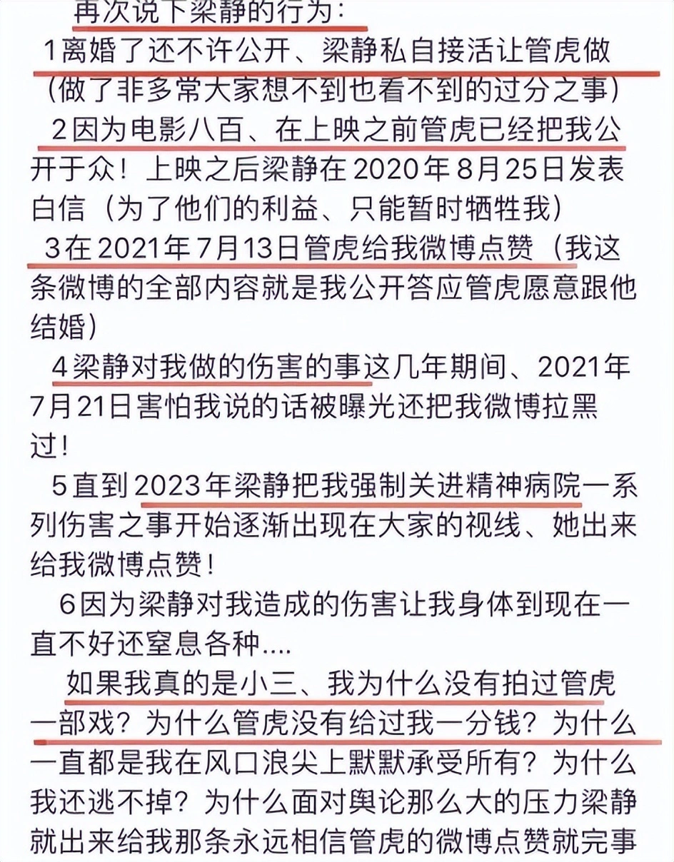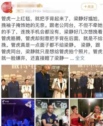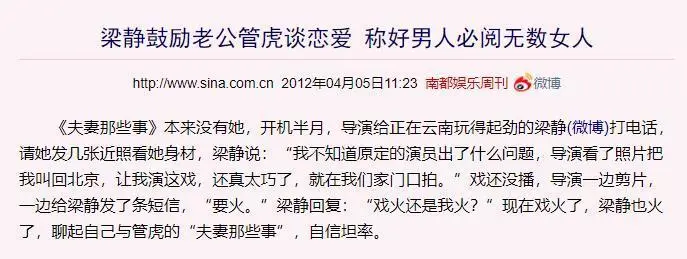 这次,马伊琍赢了。 大概这场仗,一开始梁静就输了。 “我可以为管虎去死”,凭着这个信心,她在马伊琍身边,看着管虎和马伊琍甜甜蜜蜜谈了5年爱情。 在这期间,她不动声色的逐步捉住了管虎的心。 得到了管虎之后,她用一种很奥妙,但是能让管虎觉察到的方式催了婚。 但这似乎预示着梁静在这段感情里,不停都是弱势。 在和管虎当了18年模范夫妻后,他们的婚变成了热门话题。一位叫做丁昱彤的女演员不绝的在网上控诉叫板。 核心内容就是要求梁静官宣已经仳离的毕竟。但毕竟有没有仳离谁也不知道。小三当的义正辞严。 纵然在娱乐圈,如许的活动也充足颠覆三观了。 可事变吊诡之处在于,梁静和管虎夫妇完全不回应。 尤其是管虎,在丁昱彤连珠炮般的对着梁静发难的时间,他完全没有作为。 就在风波正旺的时间,管虎梁静夫妇出席运动。这边梁静仍旧笑眯眯的维持着局面。而她旁边的管虎,一只手始终别扭的放在背后,故意偶尔的似乎在避嫌。 这就更让这件事增加了几分话题性。梁静到底做了什么,让管虎在公众场合能云云避嫌? 01管虎和梁静的婚姻绕不开一个人,那就是马伊琍。 浮夸一点说,管虎是梁静从马伊琍手里抢过来的。 当年,管虎一眼看中了照旧弟子的马伊琍。 一个青年导演才起步,一个年轻演员正发展。 两人联手拍了《黑洞》,奇迹生存上都是好搭档。 年轻女孩,总有三两个闺蜜。 马伊琍的闺蜜就是梁静。 梁静没有马伊琍那么荣幸,她的长相在当时不受接待,又不是专业院校结业,人脉也不可。 看她在家闲着,马伊琍就拉着她一起去管虎剧组试镜,想帮帮她。 没想到,这一活动,彻底改变了三个人的运气。 这一见,梁埋头田就不淡定了。 她对管虎动了心。 可当时马伊琍和管虎正如胶似漆,她也没办法。 这一等,就是5年。 马伊琍和管虎两人的题目也表现了出来。 一个大夫君主义,一个大女子主义。 管虎要的是一个绝对服从,乐意在家为他摒挡统统的贤内助。 年轻时的马伊琍则更乐意在奇迹上拼。 生存上也要求和管虎不相上下:“凭什么我就要回家做饭洗衣服,不大概。” 但梁静就不一样了。她在马伊琍发火的时间,冷静的为管虎做饭,摒挡家务。 管虎用饭前不爱洗手,她就带着湿纸巾,管虎自己懒得擦,她就帮着擦。 云云种种一对比,管虎心田的天平就倾斜了。 但用低姿态换来的婚姻,想要维持的好,就要不停低姿态。 梁静曾绝不避讳的说,在婚姻里就是要示弱。 婚后,为了到达管虎的要求,她统统都围着管虎转,把管虎当儿子养。 拍戏,管虎为了在演员里树立威信,就拿梁静开刀。 在国外拍戏,梁静已经到了车跟前,管虎也立即下令车开走。 来由是说好9点开车,你9点才走到车跟前。 梁静末了只能自己一个人在异国他乡想办法去和剧组会合。 剧组的人都说管虎太过了。 但她乐此不疲:“挺好的,如许他的威信就能立起来了。” 在家,更是当甩手大爷。 在一次采访中,主持人问管虎:“你会做饭吗?” 管虎非常不屑:“我为什么要做饭,不大概。” 梁静不但不让管虎做饭,就连用饭都差点替管虎承包了。 去朋侪家做客,进门梁静就给管虎用湿巾擦手。 再把他的衣服叠好放到袋子里。 一顿饭,自己没怎么吃,就给管虎夹菜剥螃蟹。 管虎重新至尾就只管吃。看得朋侪们默默无言。 但他们俩却共同默契,看得出这就是一样平常的生存状态。 梁静说不须要管虎改正,自己都能共同,由于爱的就是管虎这个干劲。 别人看着累,但梁静乐此不疲。她以为自己回归家庭之后,管虎更爱自己了。 而管虎对梁静做的这些并没有太多称赞。面对各人都夸梁静贤惠的时间。他有些不屑一顾的说:“我以为这梁静不像看上去那么傻乎乎的。” 以致在生了女儿不太悦目,管虎直接问她:“你认识郭德纲吗?” 曾经,梁静是个暴性情。和管虎打骂,曾经一言不合就要跳车。 管虎则直言:“你要如许,我们没发处,你要温柔。” 末了,她硬生生的改变了自己的秉性。 由于以为管虎太完善,她甘心委曲自己。 那她不担心自己心中云云完善的丈夫也会吸引别人吗? 她不但不担心,还特殊鼓励丈夫多谈爱情。 02、梁静从不束缚管虎的活动,以致鼓励他谈爱情。 在梁静看来,夫君的才华是须要“阅女无数”才气结果的。 况且像管虎如许的才子,须要爱情给他灵感。 可她不怕管虎真的跑了吗? 也不是。 她把自己变成了管虎的附属品。 “夫君是容器,女人是水,嫁给什么样的夫君,就要变成什么样的水。” 她说到做到,一方面,她生了两个孩子,用孩子稳固了家庭。 又与管虎的母亲相处的极好,得到了尊长的认可。 以至于管虎的母亲钦点:“管虎你就和梁静好好过。” 另一方面,她完全放弃了自己奇迹,跟在管虎死后当起了制片人。 近些年来,无论是红毯上照旧作品里,她都是管虎身边的谁人人。 从《金刚川》《革命者》到《八百》,管虎的作品险些都是梁静在掌管制作。 她不但是制片,在现场她险些没有不管的。 要是这么看上去,管虎的钱和人脉尚有公司都被梁静拿捏的牢牢的。 可梁静的统统,都是管虎给的。 没有管虎,梁静什么都不是。 而管虎,自己也认可,自己不是很有责任感。 就在两人越来越多的以模范夫妻出现时、梁静越来越多的秀恩爱时,丁昱彤出现了。 03丁昱彤像一个巴掌狠狠的扇在了梁静修过的恩爱上。 早在2020年,丁昱彤就在网上和管虎有了些许蛛丝马迹。 管虎